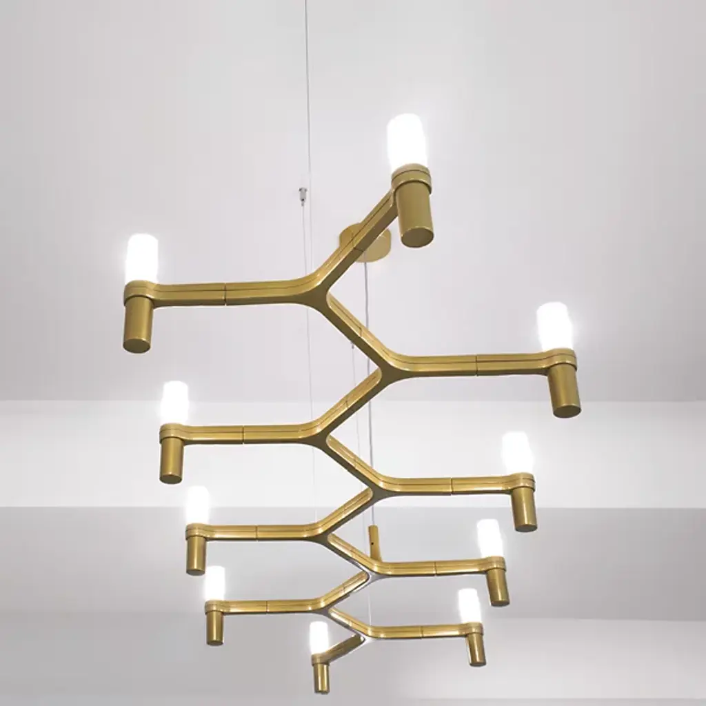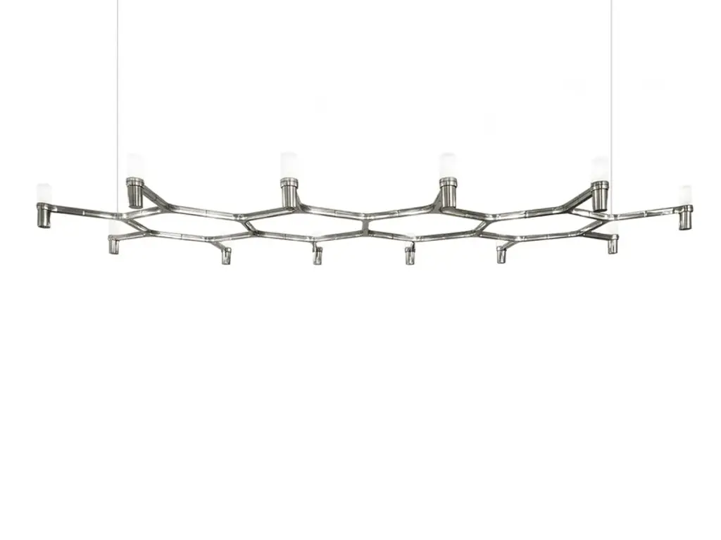 The playful Nemo Crown Plana Linear Suspension by Nemo has a zig-zag, die-cast aluminum body ideal for modern dining or conference rooms. Its minimalist form prominently features 10 sandblasted, opal-white glass diffusers that offer a widespread, yet warm lighting effect. Includes field-cuttable transparent cables for discreet suspension.