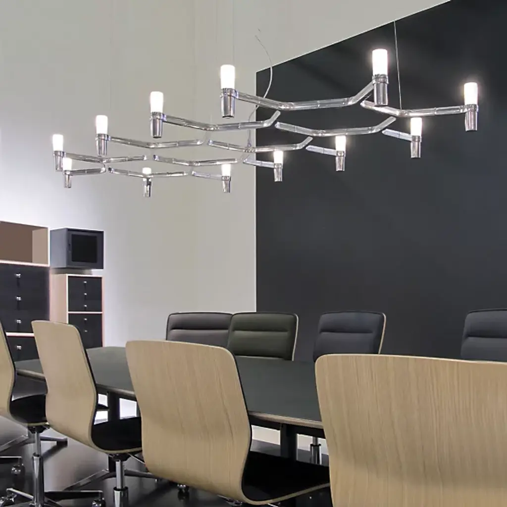 A quartet of hexagonal modules form the Nemo Crown Plana Major Linear Suspension with an ornamental perimeter of diffused light. The geometric lines of the structure connect the points of light like a honeycomb constellation when viewed from below. A modern interpretation of a classic candle chandelier, sandblasted glass diffusers replace dim candle light with widespread illumination.