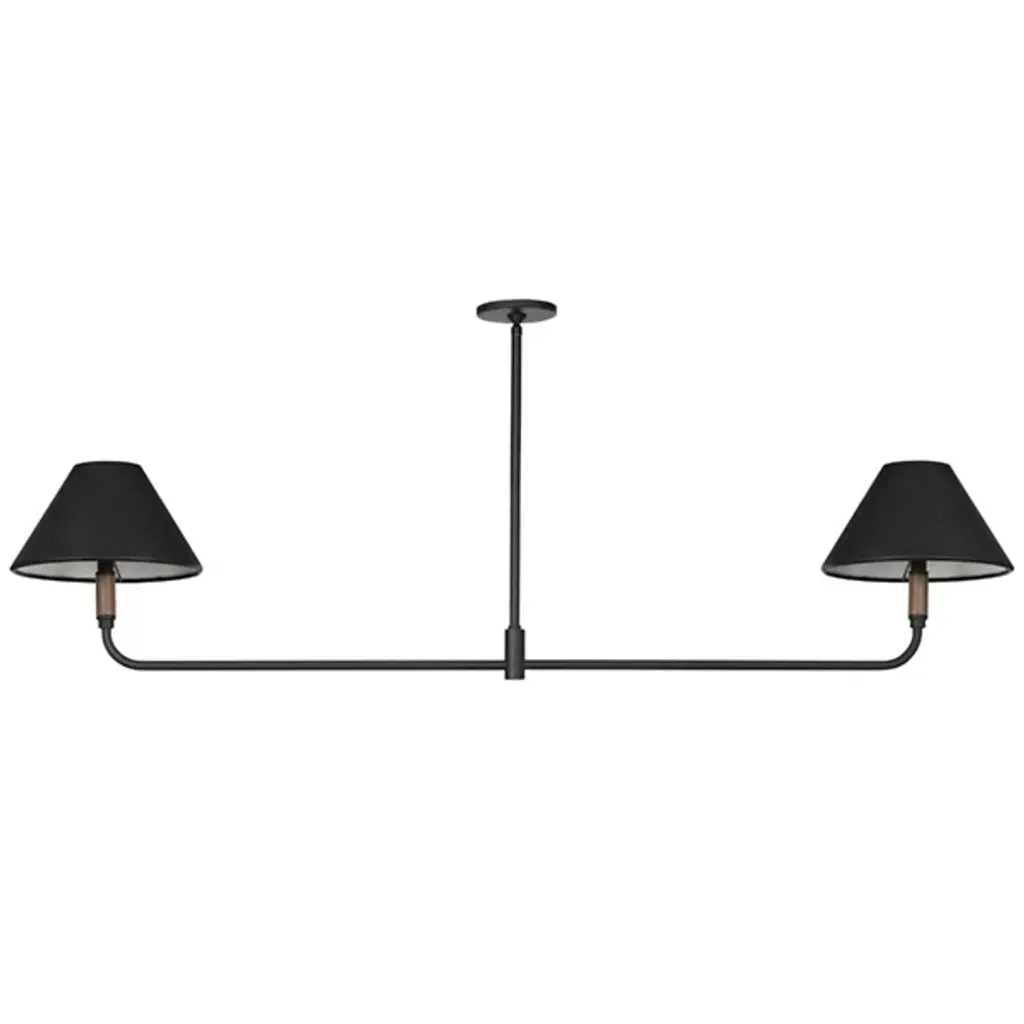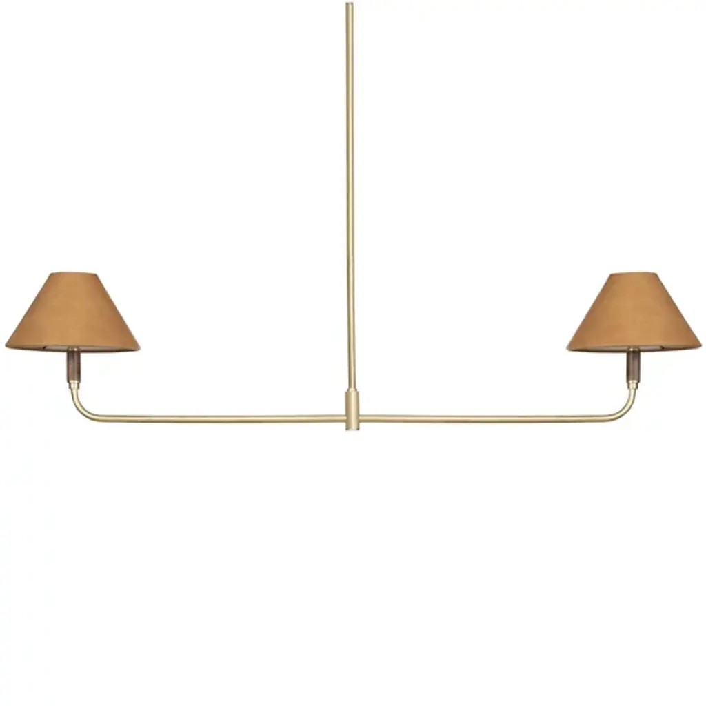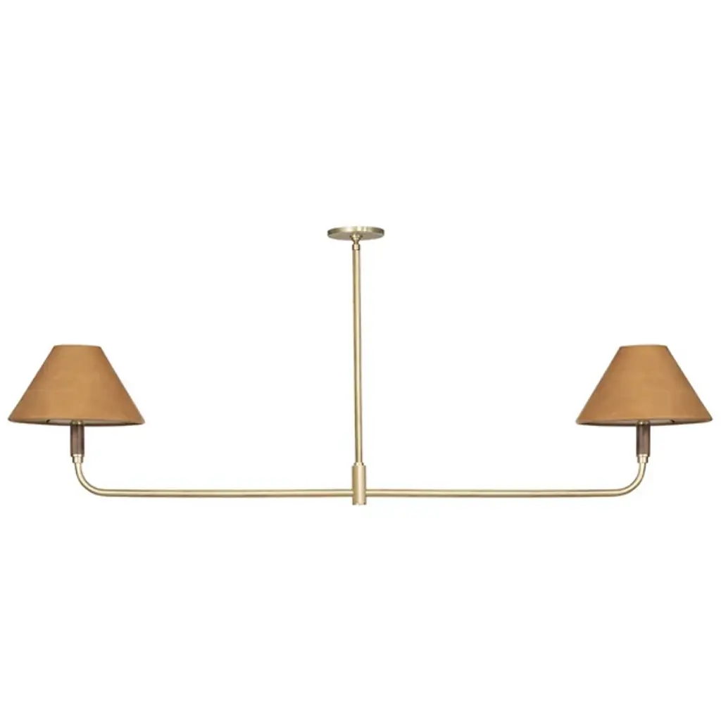 A modern mix of materials creates the midcentury-inspired Cullen Linear Suspension by Four Hands. This light fixture features double pendants. Elegant shades are covered with 100% top-grain leather and topped with a walnut finial. Aged-brass detailing completes the look. With 2 LEDs per single fixture, this furnishment is well-suited for placement above a long dining table.