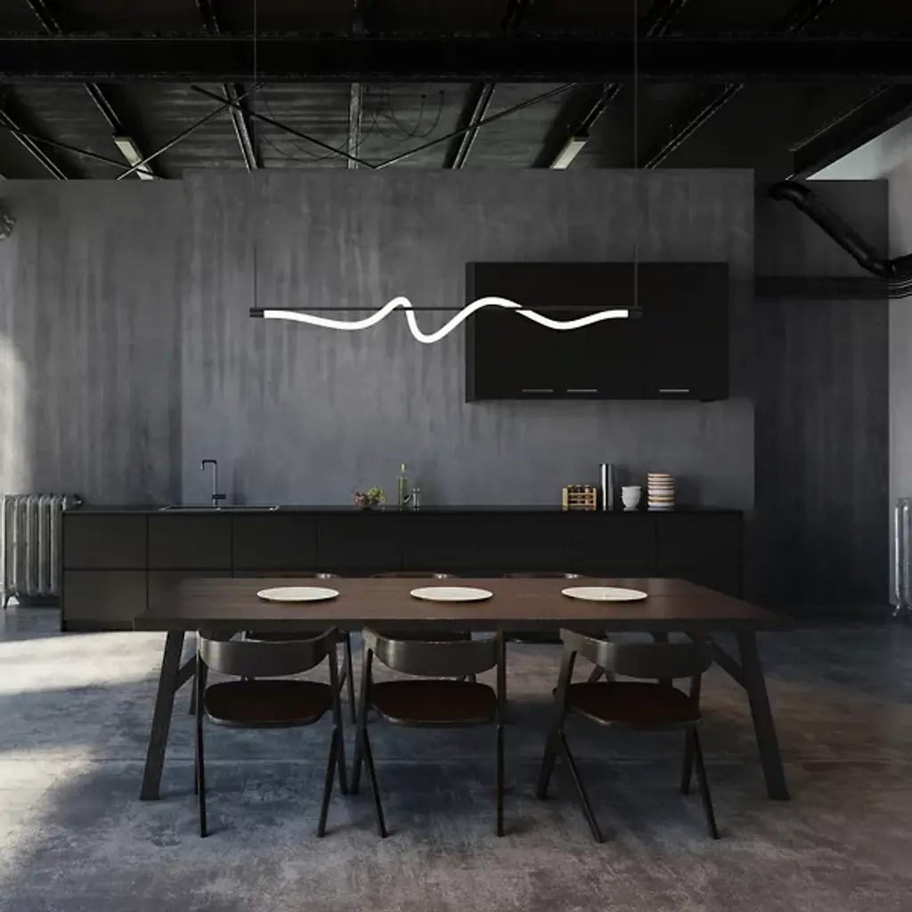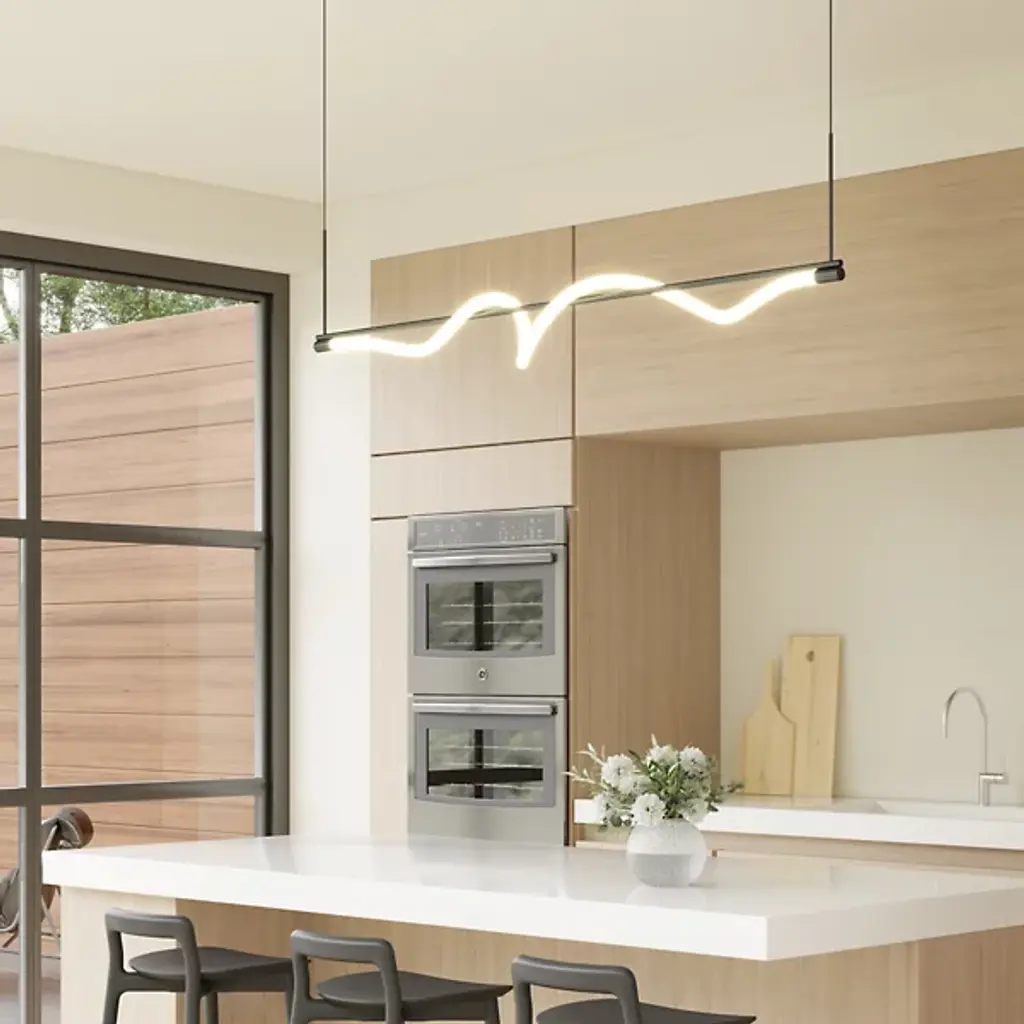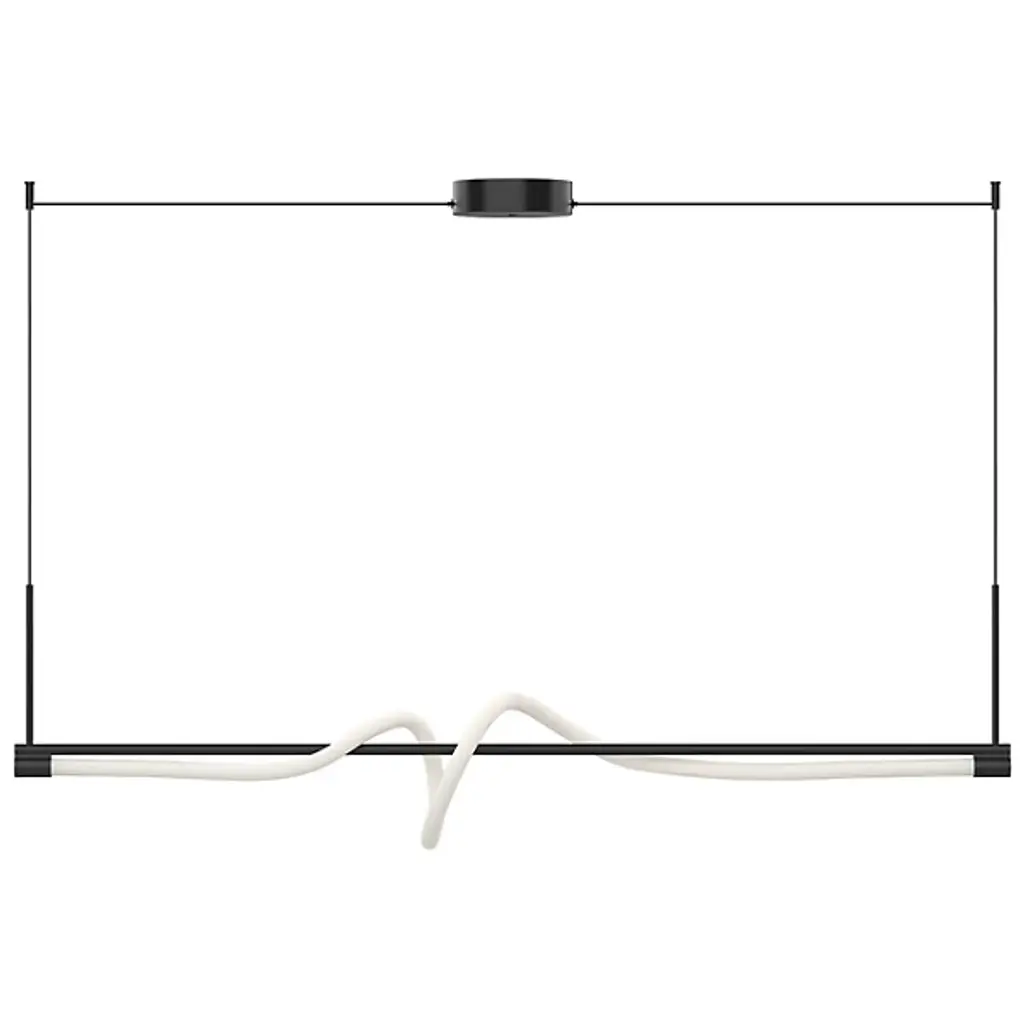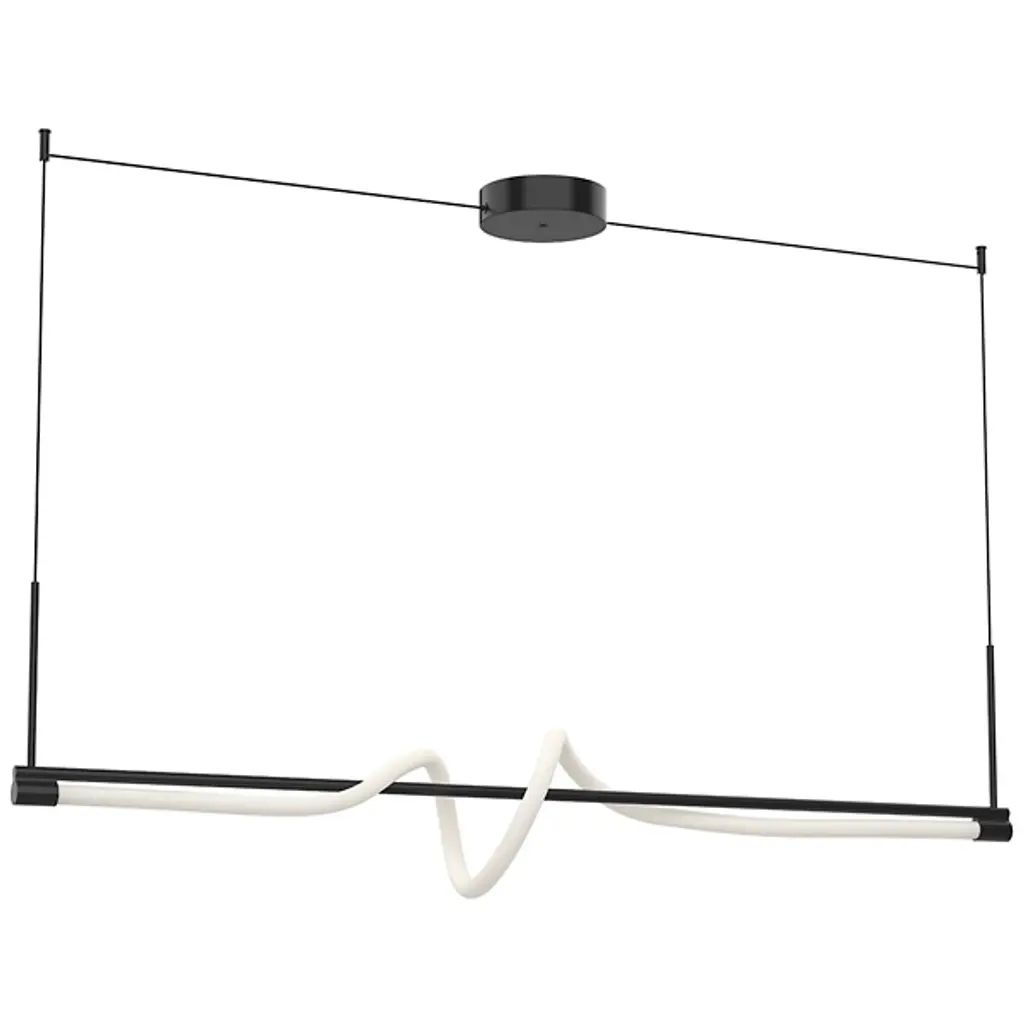 Write a new chapter in indoor illumination with the elegant, open lines of the sculptural Cursive LED Linear Suspension from Kuzco Lighting. The piece is secured by a low-profile disc canopy and slender cords for a tidy look. A supporting aluminum crossbar below adds a touch of contrast to the fluid lamp housing. Brilliant lamping sets inside an acrylic diffuser that mellows bright glare, transmits a warm glow, and creates a seductive silhouette.