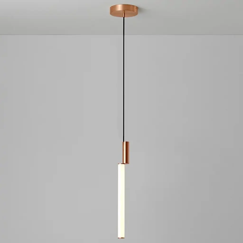 This elegant suspension lamp is part of the Indi-Pendant collection. It was made entirely in copper and comprises a smooth, cylindrical body that also functions as shade. The metal rod that supports the lamp is attached to it through two round elements on each side. Minimalist and sophisticated, this lamp will make a statement in any decor, particularly if contemporary, and can be combined with other pieces from the same series for a more dynamic effect.