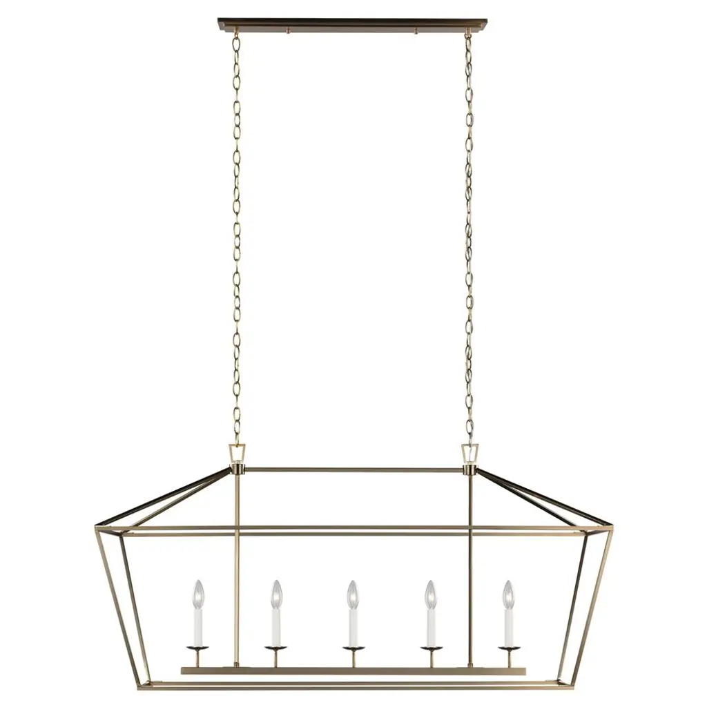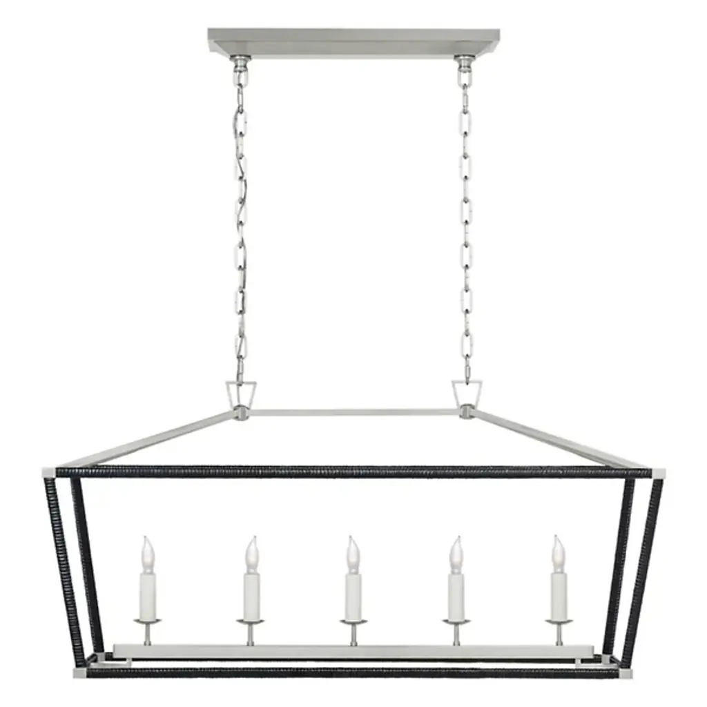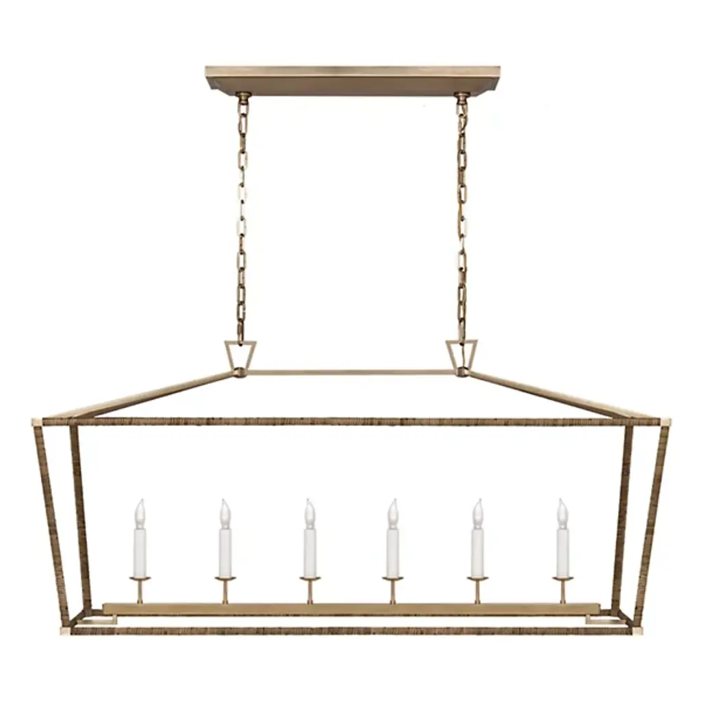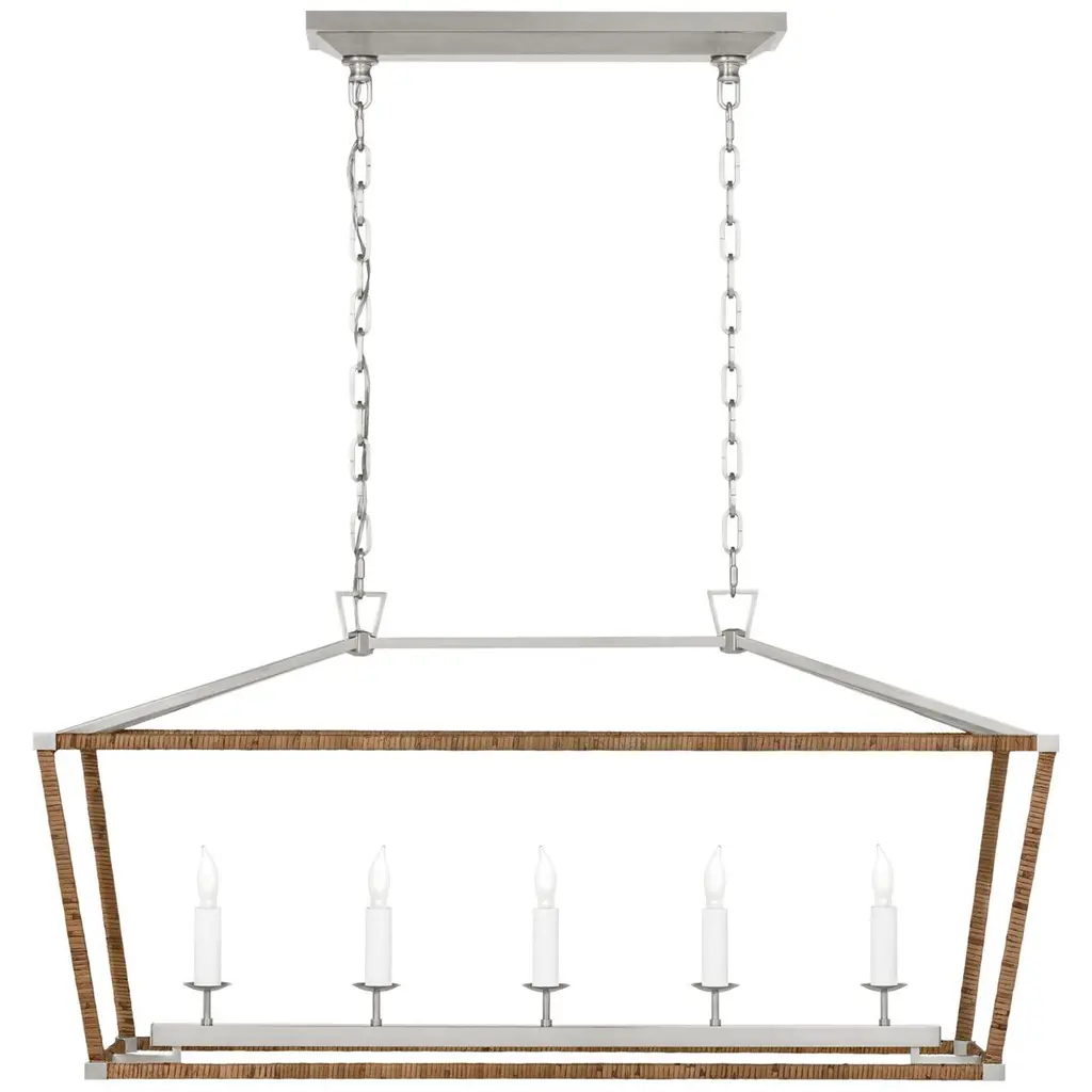Enjoy inspiring, candle-style lighting with the Darlana Wrapped Linear Suspension from Visual Comfort Signature. Designed by the artisanal duo Chapman & Myers, this luxurious piece features a delicate steel frame that creates a graphic silhouette. The eye is drawn to the intricately woven rattan which envelops the framework, adding artisanal charm. Standing atop a slim crossbar, wax candle-inspired holders line up at the center, pairing with pointy bulbs to deliver a wide-reaching glow.