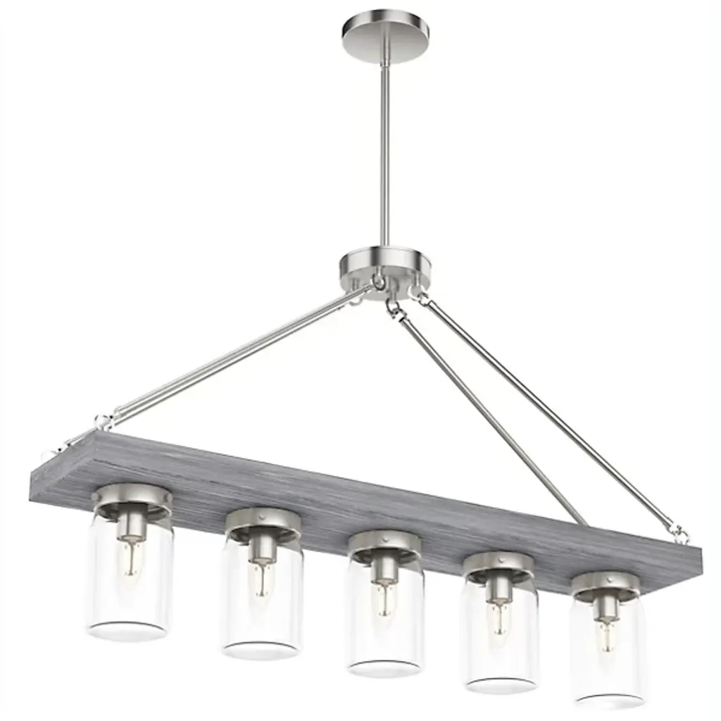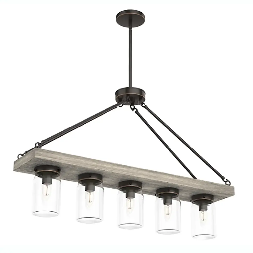The Devon Park Linear Suspension by Hunter Fans brings a warm and rustic touch to the home. A dual canopy suspension supports a series of slender stems that extend toward each corner of a rectangular panel. Clear glass shades reminiscent of old-fashioned mason jars line the bottom of the panel, each one topped with a metal cap and containing a single bulb. A raw, natural wood finish harmonizes with the clean metal to create a chic farmhouse aesthetic that adds instant style to a space.