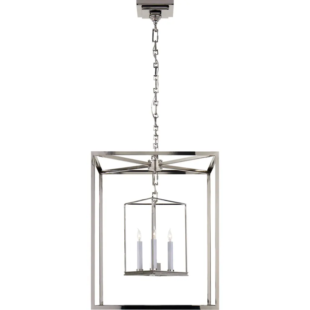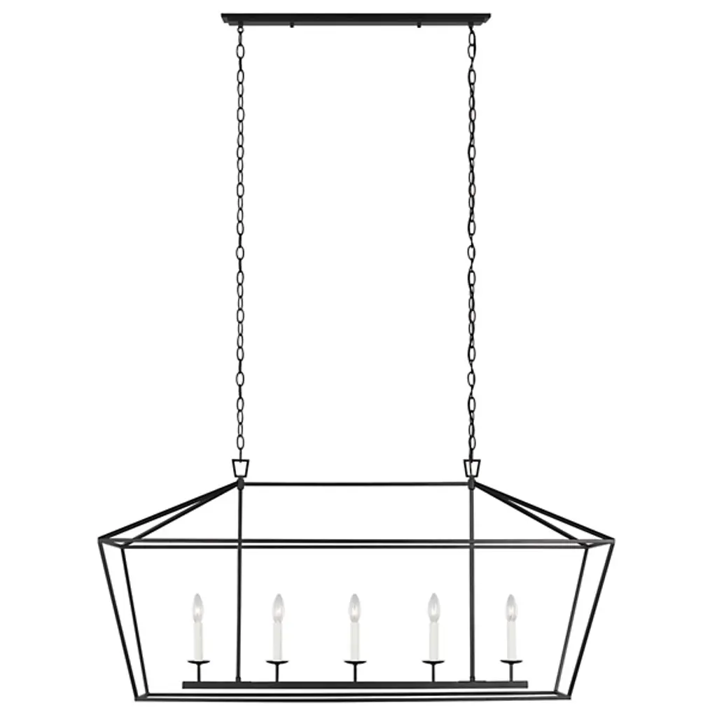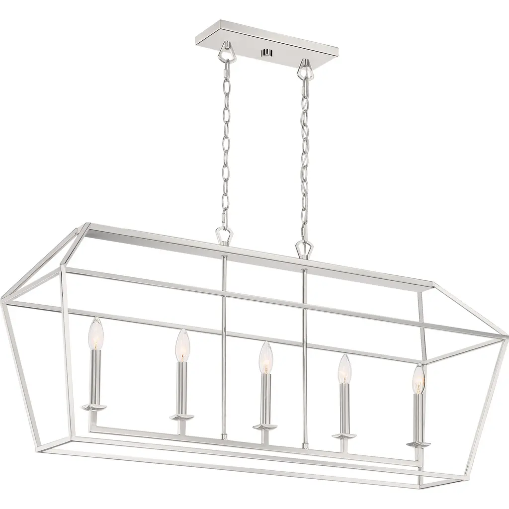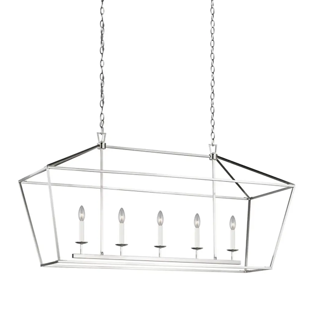 Add an unforgettable accent to your living spaces with the large and in charge Dianna Linear Suspension from Visual Comfort Studio, formerly known as Sea Gull Lighting, A prominent transitional piece descending from a two-tier rectangular canopy using fine, parallel chains that reach down to two finials, it uses two stems to secure a horizontal bar that mounts a set of evenly-spaced candelabra-style lamps along its upper surface. This somewhat stark central element is surrounded by a trapezoidal frame that adds a welcome touch of complexity while leaving the damp-listed lamping bright and unimpeded.