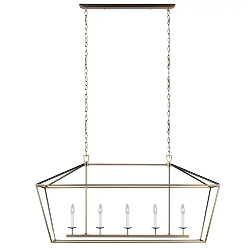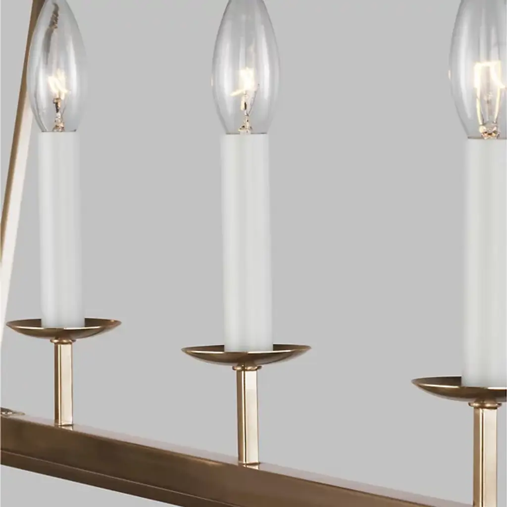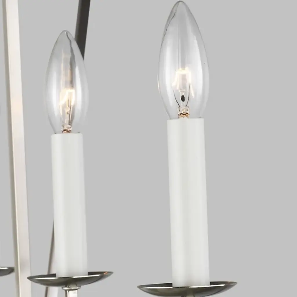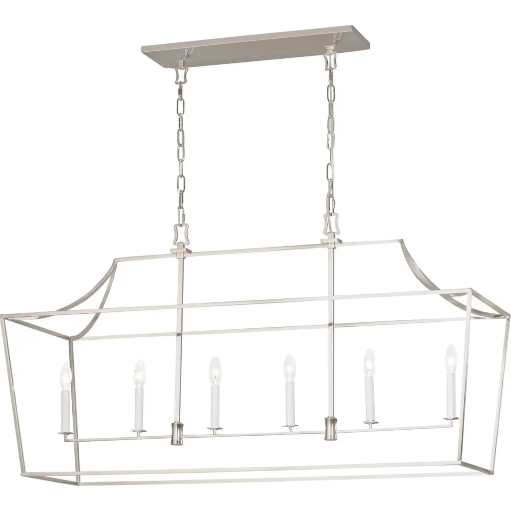 Add an unforgettable accent to your living spaces with the large and in charge Dianna Linear Suspension from Visual Comfort Studio, formerly known as Sea Gull Lighting, A prominent transitional piece descending from a two-tier rectangular canopy using fine, parallel chains that reach down to two finials, it uses two stems to secure a horizontal bar that mounts a set of evenly-spaced candelabra-style lamps along its upper surface. This somewhat stark central element is surrounded by a trapezoidal frame that adds a welcome touch of complexity while leaving the damp-listed lamping bright and unimpeded.