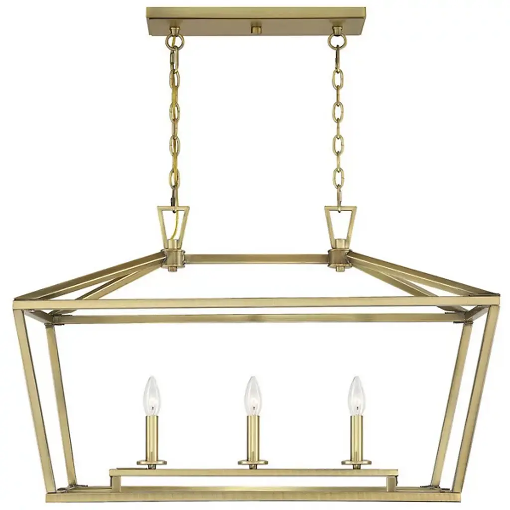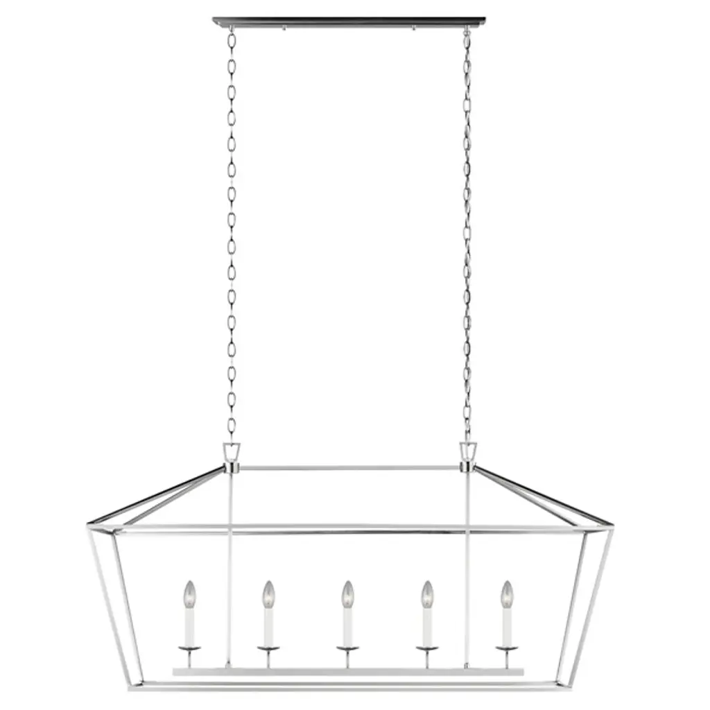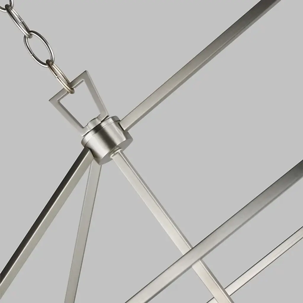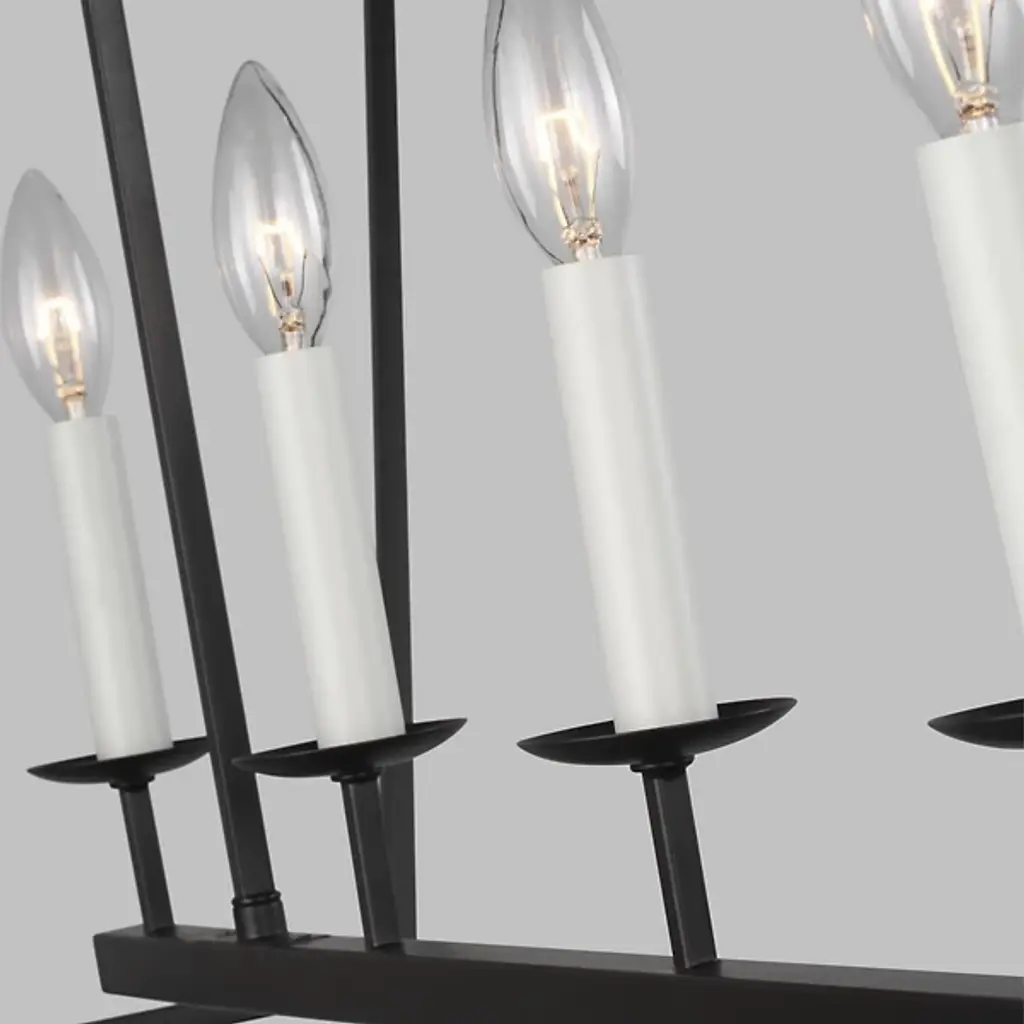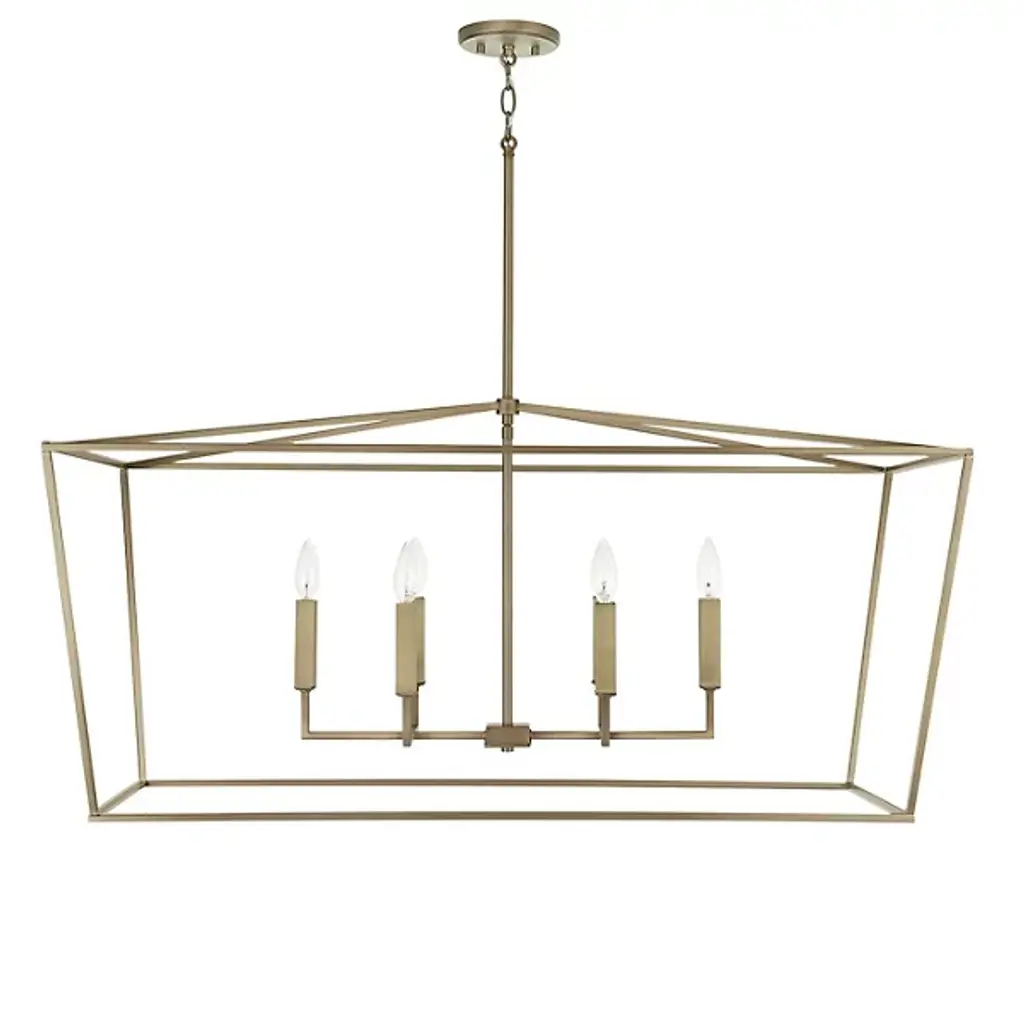 Add an unforgettable accent to your living spaces with the large and in charge Dianna Linear Suspension from Visual Comfort Studio, formerly known as Sea Gull Lighting, A prominent transitional piece descending from a two-tier rectangular canopy using fine, parallel chains that reach down to two finials, it uses two stems to secure a horizontal bar that mounts a set of evenly-spaced candelabra-style lamps along its upper surface. This somewhat stark central element is surrounded by a trapezoidal frame that adds a welcome touch of complexity while leaving the damp-listed lamping bright and unimpeded.