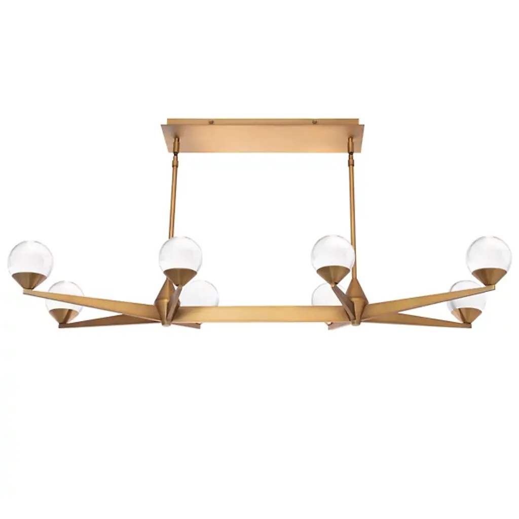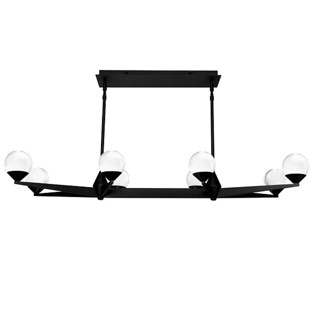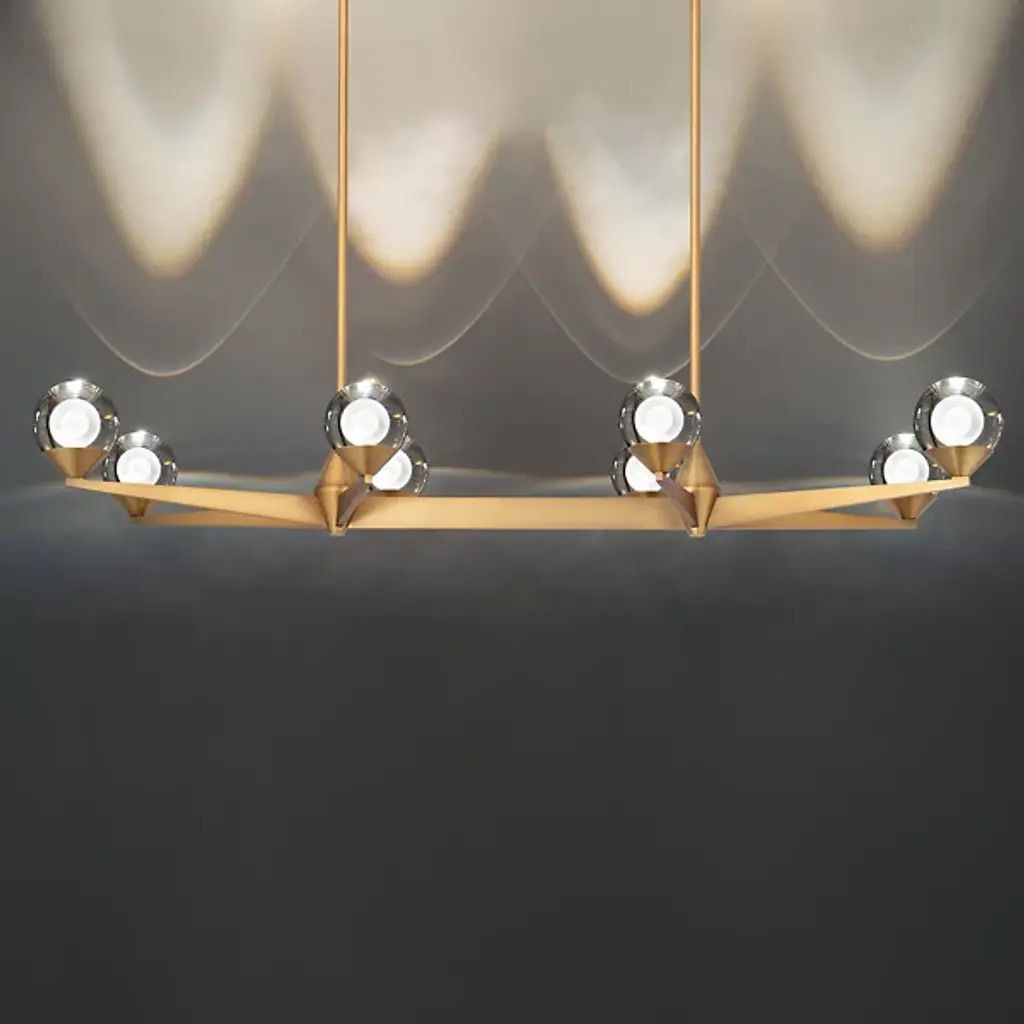 Add daring decadence to large, open interiors with the arresting angular stylings of the Double Bubble LED Linear Suspension from Modern Forms. An engaging salute to retro design, it puts current technology on full display, using a stepped rectangle canopy and twin downrods to support an expansive array of angular arms below. Each arm supports an upward-facing LED lamp blooming from a conical metal housing, the laser-etched glass contrasting its translucent texture with the clean metal around it, transmitting a generous glow of light evenly around the fixture.