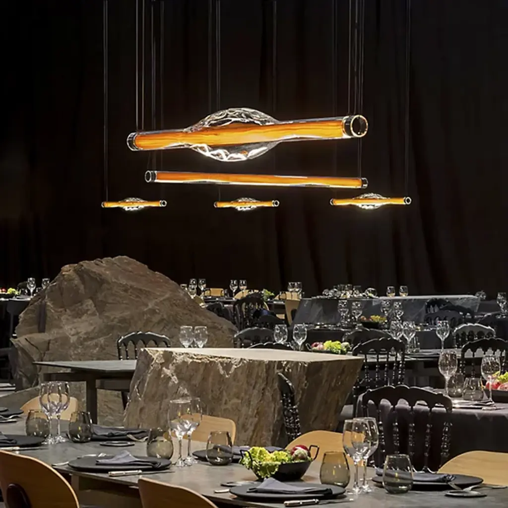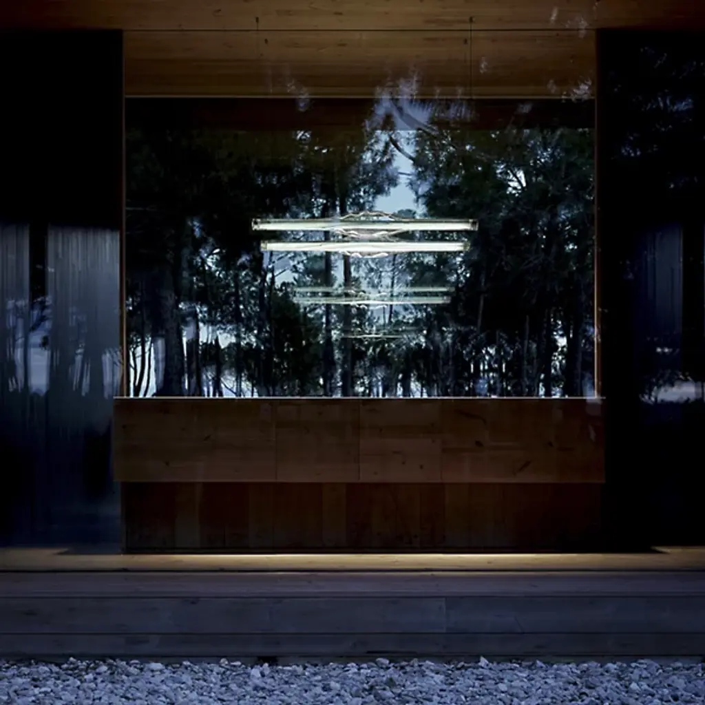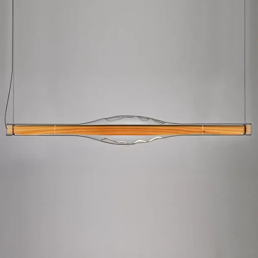 Interior Design's Best of Year Winner in the pendant lighting category, the Dune LED Linear Suspension by LZF is an expressive combination of beautiful wood veneer and handblown glass layered together. Created by the multidisciplinary, Madrid-based Mayice Studio, the silhouette of this piece reflects its name as a sculptural and textured glass shade surrounds a natural wood veneer shade. Focused on product design and architecture, this design studio has made a piece that transforms when illuminated, revealing the variations found within wooden veneers and playing with the way light travels along concave and convex glass forms.