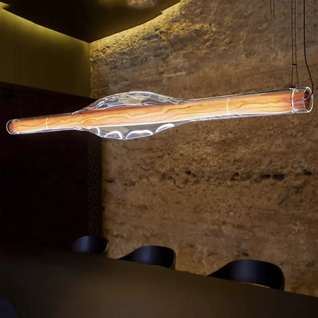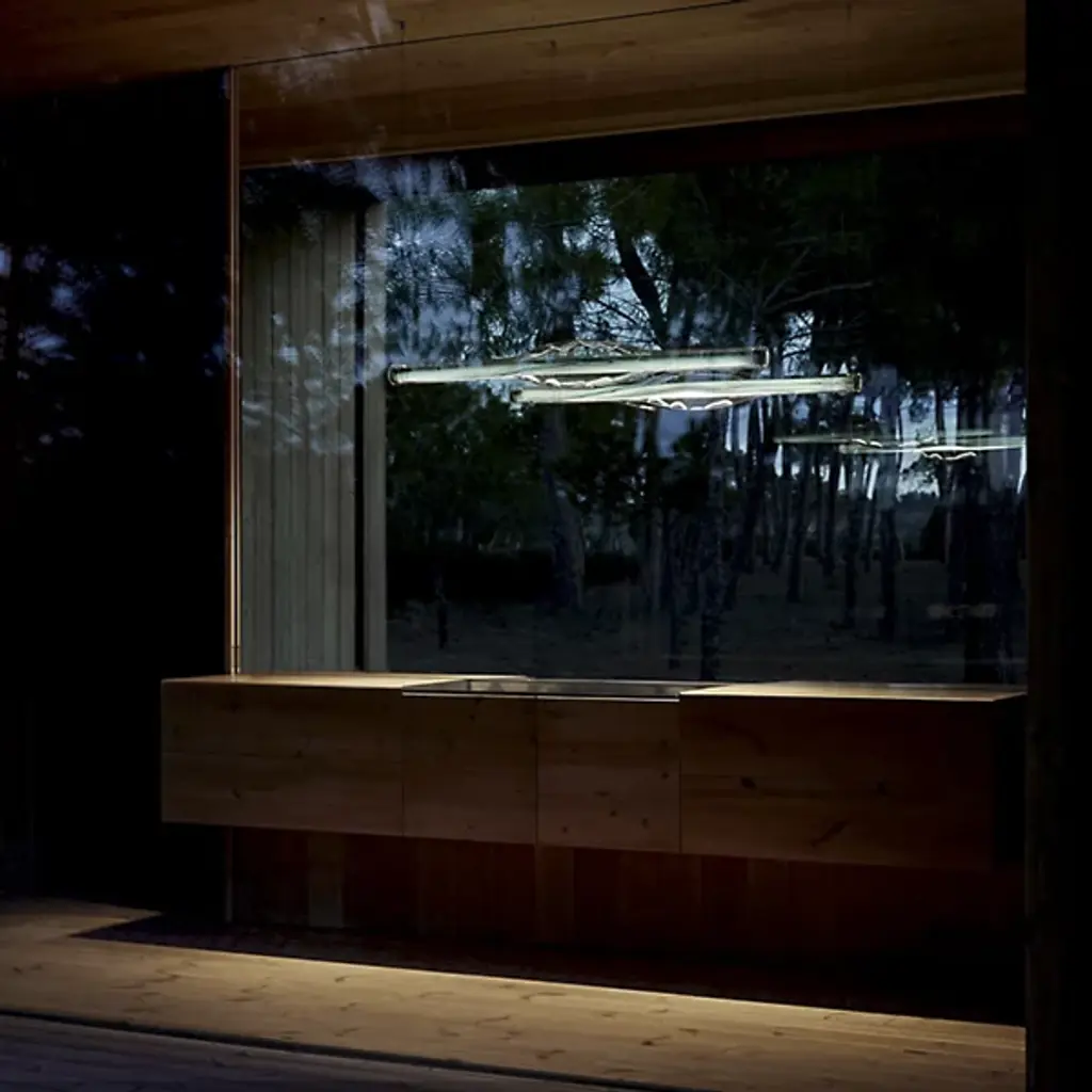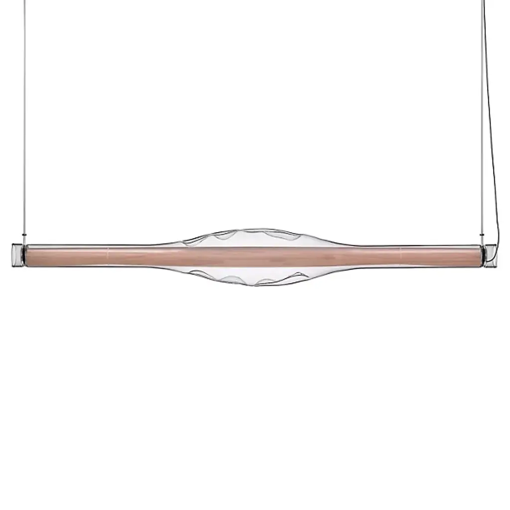 Interior Design's Best of Year Winner in the pendant lighting category, the Dune LED Linear Suspension by LZF is an expressive combination of beautiful wood veneer and handblown glass layered together. Created by the multidisciplinary, Madrid-based Mayice Studio, the silhouette of this piece reflects its name as a sculptural and textured glass shade surrounds a natural wood veneer shade. Focused on product design and architecture, this design studio has made a piece that transforms when illuminated, revealing the variations found within wooden veneers and playing with the way light travels along concave and convex glass forms.