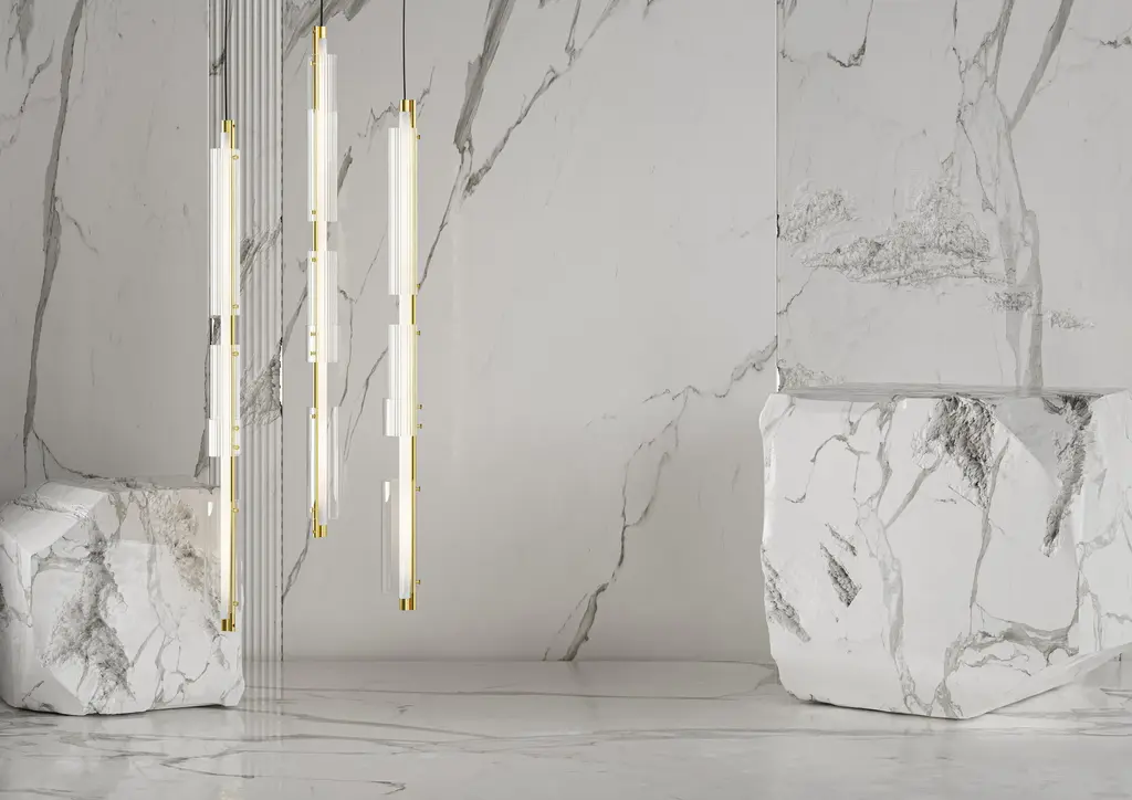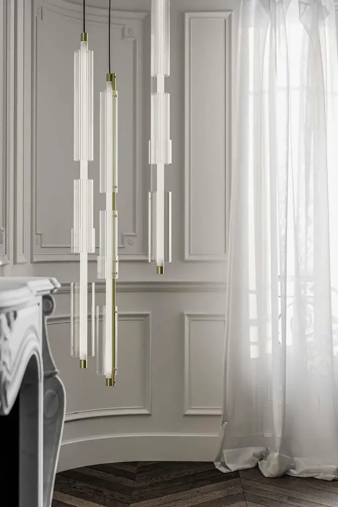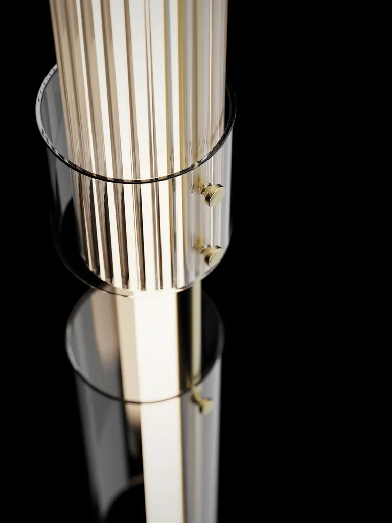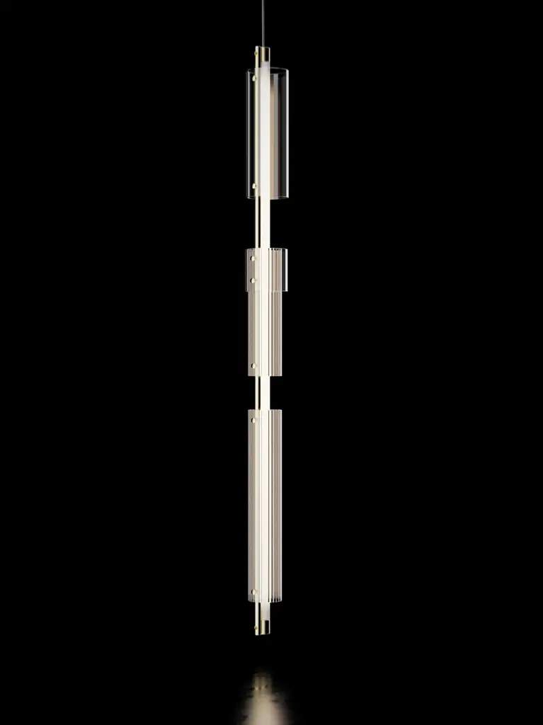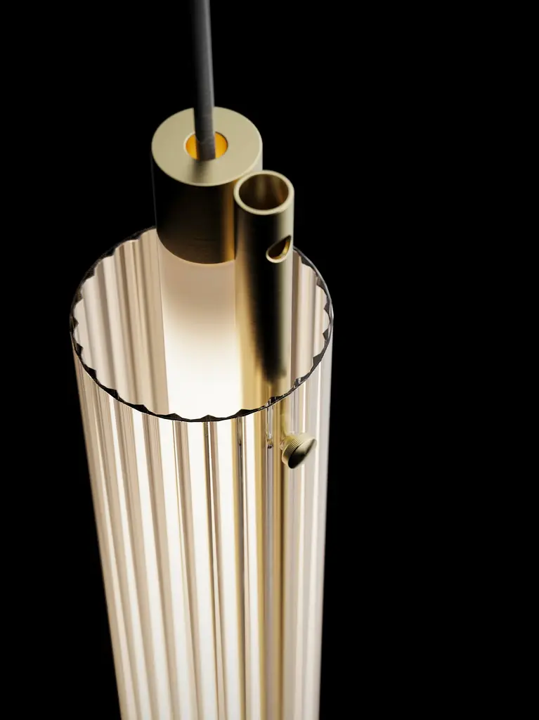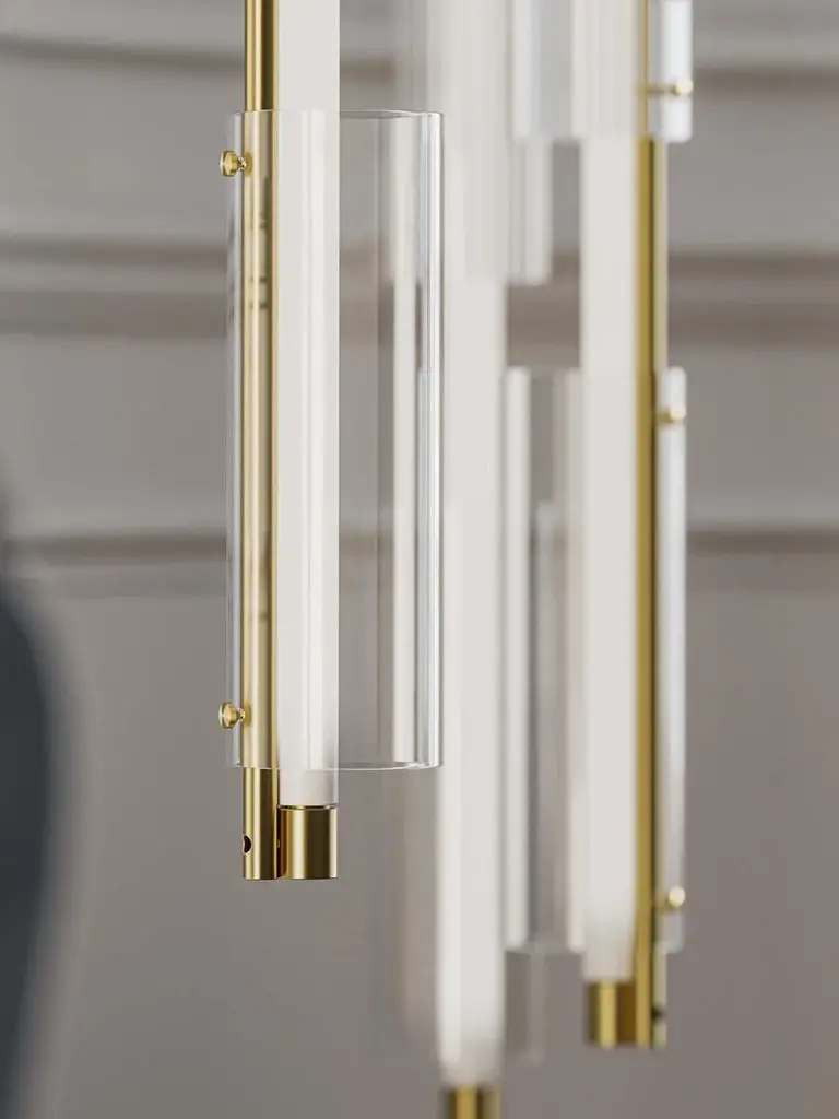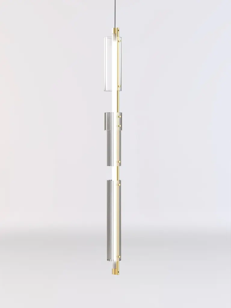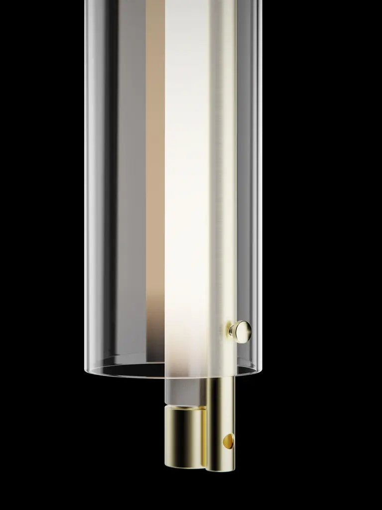 Ceiling lamp with brushed brass structure, frosted light tube and glass rings. European Plug (up to 250V).