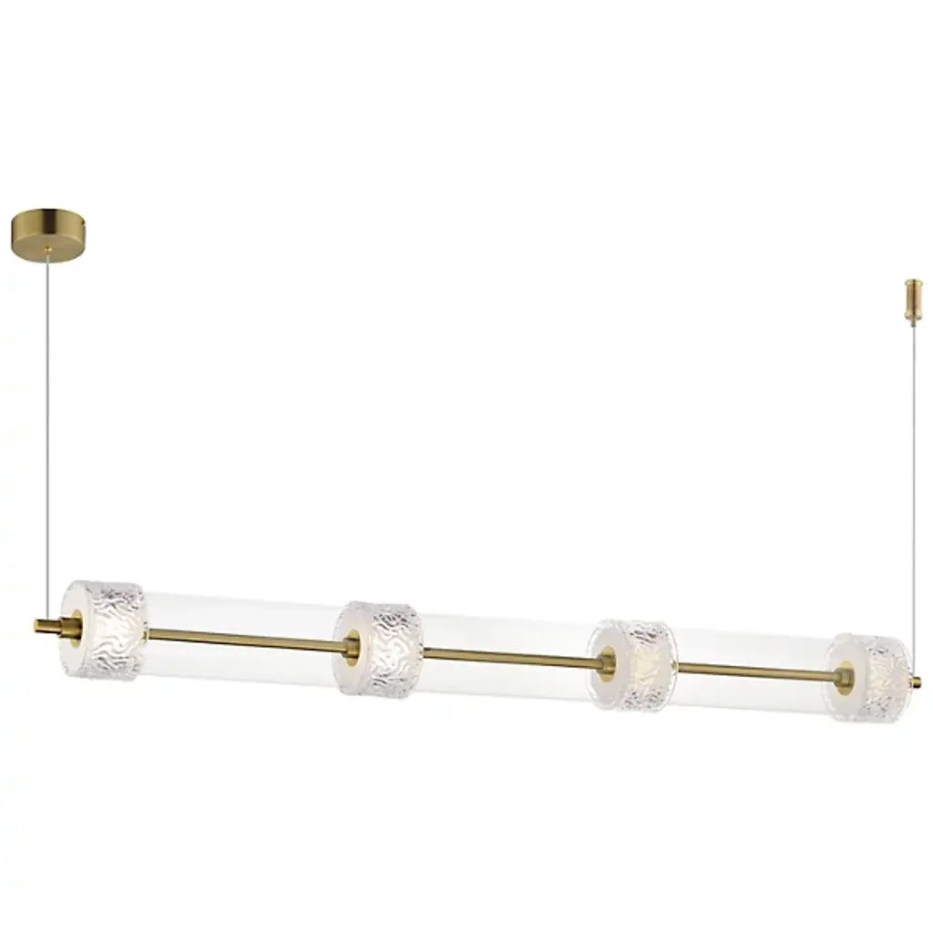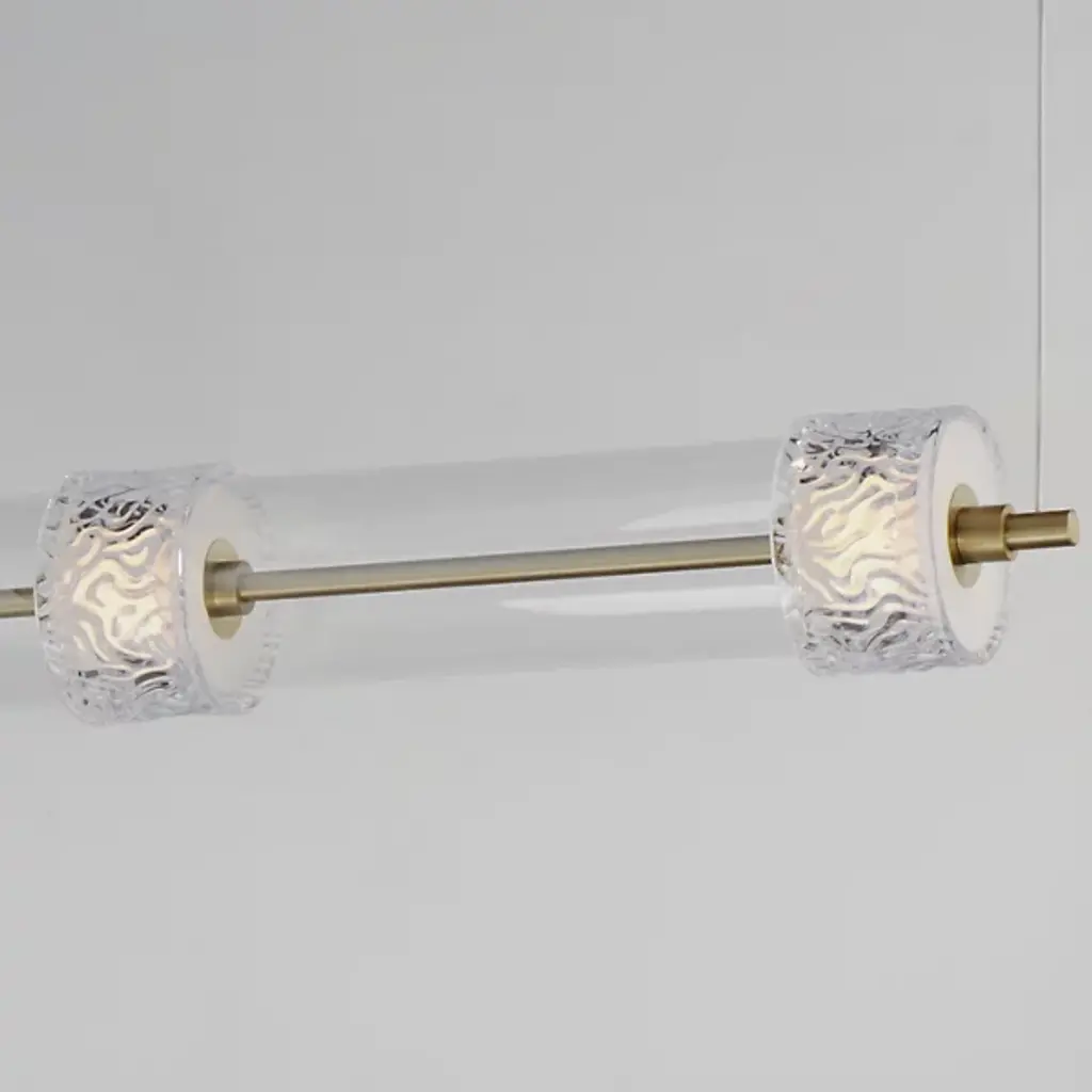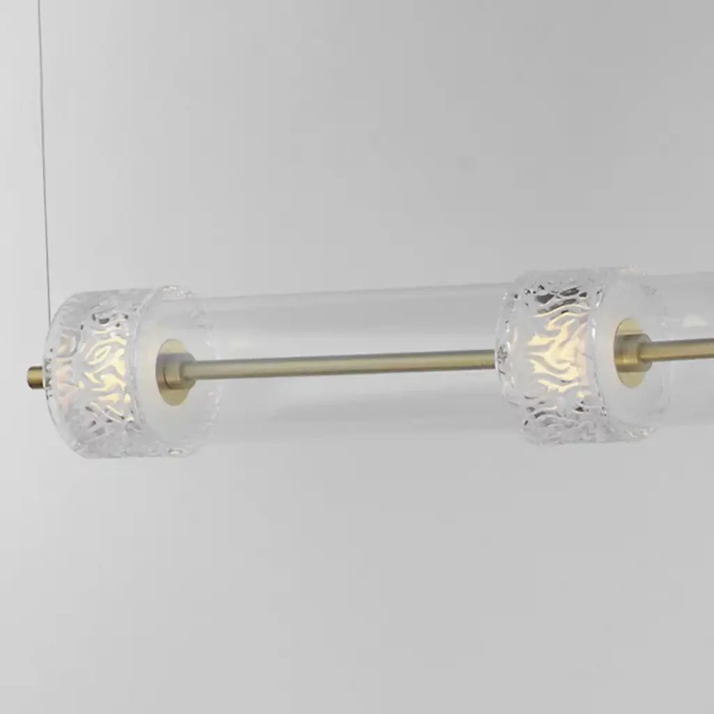 The Elysian LED Linear Suspension from ET2 Lighting orchestrates a symphony of light and glass above your space. This horizontal masterpiece features a procession of clear glass cylinders interspersed with exquisitely rippled crystal fonts. The elongated design makes a bold statement, perfect for adorning dining tables or kitchen islands. Integrated LED illumination breathes life into each glass element. This linear suspension embodies the perfect fusion of artistry and illumination.