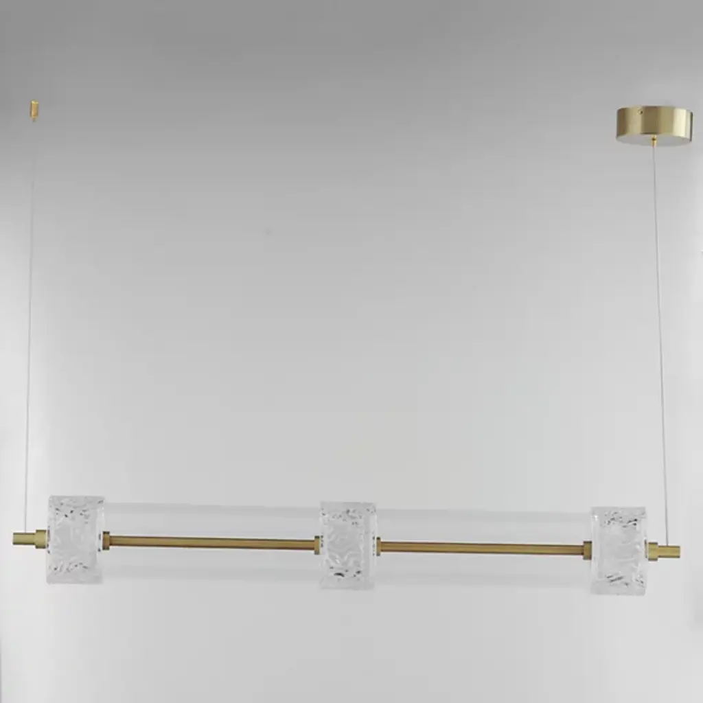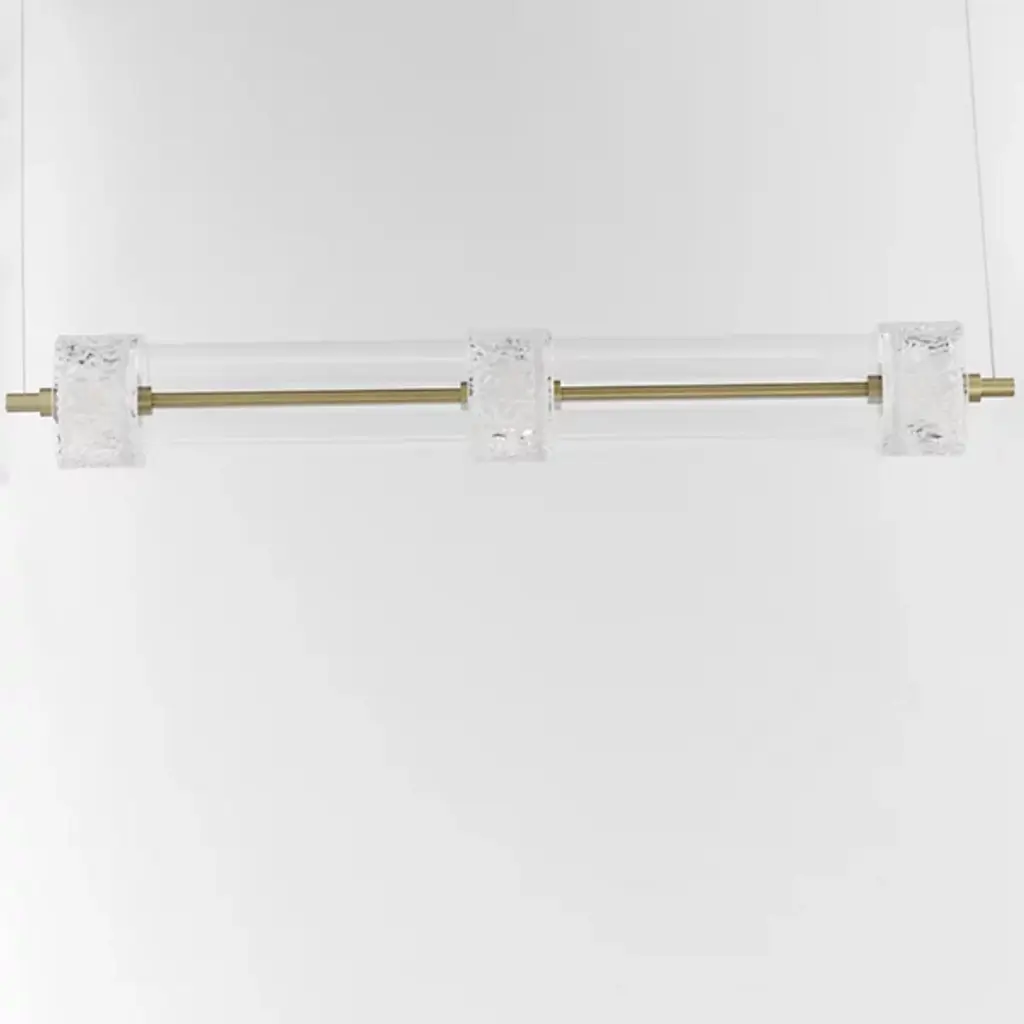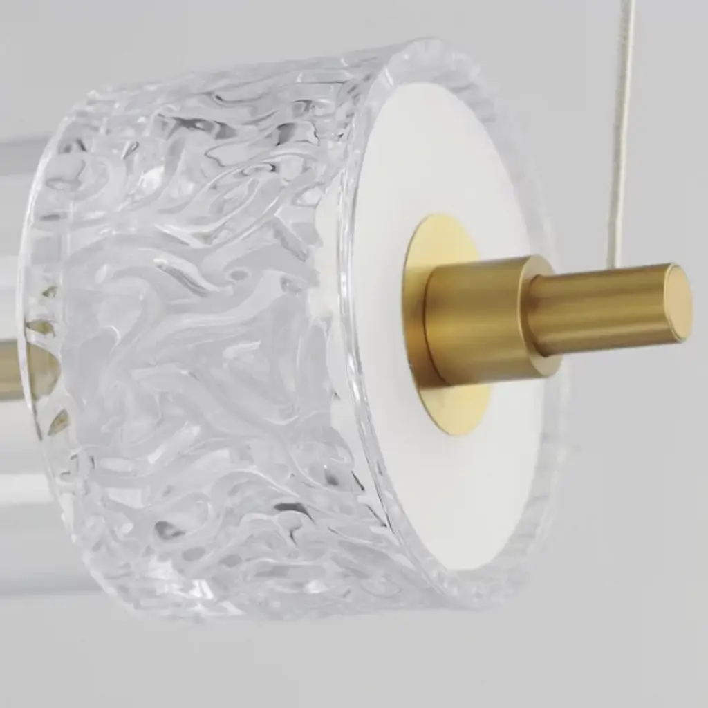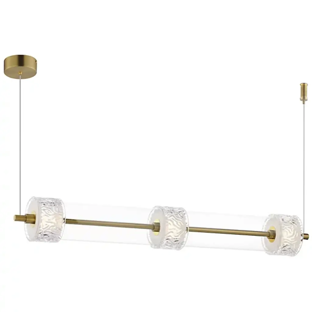 The Elysian LED Linear Suspension from ET2 Lighting orchestrates a symphony of light and glass above your space. This horizontal masterpiece features a procession of clear glass cylinders interspersed with exquisitely rippled crystal fonts. The elongated design makes a bold statement, perfect for adorning dining tables or kitchen islands. Integrated LED illumination breathes life into each glass element. This linear suspension embodies the perfect fusion of artistry and illumination.