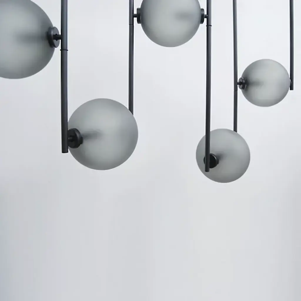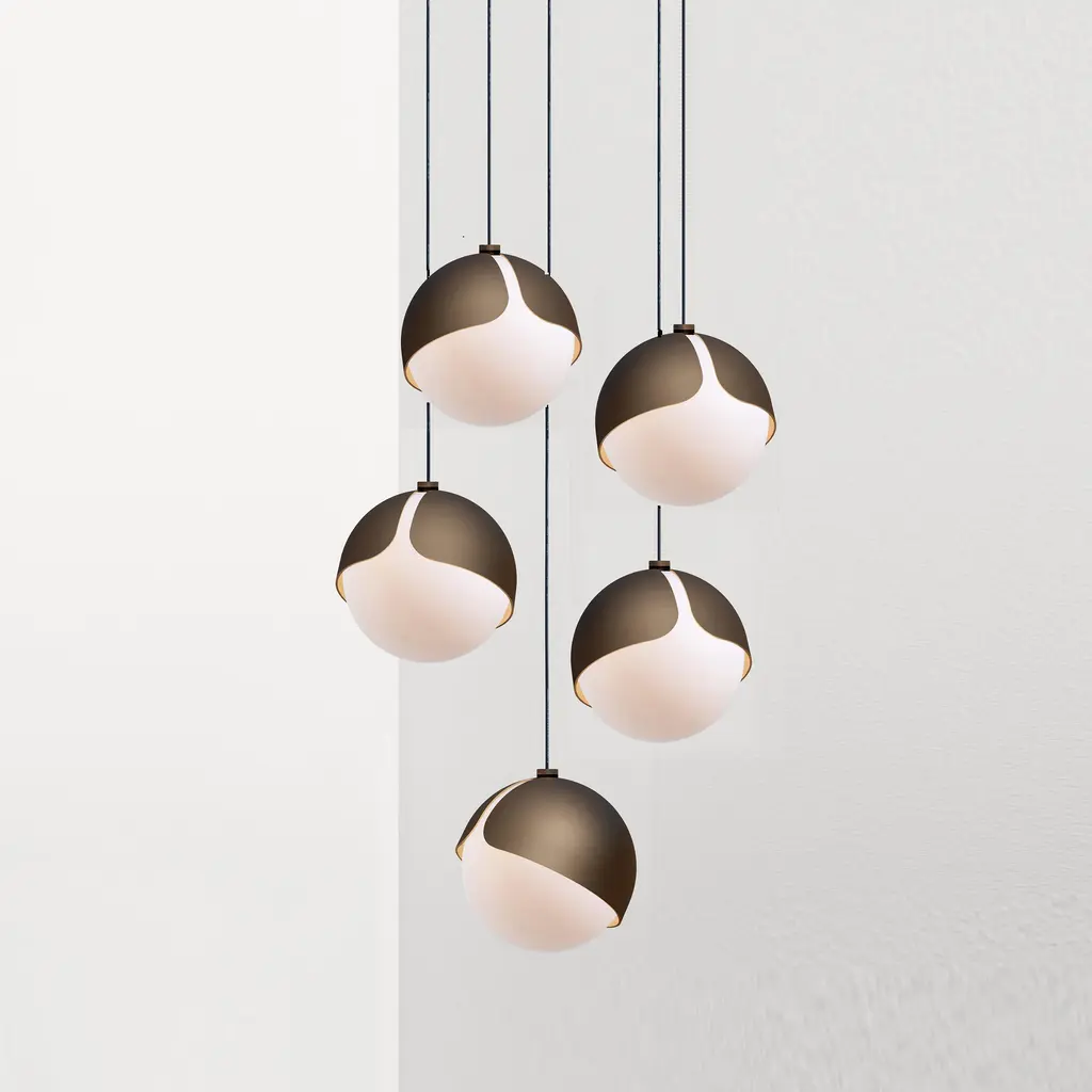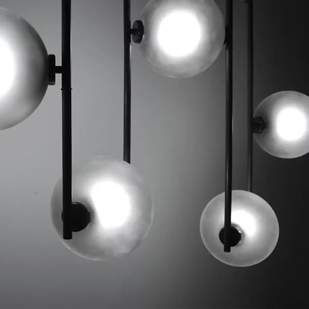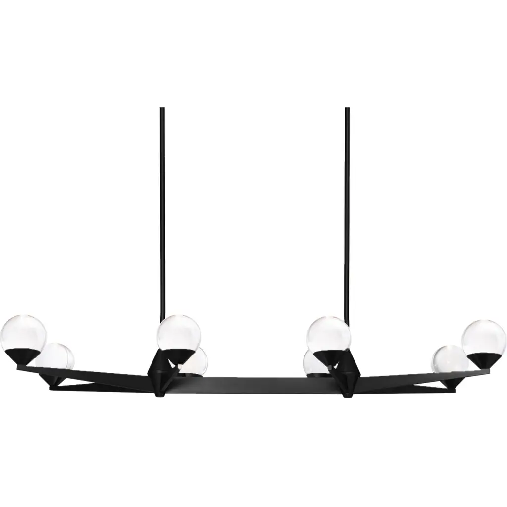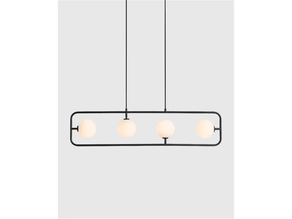 The Equalizer 5 Piece Linear Suspension from Ladies and Gentlemen Studio adds eloquent, expressive appeal to inside spaces with bespoke material and bold lines. A simple, classic design that draws its inspiration from room dividers, it descends via parallel stems from a rectangular canopy of clean-surfaced aluminum. Small, strong lamps stretch between the stems, each one enclosed by a globe-shaped shade of glass created by artist John Hogan, surfaced with a lustrous finish that shifts expressively when its illumination shifts.