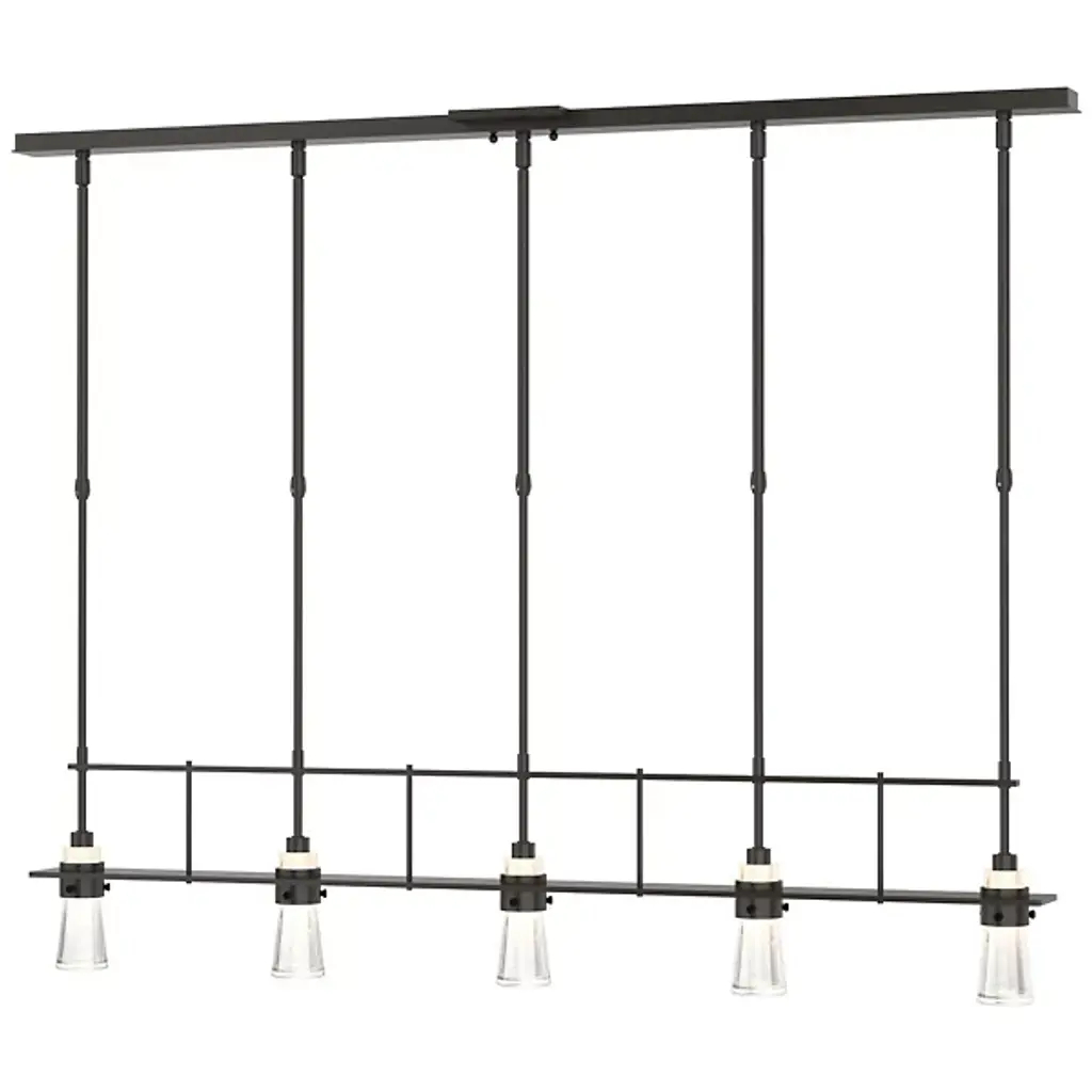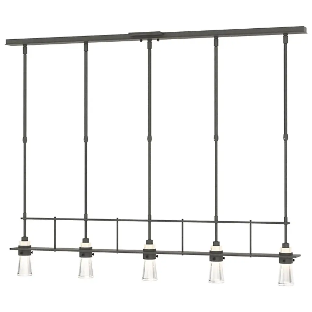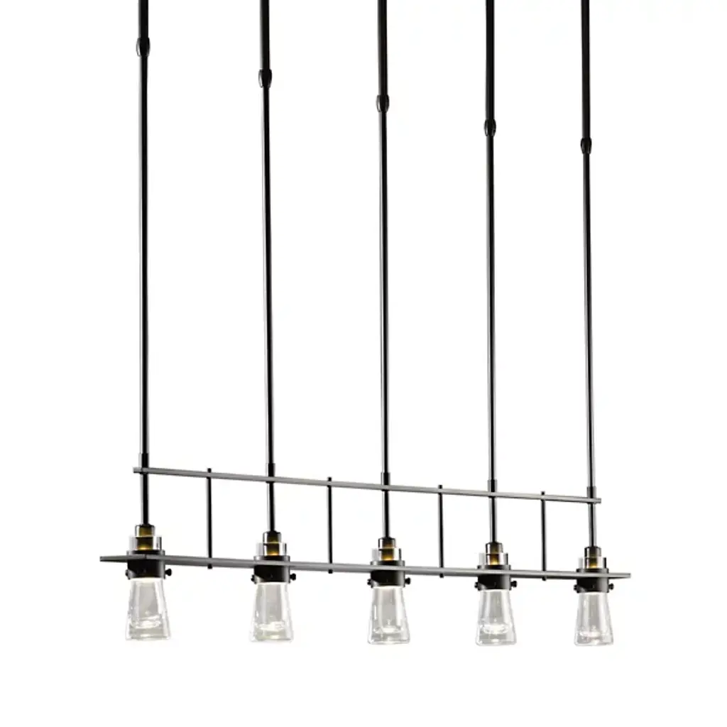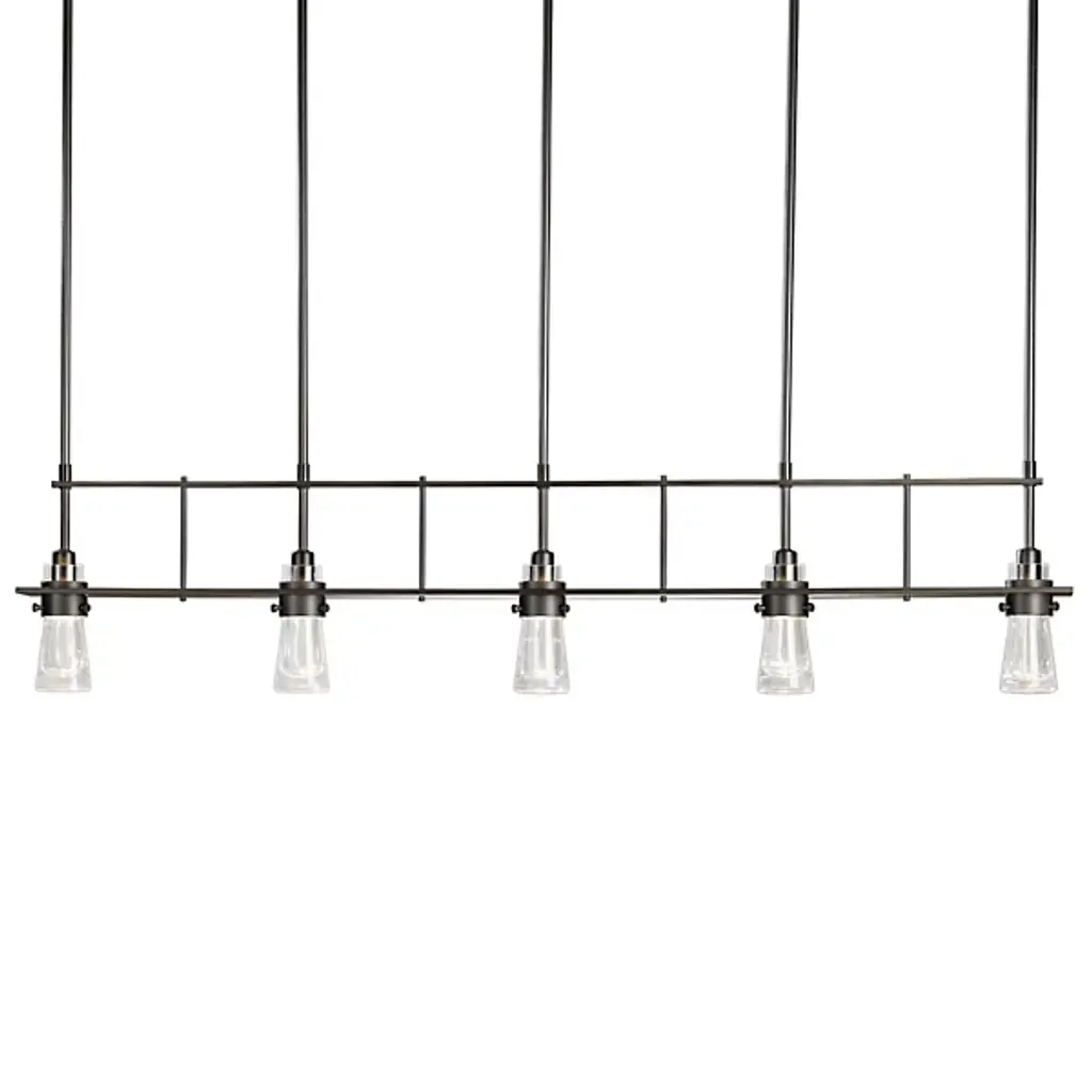 Named after the Erlenmeyer flask used in lab settings, the Hubbardton Forge Erlenmeyer Linear Suspension resembles four beakers in a linear formation highlighted with metal hardware. Full of straight lines and right angles, the round blown glass shades add an interesting juxtaposition of shapes. The exposed bulbs gives the piece an industrial feel, while still being transitional in nature.