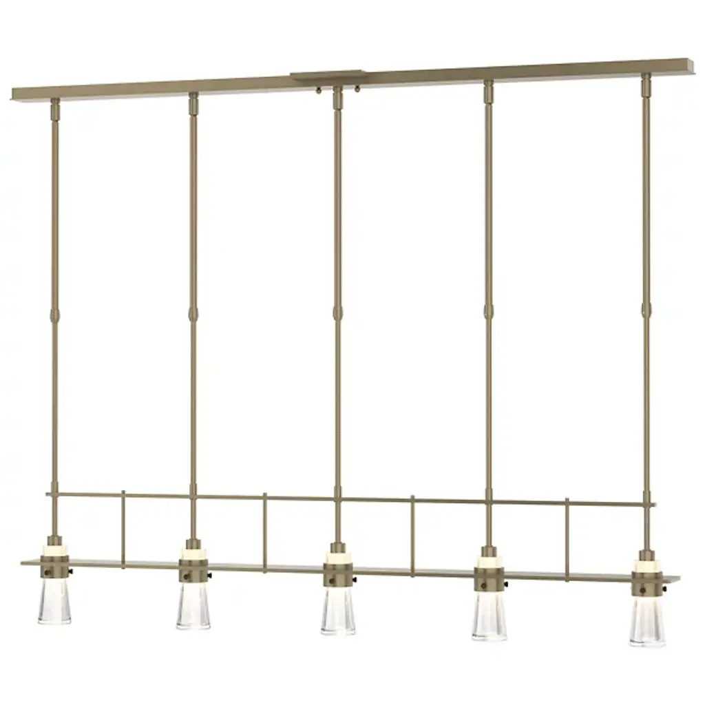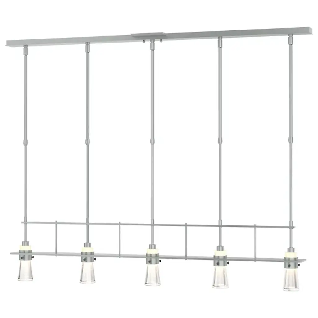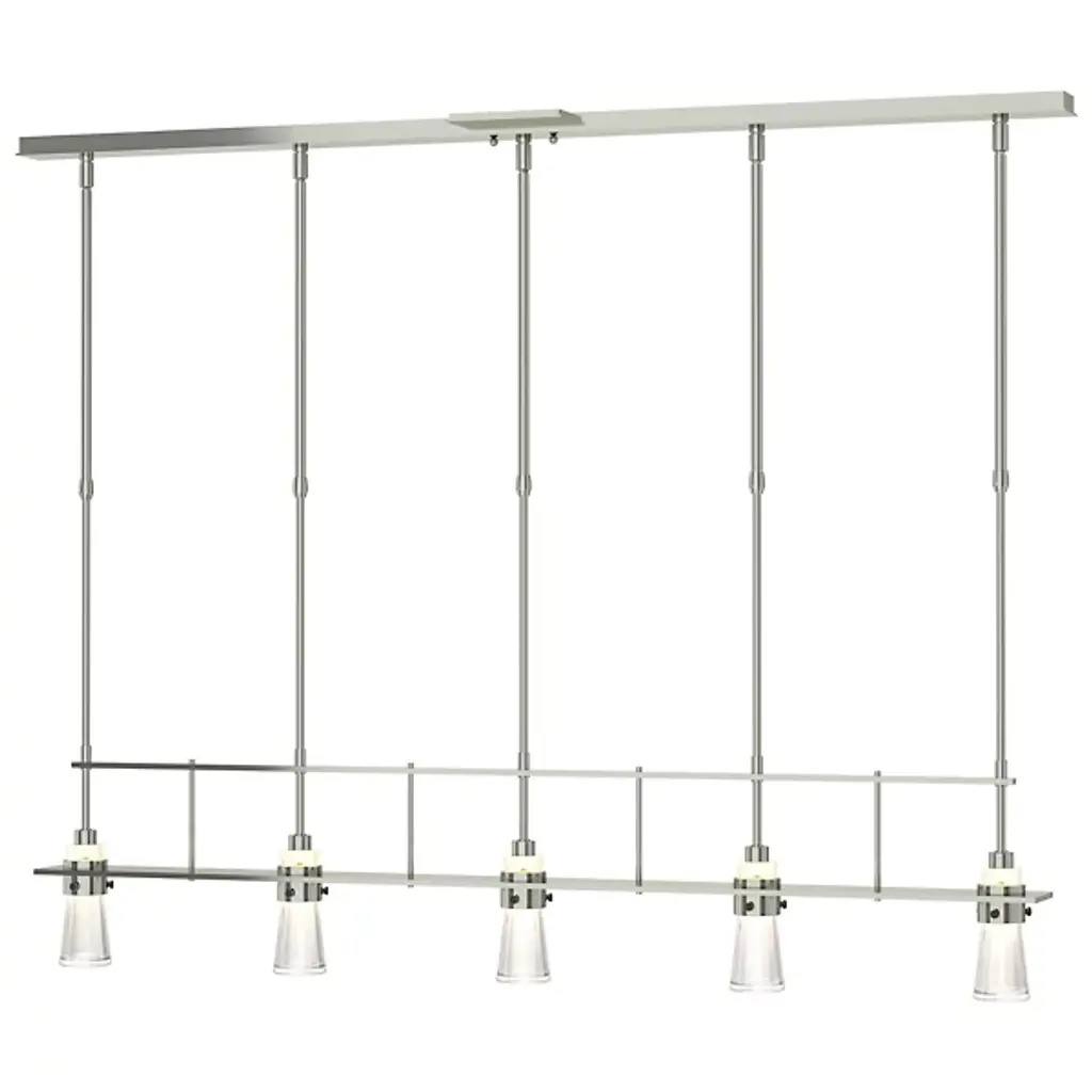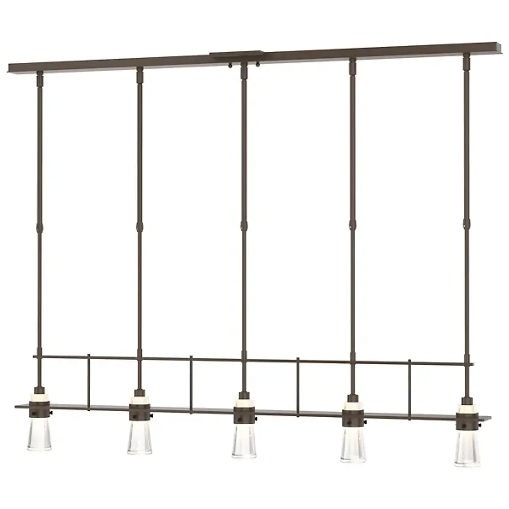 Named after the Erlenmeyer flask used in lab settings, the Hubbardton Forge Erlenmeyer Linear Suspension resembles four beakers in a linear formation highlighted with metal hardware. Full of straight lines and right angles, the round blown glass shades add an interesting juxtaposition of shapes. The exposed bulbs gives the piece an industrial feel, while still being transitional in nature.