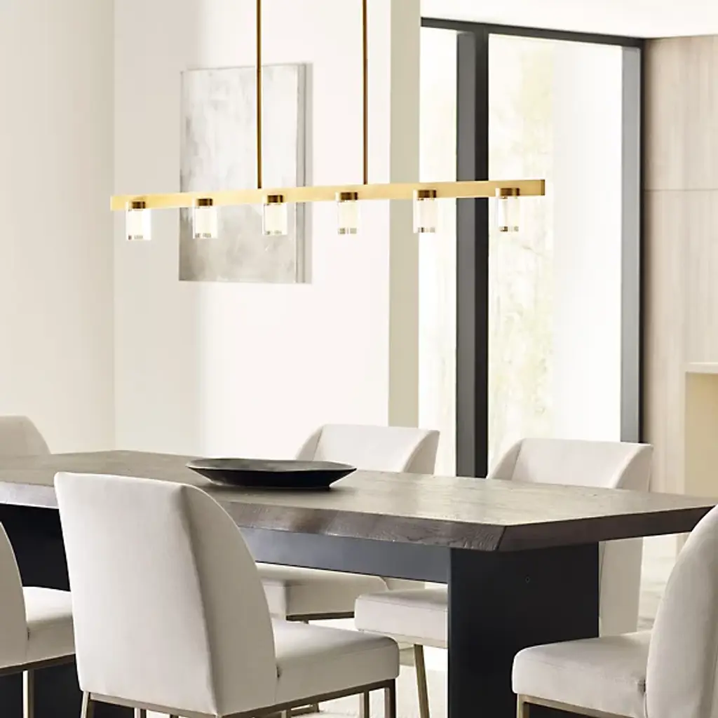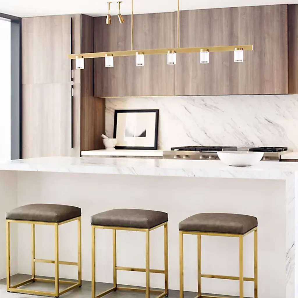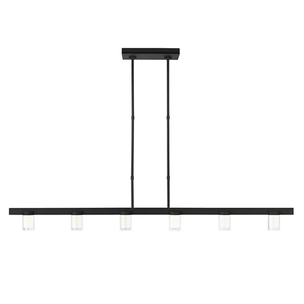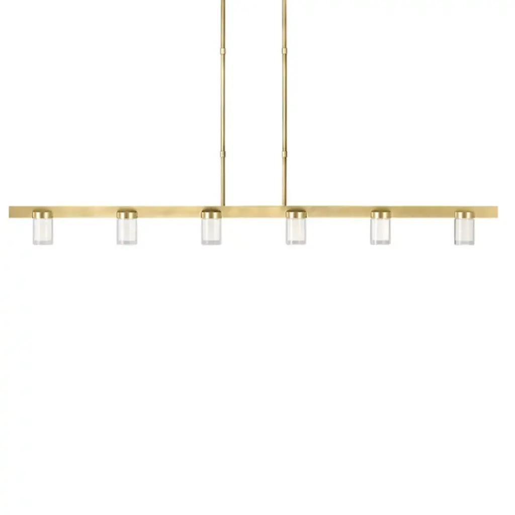 Give the dining table or kitchen island an airy, elegant, and expansive element with the Esfera LED Large Linear Suspension from Kelly Wearstler for Visual Comfort Modern, formerly known as Tech Lighting, The open fixture suspends via a sleek rectangular bar canopy sending down parallel stems to a long horizontal bar below. The linear silhouette fuses geometric shapes to create an inspired modern visual. A set of evenly spaced lamps blaze below from rounded housings set into the bar’s lower edge. This light is gentled by cylindrical prism shades into a down glow through the clear base and ambiance through each shade’s laser-etched and translucent sides.