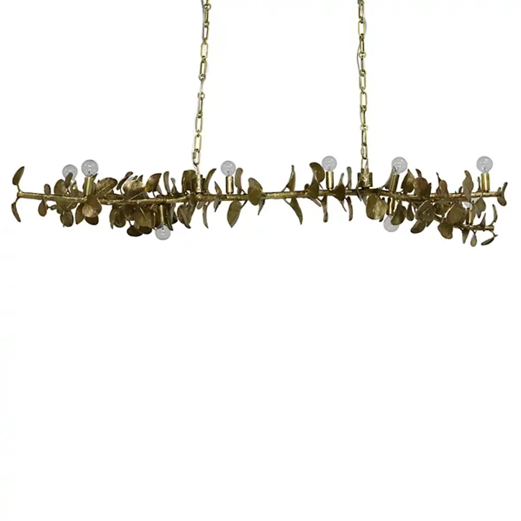 Add an awe-inspiring presence to your gathering spaces with the organically inspired design of the Eucalyptus Linear Suspension from Palecek. This intricate design descends from a broad canopy via fine chains held in parallel. The chains suspend a single slender branch-style crossbar accompanied by curving, naturally shaped, and veined aluminum leaves that grow around open candelabra lamping above and below. The lamping washes out light at all angles, reflecting off the natural shape of the leaves for an unforgettable radiance that draws the eye.