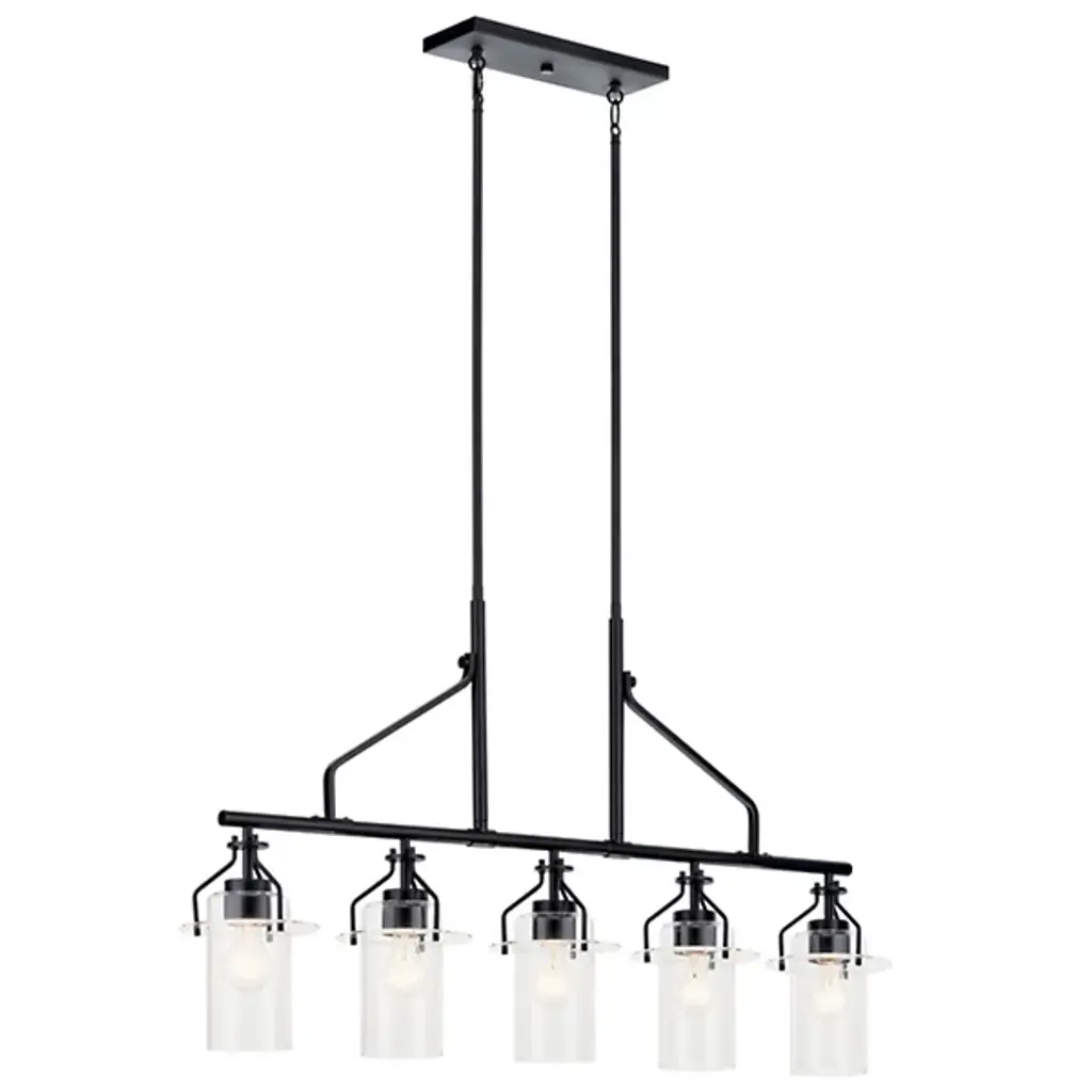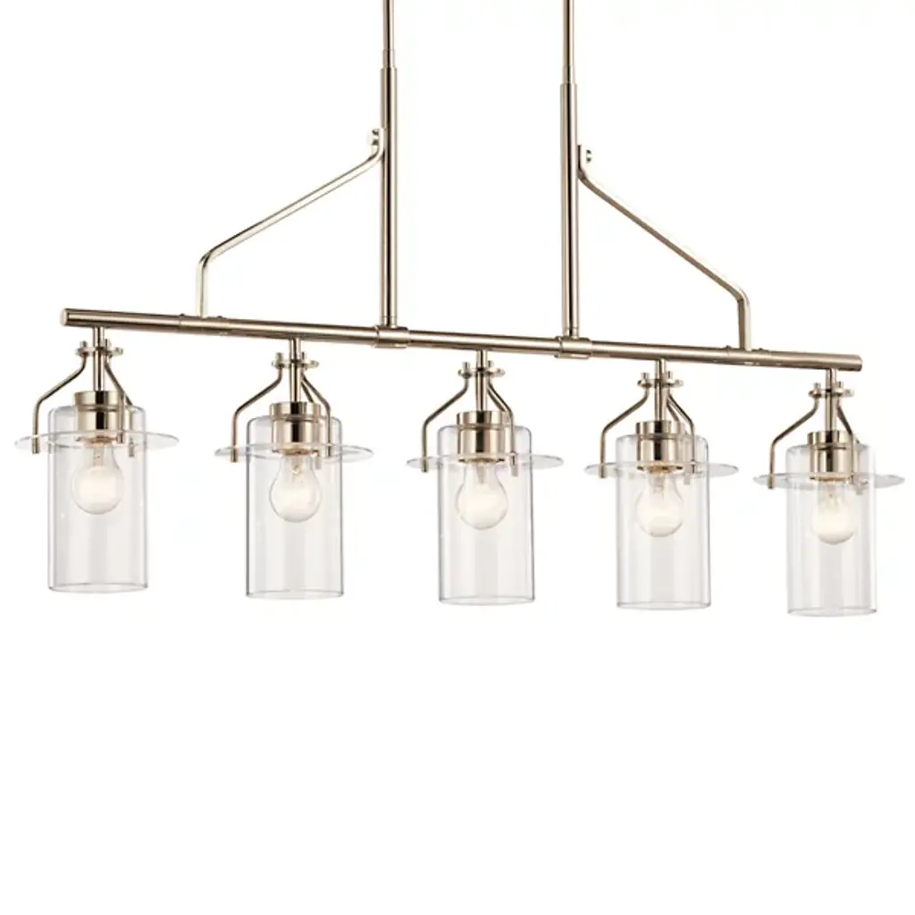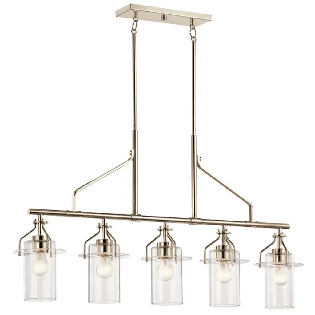 Add a smooth accent above your tables or long kitchen islands with the stately, stretched-out structure of the Everett Linear Suspension from Kichler. An airy confection of metal and glass, it uses a sharp-cornered rectangular canopy to suspend two slender downrods, each one accented by a slender brace to secure a single crossbar below. An evenly spaced array of rounded sockets extends below, surrounding its lamping with clear cylindrical shades of glass and acrylic ring accents that extend an elegant glow in all directions.