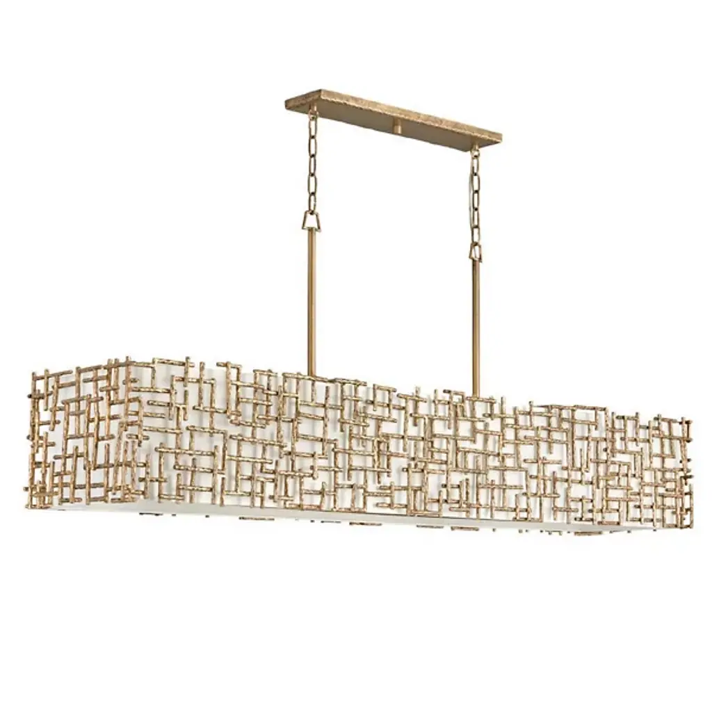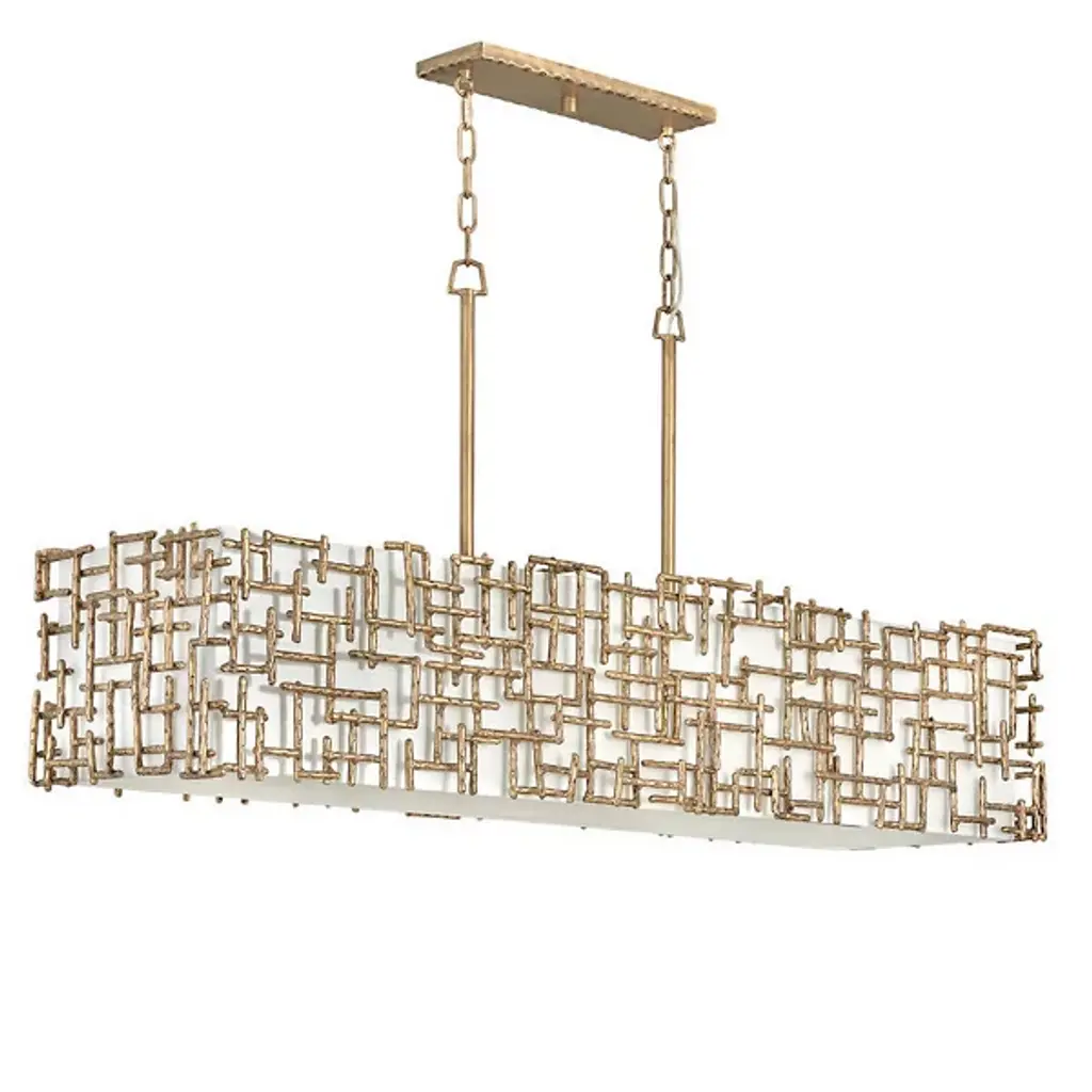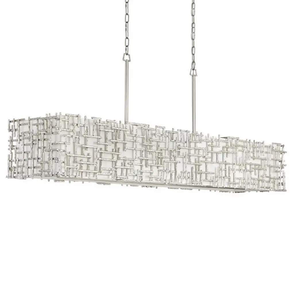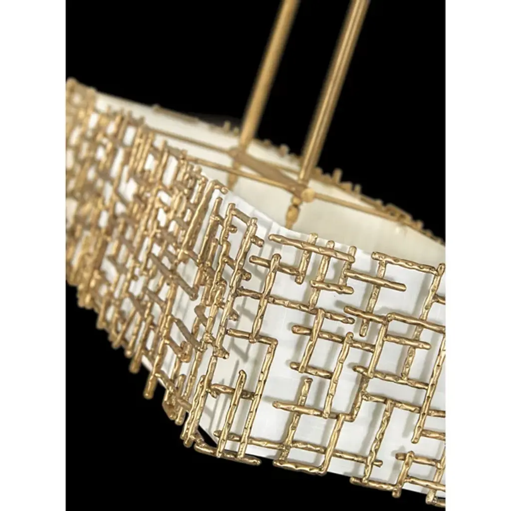 Augment your interiors with the stylish, sculptural appearance of the Farrah Linear Suspension from Fredrick Ramond. A simple rectangular canopy anchors the fixture to its mounting surface, dropping two short chains to parallel stems that support lamping concealed under a long rectangular shade of white fabric. The shade is topped by an additional screen of hand-hammered steel stems assembled into a crosshatch pattern, lending more texture to the whole piece while adding a soft set of shadows to the tasteful ambient light.