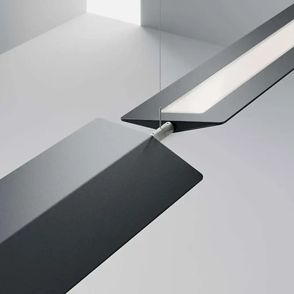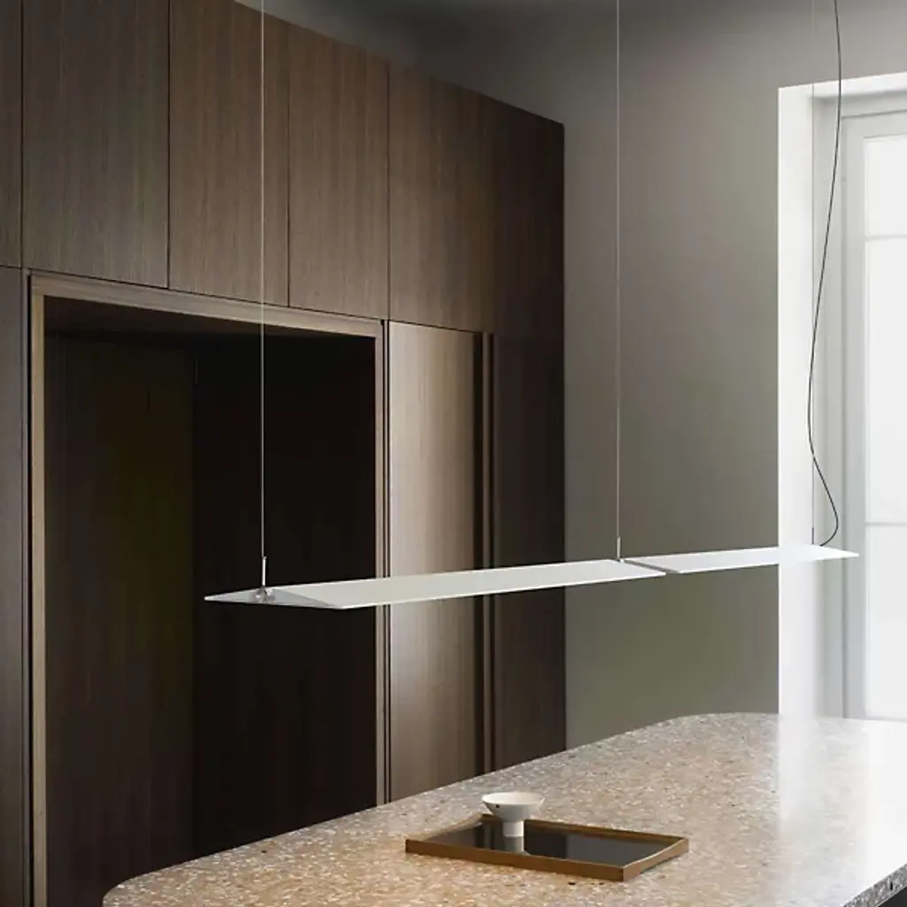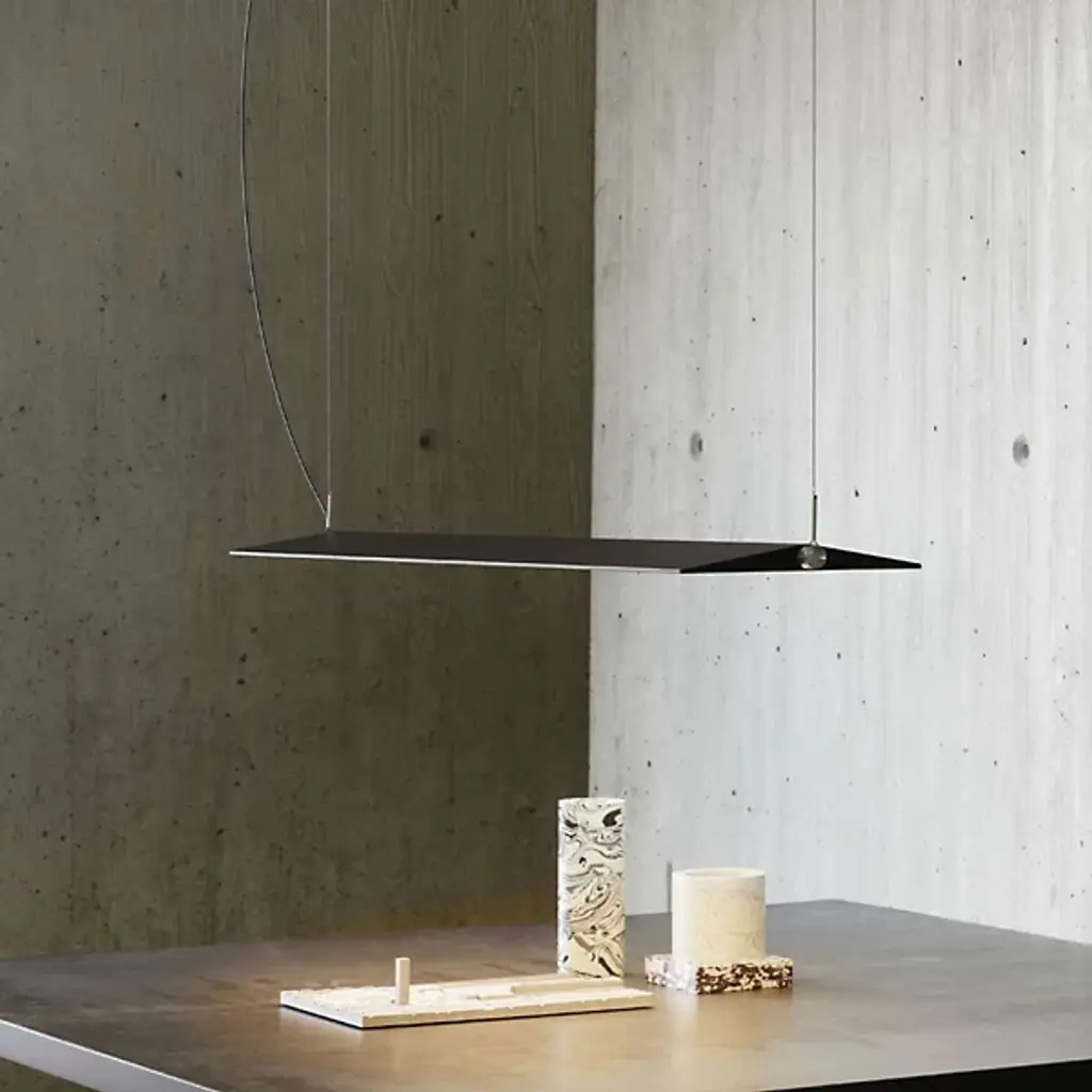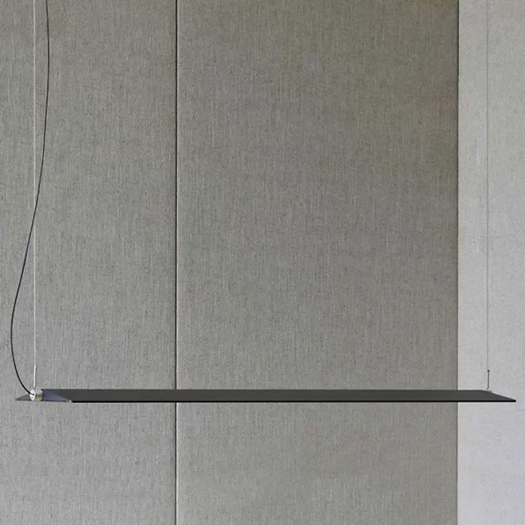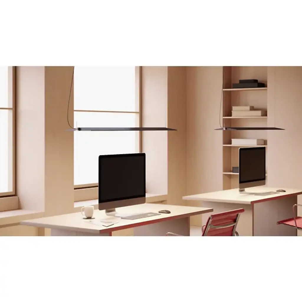 Clean light wherever you need it. The Fienile LED Linear Suspension from Luceplan is a 360-degree rotating piece, satisfying with flexibility and ultra-refined design. Creator Daniel Rybakken sees his work at the intersection between art and design. Rybakken creates lighting pieces that are as impactful during the day then they are at night. Here, Rybakken puts shape in focus with a fine wire suspension. The wire tethers to the geometric lamp head with a rotating cylindrical joint. Made from aluminum, the lamp head angles gently to suggest the fanned-out quality of the light. LEDs pair up with a PMMA for even and glare-free light diffusion. This LED light can be directed up for ambiance or down to evenly glaze one's table surface.