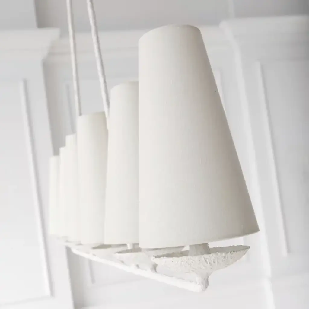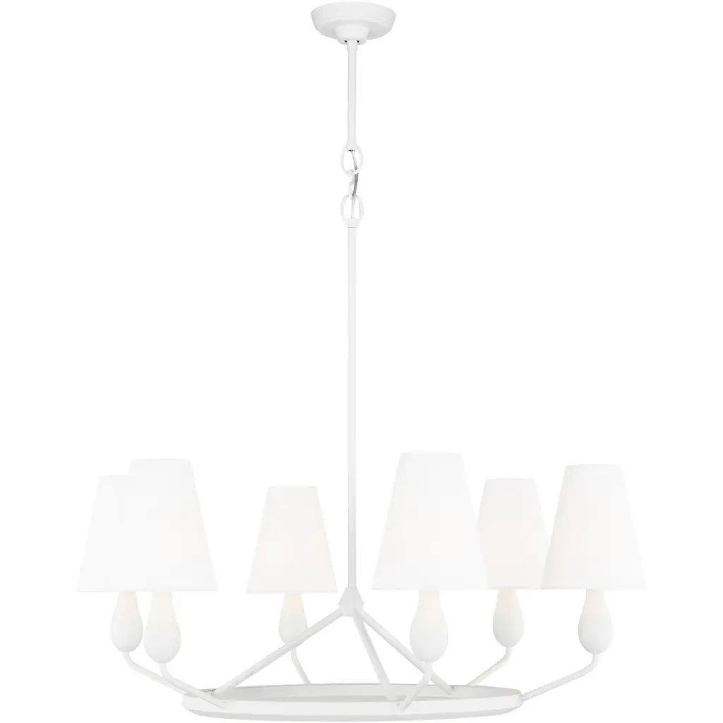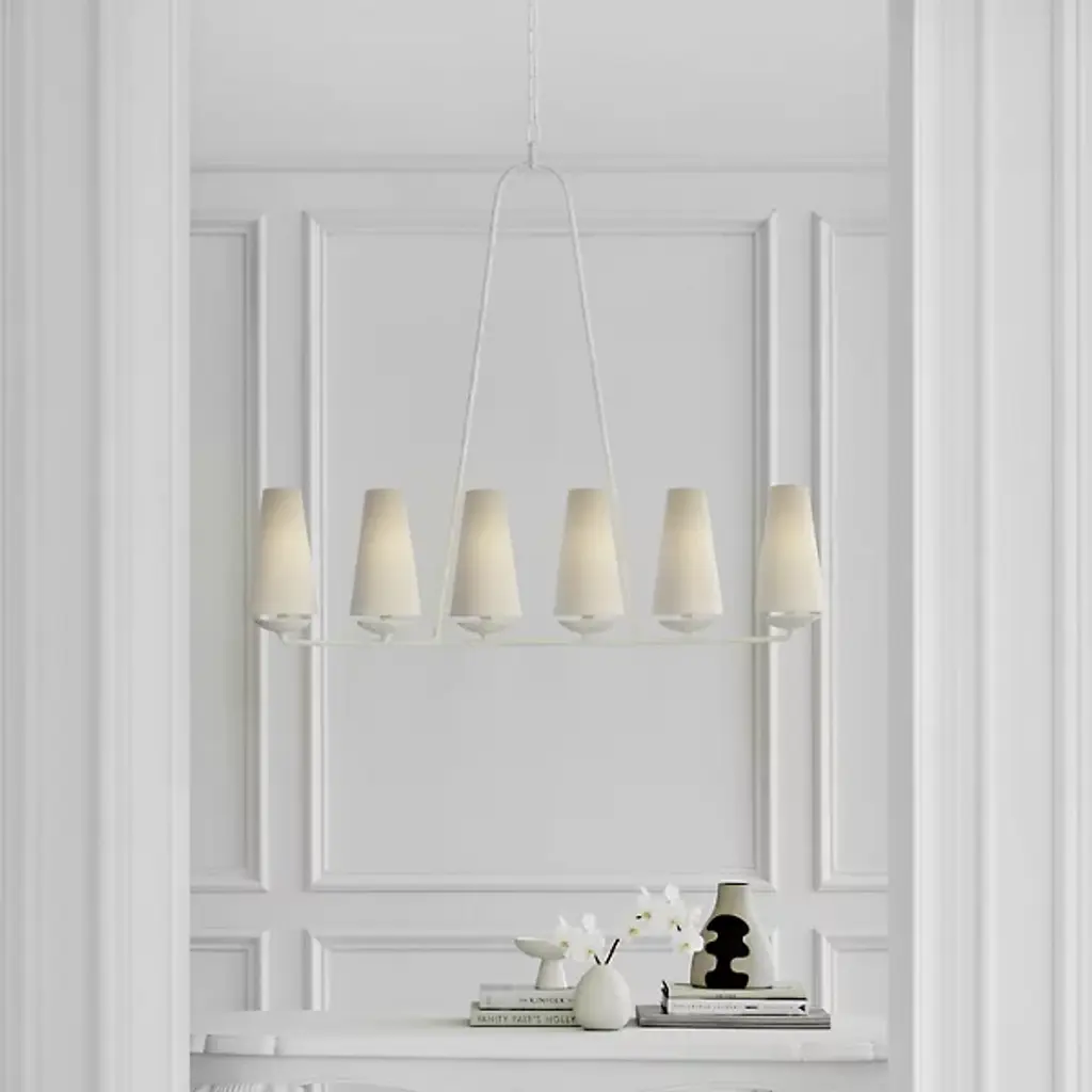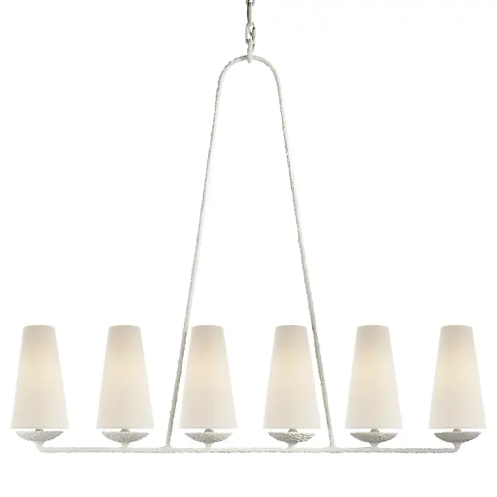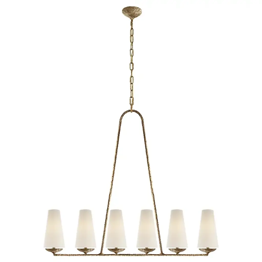 The Fontaine Linear Suspension by Visual Comfort Signature, formerly known as Visual Comfort, reinvents traditional suspension design, blending decorative and rustic elements for an entirely unique display. The body of the fixture consists of an open metal frame (suspended from a chain and low-profile canopy) which supports a series of tapered Linen shades. Once lit, a soft glow fills the surrounding space, providing the perfect ambiance for social settings.