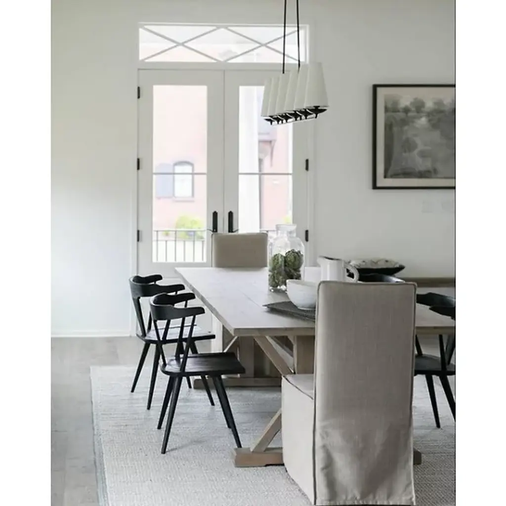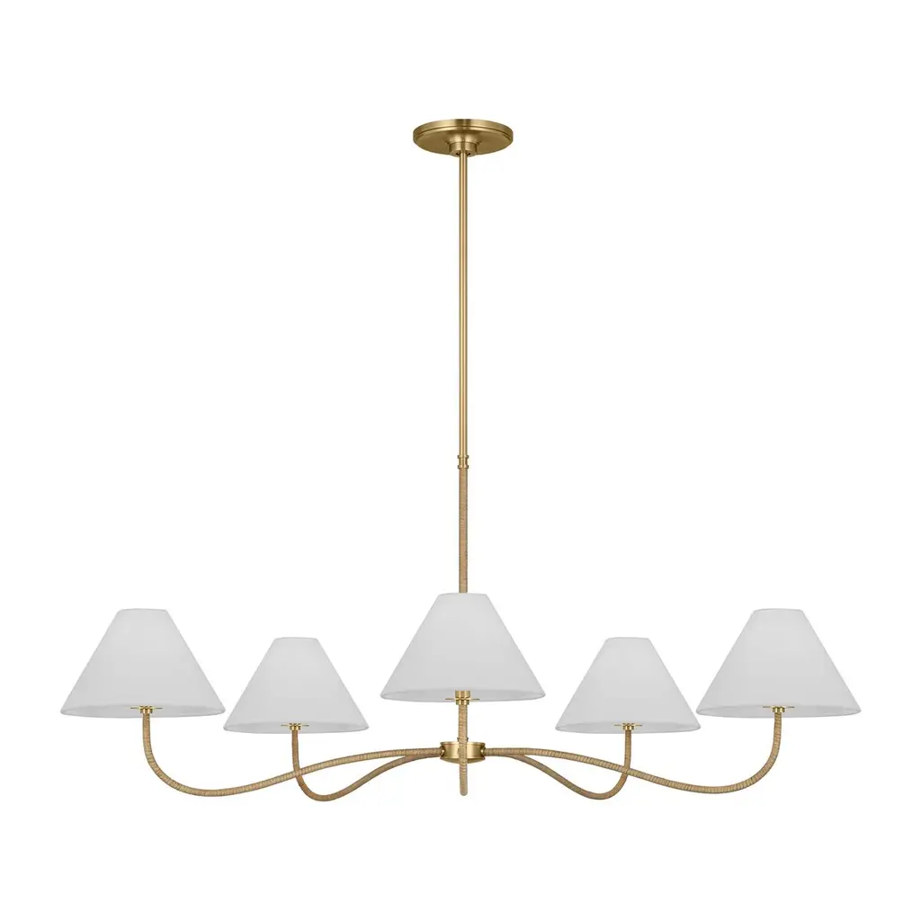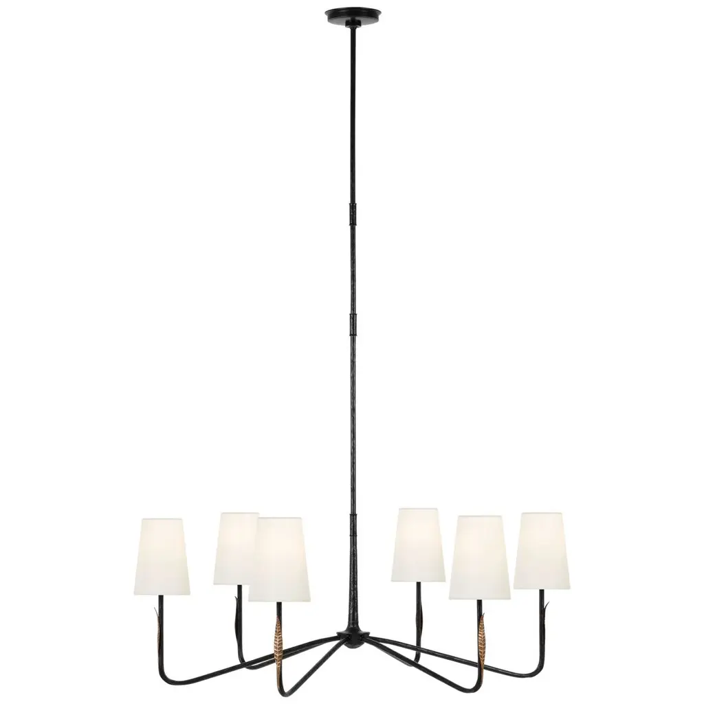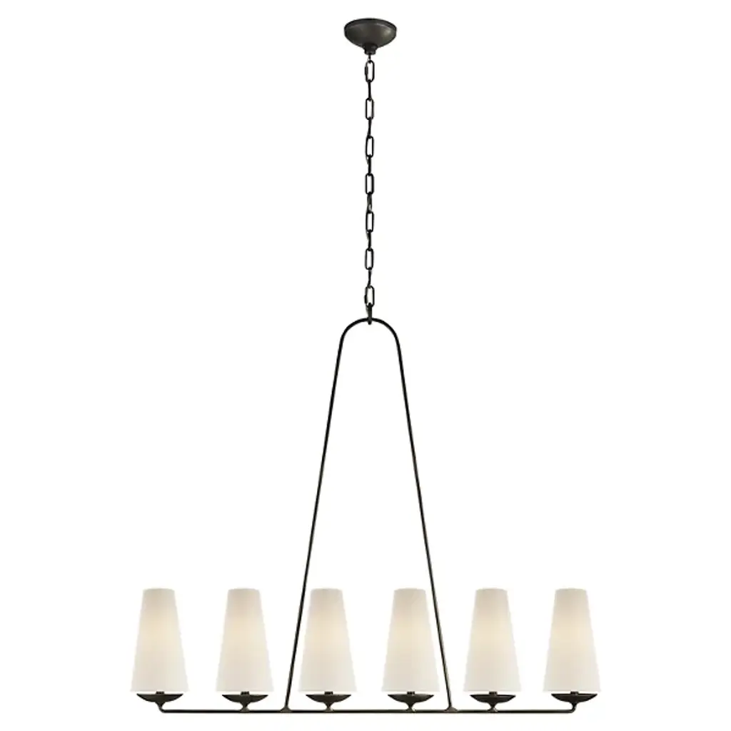 The Fontaine Linear Suspension by Visual Comfort Signature, formerly known as Visual Comfort, reinvents traditional suspension design, blending decorative and rustic elements for an entirely unique display. The body of the fixture consists of an open metal frame (suspended from a chain and low-profile canopy) which supports a series of tapered Linen shades. Once lit, a soft glow fills the surrounding space, providing the perfect ambiance for social settings.