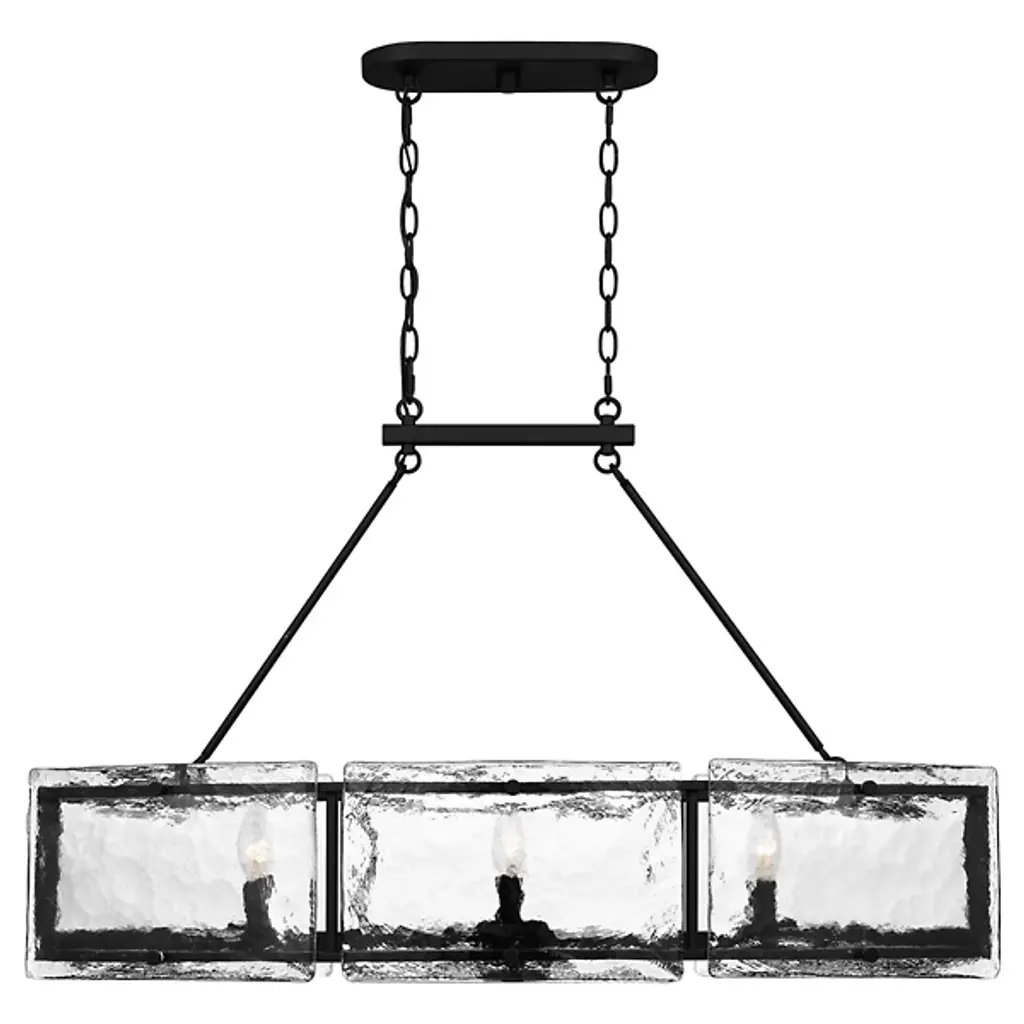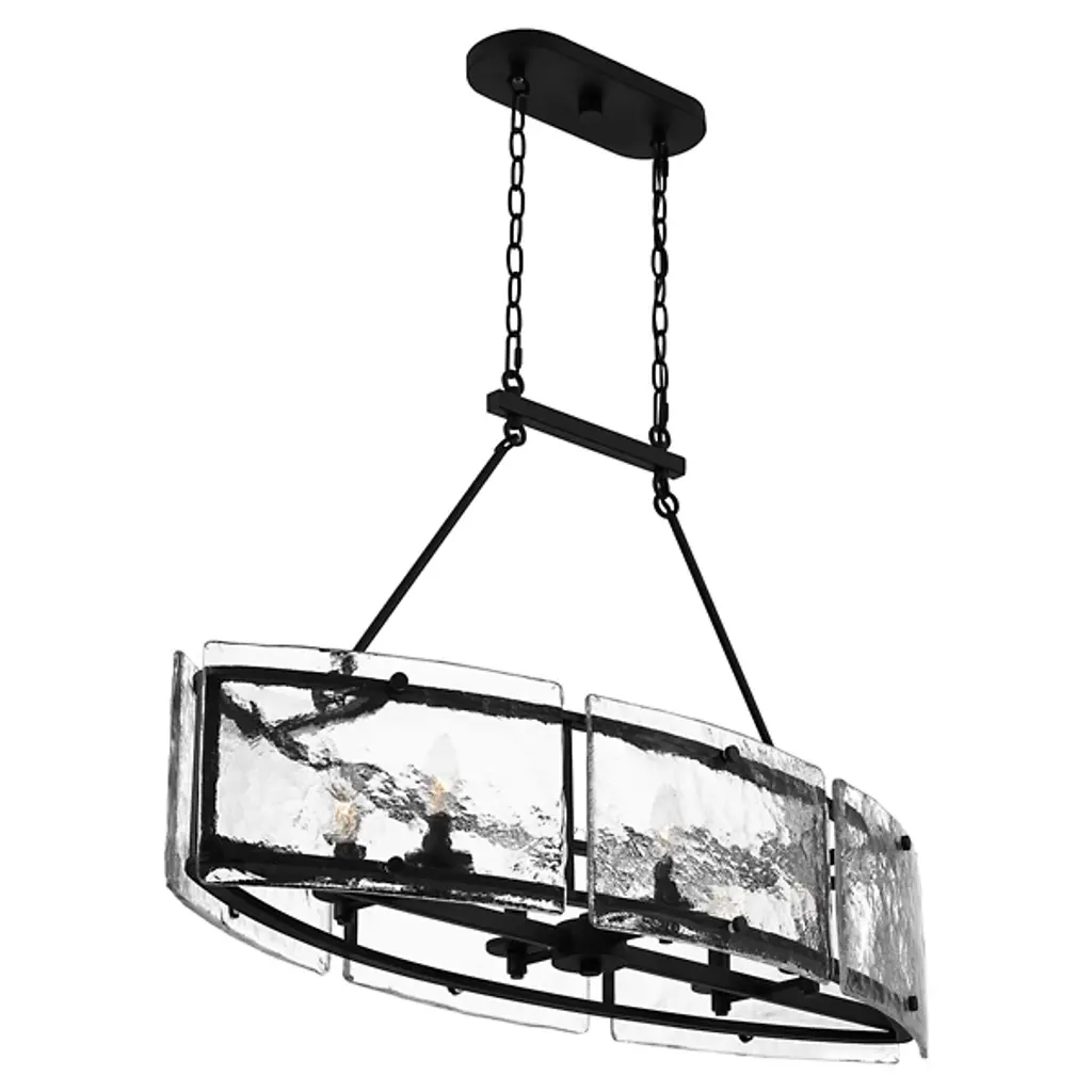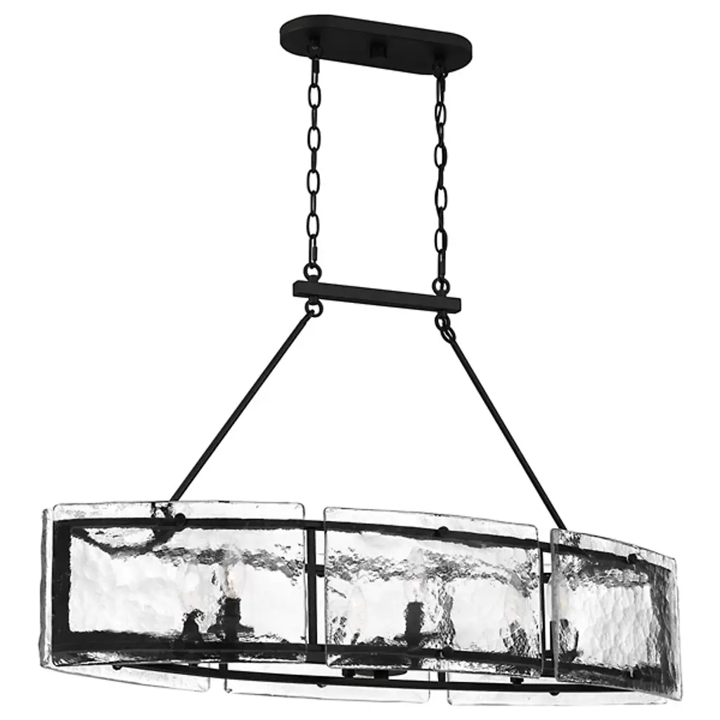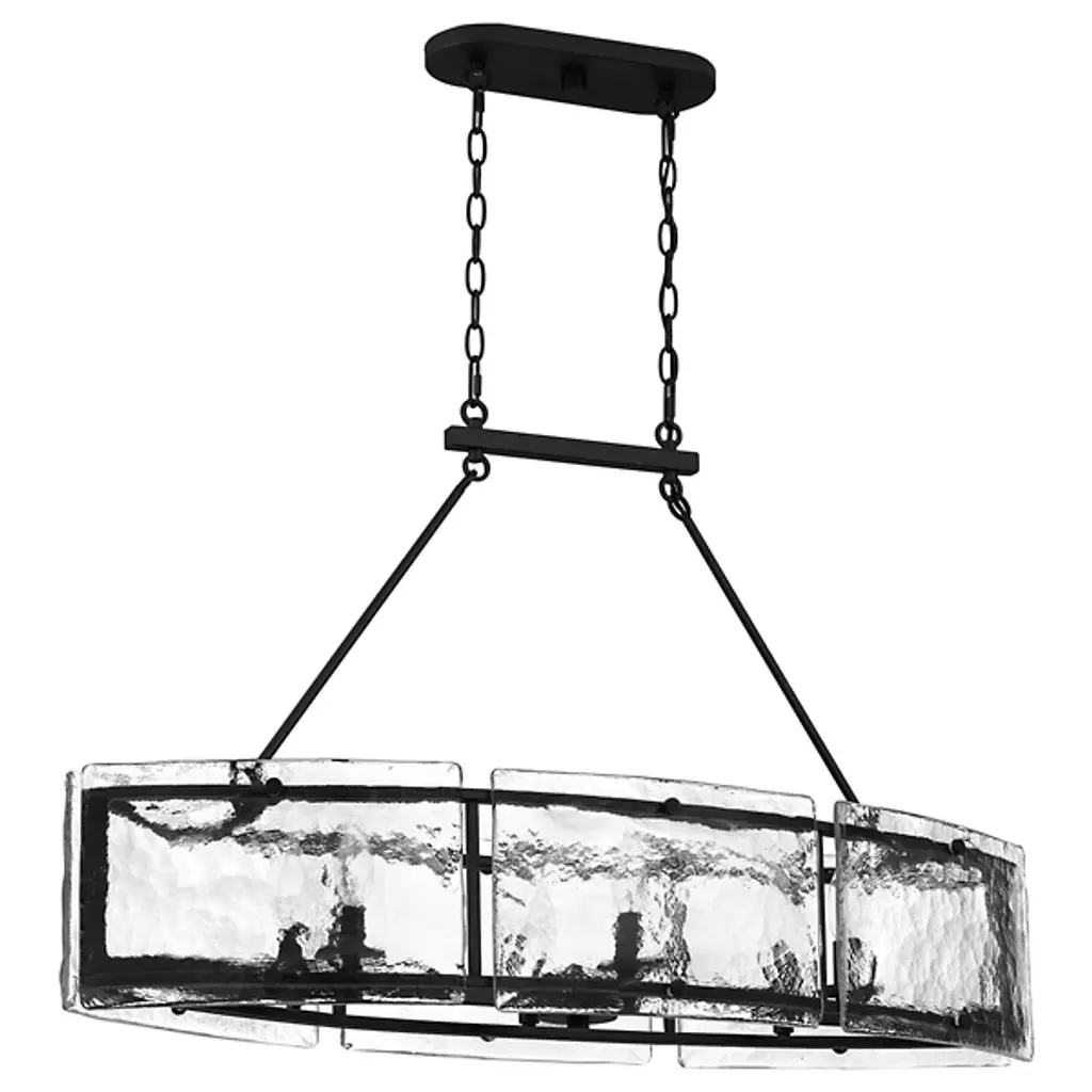 The intersection of practicality and premium materials. With its heavily textured glass slab façade, the Fortress Linear Suspension by Quoizel offers a rustic, antiqued aesthetic to enrich any interior design. Multiple luminaires are enclosed within the fixture's mottled frame, creating ample light to illuminate a found wood dining table or a handsome kitchen island.