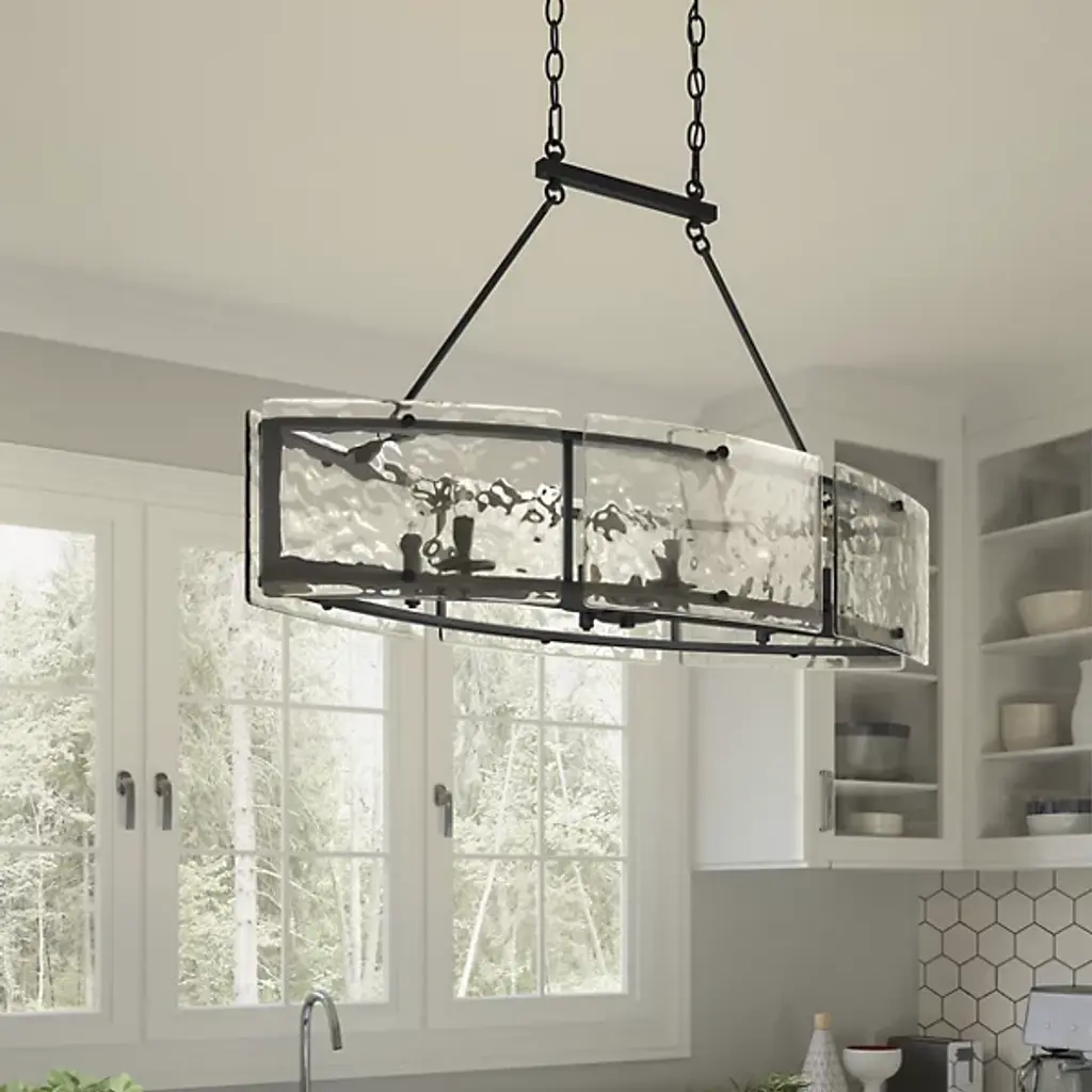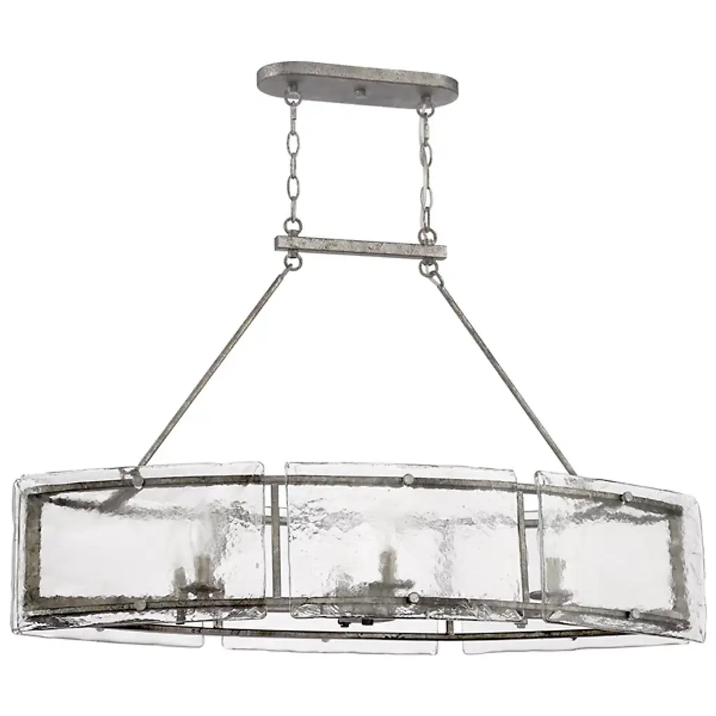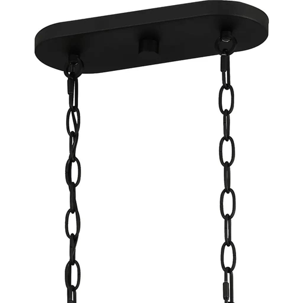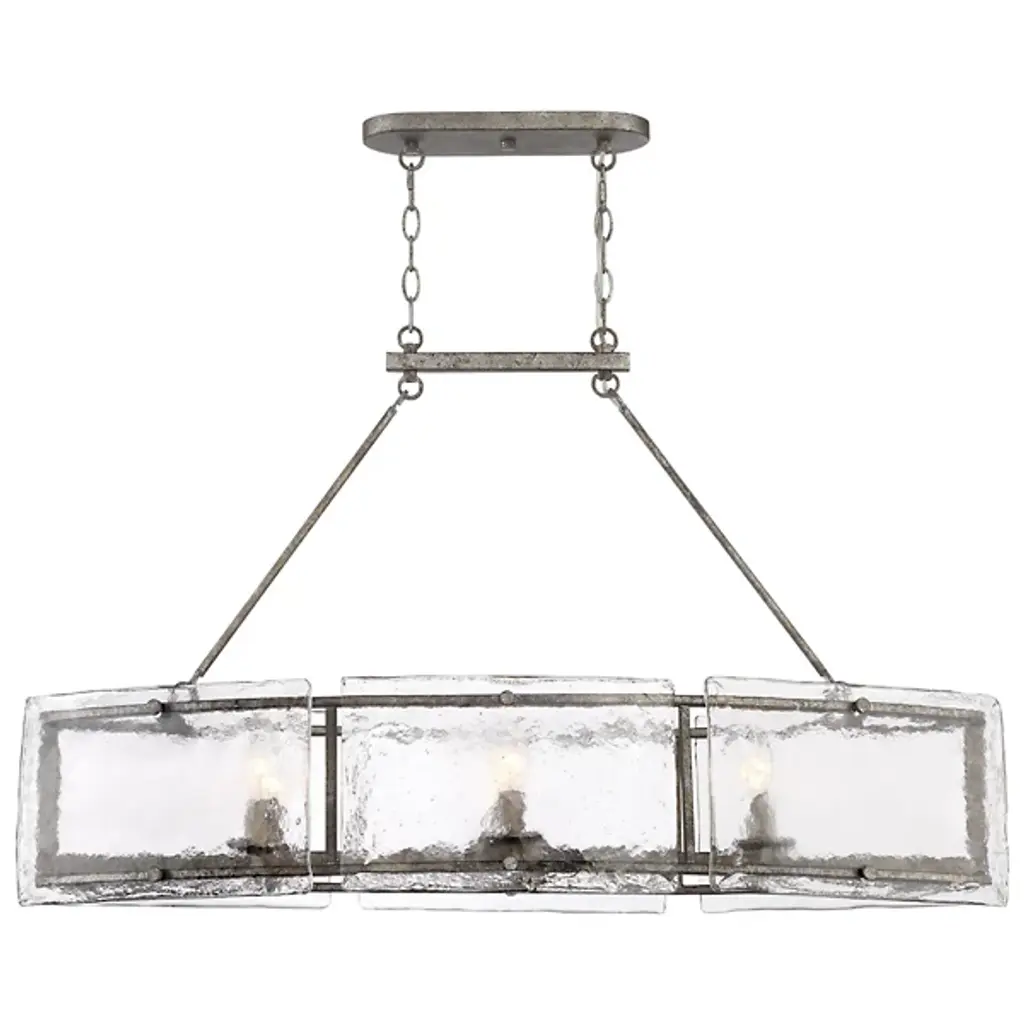 The intersection of practicality and premium materials. With its heavily textured glass slab façade, the Fortress Linear Suspension by Quoizel offers a rustic, antiqued aesthetic to enrich any interior design. Multiple luminaires are enclosed within the fixture's mottled frame, creating ample light to illuminate a found wood dining table or a handsome kitchen island.