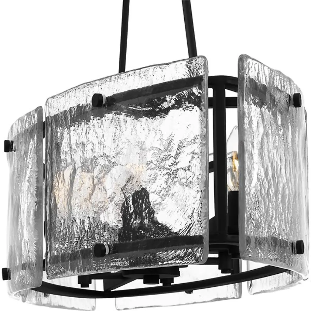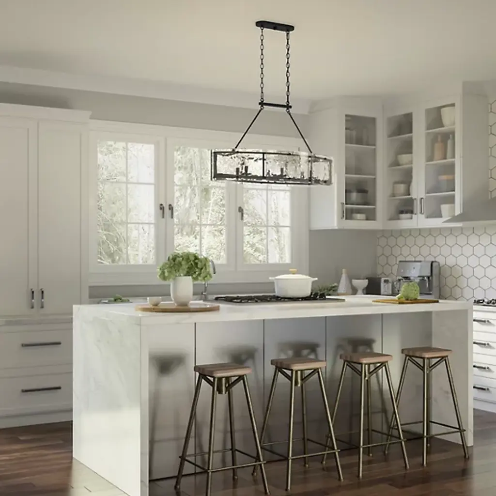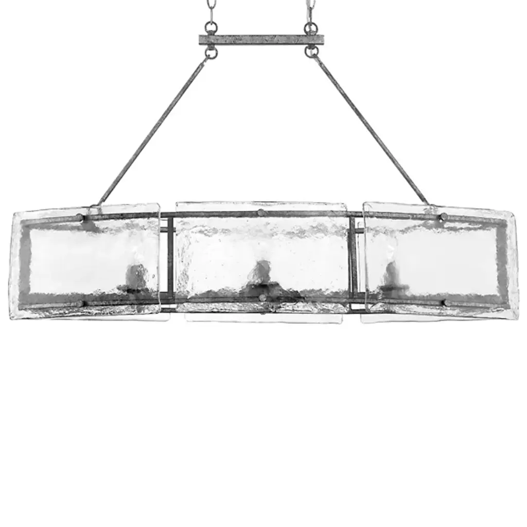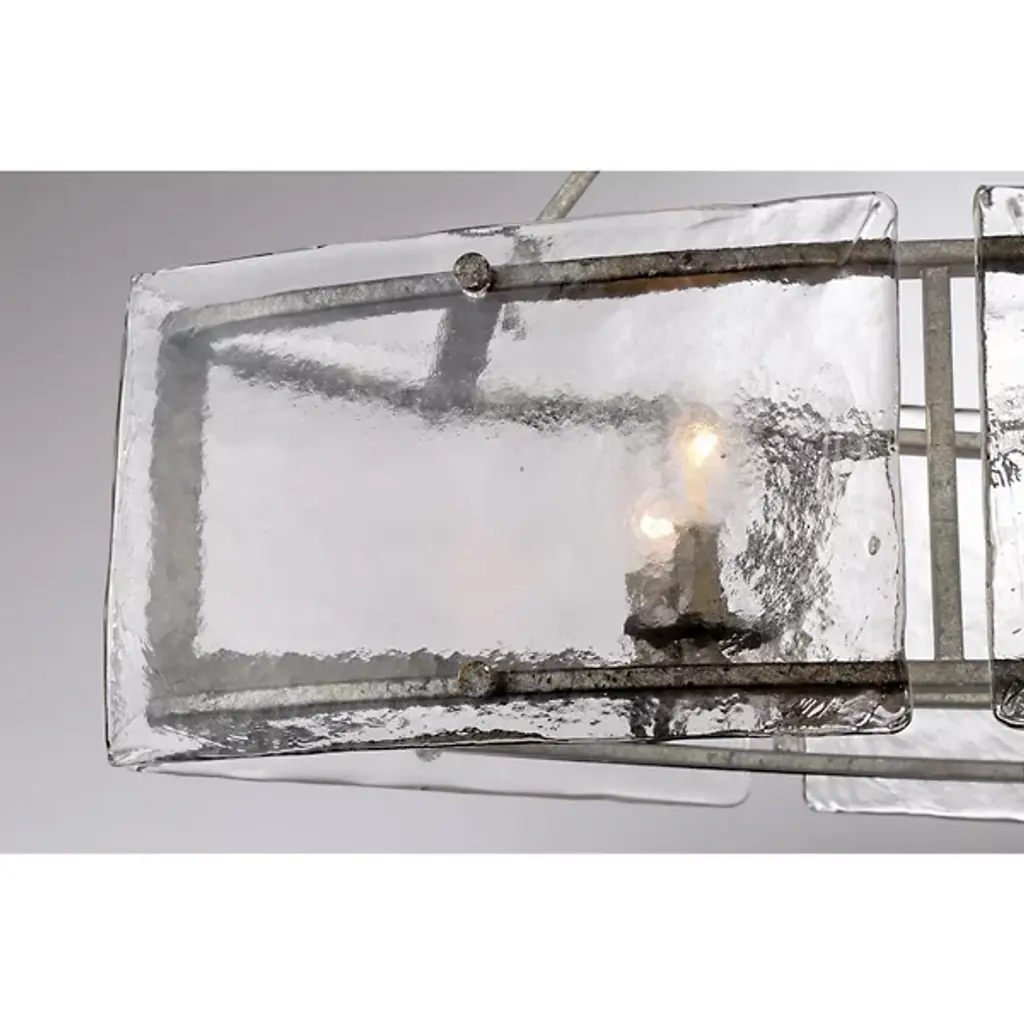The intersection of practicality and premium materials. With its heavily textured glass slab façade, the Fortress Linear Suspension by Quoizel offers a rustic, antiqued aesthetic to enrich any interior design. Multiple luminaires are enclosed within the fixture's mottled frame, creating ample light to illuminate a found wood dining table or a handsome kitchen island.