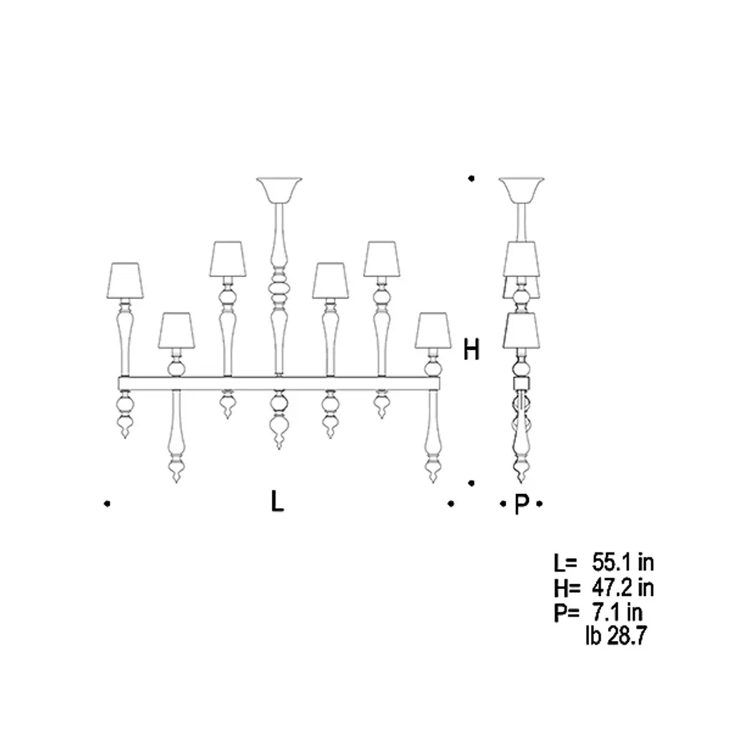 Dreamy Venetian curves presented with an elegant contemporary edge. The Fosfato Linear Suspension from Mazzega 1946 creates an enchanting experience in ways only warmly-lit handblown Murano glass can. With over a half-century of creating glass pieces, Muranese creator Mazzega introduces the contemporary setting to its dutifully preserved glass-making tradition. The piece satisfies one's taste for the ornate with a collection of handblown glass bodies. Seducing in their slender, contoured forms, the bodies pop in silhouette with bulbous accents. The sculptural nature of the glass creates a striking contrast with the sleek line of the metal crossbar. The piece again pays homage to traditional visuals with soft tapered fabric shades. Light filters through the shades for a comfortable ambiance, leaving golden highlights on the artful glass.