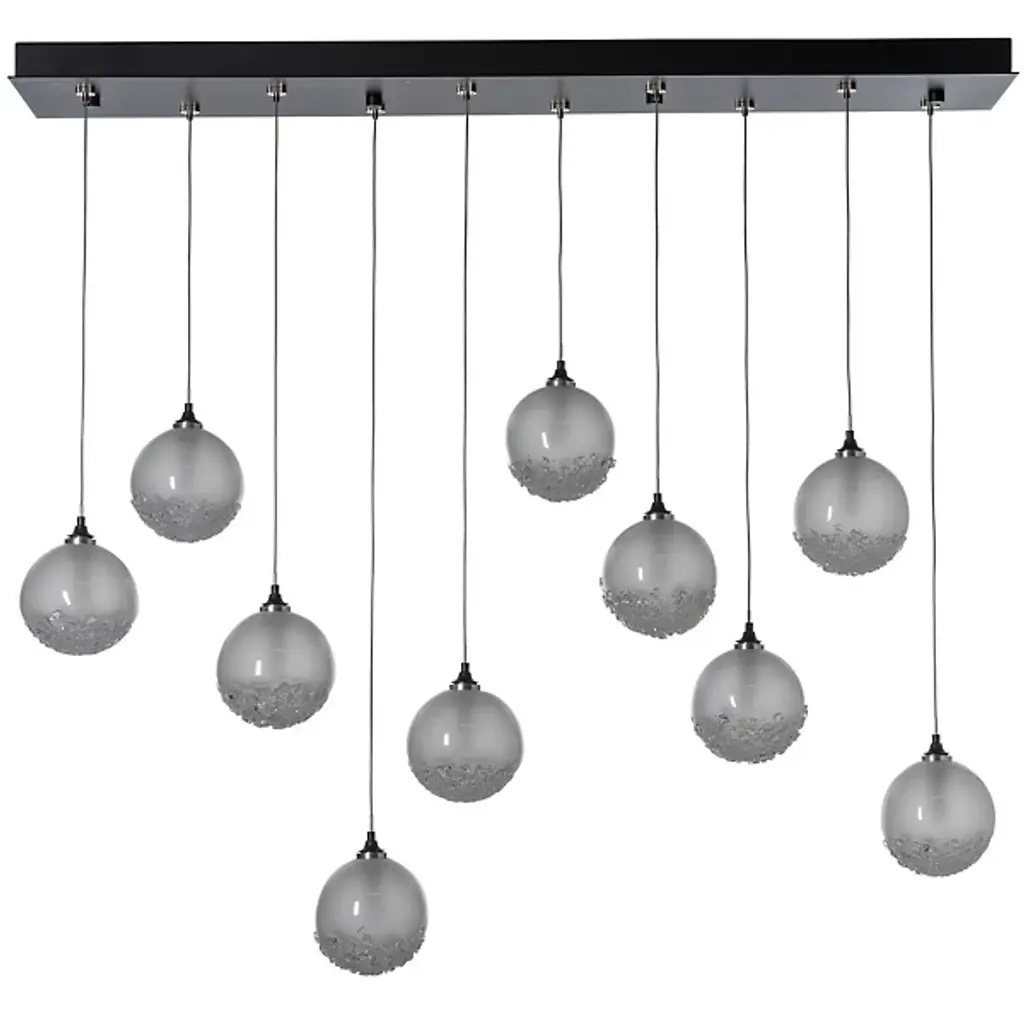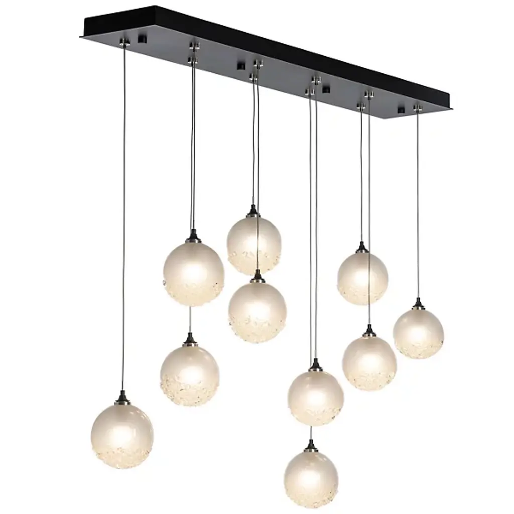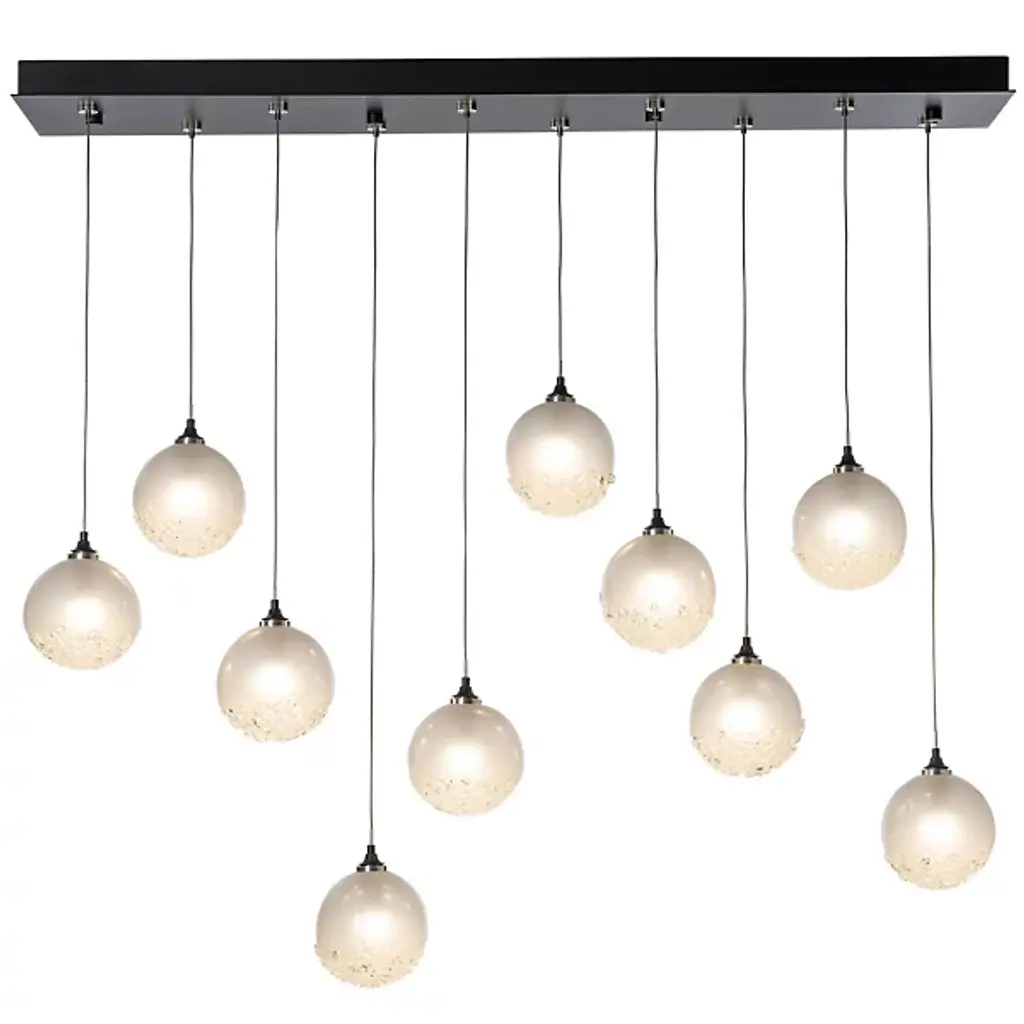 A great way to add sweetness and sparkle to modern kitchens or dining areas. The Fritz Globe Linear Suspension by Hubbardton Forge includes 10 glass globes with their bottom part covered in textural fritted glass. In addition to the sugary look, the glass frit adds shimmer to the light diffused through the shades. Each pendant comes with a suspension cable that can be individually adjusted to create the exact lighting look you want.