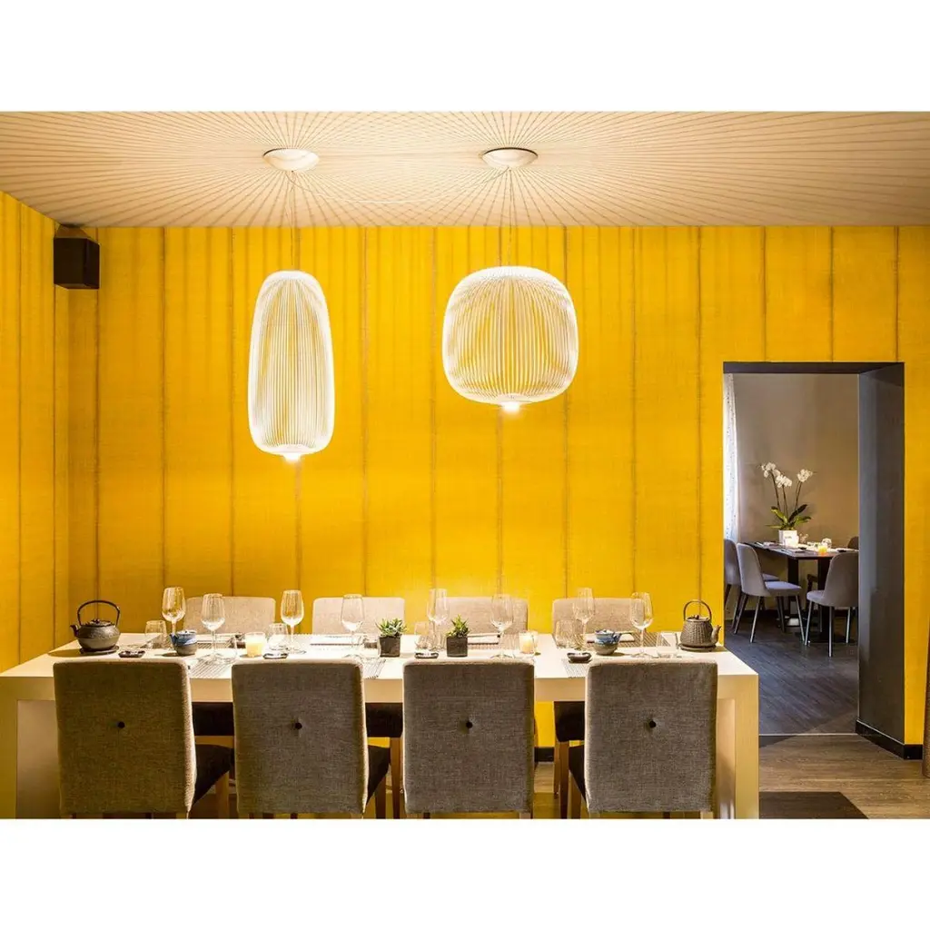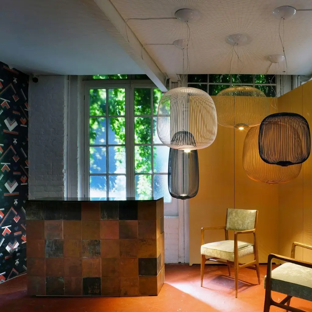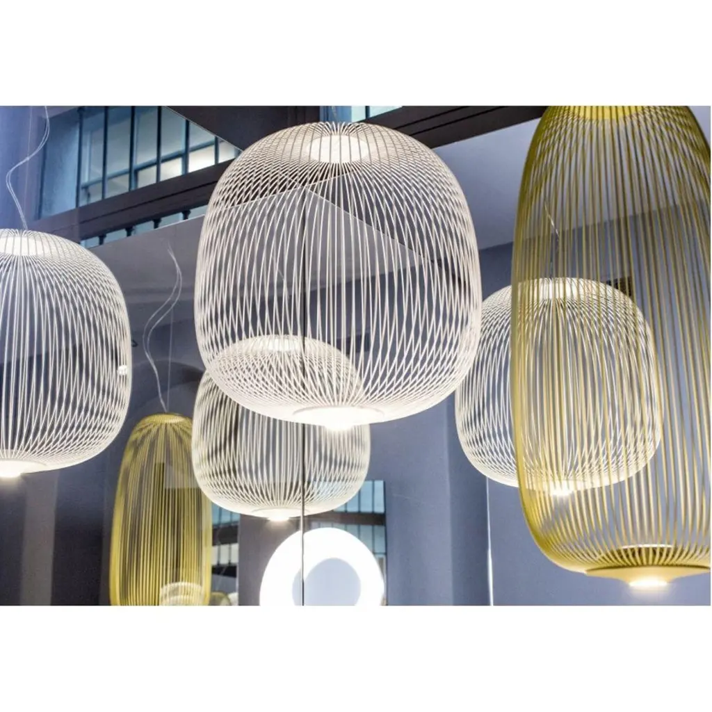 Garcia & Cumini 'Spokes 1’ metal suspension lamp in black for Foscarini.Designed by Cumini + Garcia and produced by Foscarini, the Italian lighting firm founded in Venice on the legendary island of Murano, where generations of master craftsman have skillfully used their unmatched imagination and skill to create the most innovative works of light into the modern era. The ‘Spokes 1’ is fabricated with thoughtful attention to detail, use of high quality materials and incomparable rigor and passion. Inspired by aviaries and antique Asian lanterns, the Spokes 1s metal rods delicately diffuse light throughout its surrounding surfaces resulting in a delightful interplay of shadow and light. The "Spokes 1' is flawlessly executed in varnished steel rods which is achieved through a meticulous step by step process.Price per item. In stock and available in unlimited quantities. Available in white, gold, copper or graphite in separate listings. Available as well in different shapes (Spokes 2, Spokes 3). This listing is for the Spokes 1 in black.In stock lead time 2 weeks. Out of stock can add 12 weeks or more. Please note that inventory availability can change without notice. For time sensitive orders please contact us for current lead times prior to purchasing.Illuminated via integrated 40w LED providing 3935 maximum lumens with 2700K color and CRI 90. Dimmable according to switch (switch not included). This lamp is ETL listed. Not UL listed, but recommended UL listing possible from an authorized 3rd party vendor for an additional fee. Contact us for more information.All sales final.