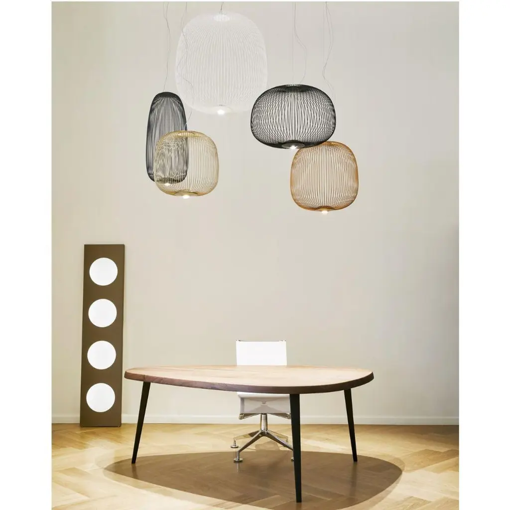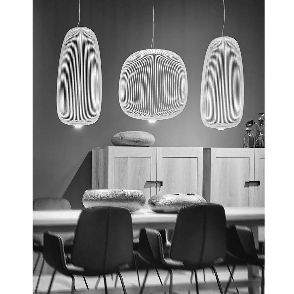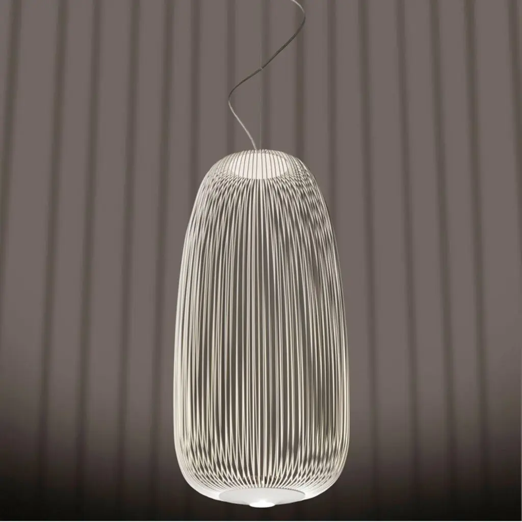 Garcia & Cumini 'Spokes 1’ metal suspension Lamp in white for FoscariniDesigned by Cumini + Garcia and produced by Foscarini, the Italian lighting firm founded in Venice on the legendary island of Murano, where generations of master craftsman have skillfully used their unmatched imagination and skill to create the most innovative works of light into the modern era. The ‘Spokes 1’ is fabricated with thoughtful attention to detail, use of high quality materials and incomparable rigor and passion. Inspired by aviaries and antique Asian lanterns, the Spokes 1's metal rods delicately diffuse light throughout its surrounding surfaces resulting in a delightful interplay of shadow and light. The "Spokes 1' is flawlessly executed in varnished steel rods which is achieved through a meticulous step by step process.Price per item. In stock and available in unlimited quantities. Available in black, gold, copper or graphite in separate listings for an additional cost. Available as well in different shapes (Spokes 2, Spokes 3). This listing is for the Spokes 1 in white.In stock lead time 2 weeks. Out of stock can add 12 weeks or more. Please note that inventory availability can change without notice. Please contact us for current lead times prior to placing time sensitive orders.Illuminated via integrated 40w LED providing 3935 maximum lumens with 2700K color and CRI 90. Dimmable according to switch (switch not included). This lamp is ETL listed. Not UL listed, but recommended UL listing possible from an authorized 3rd party vendor for an additional fee.All sales final.