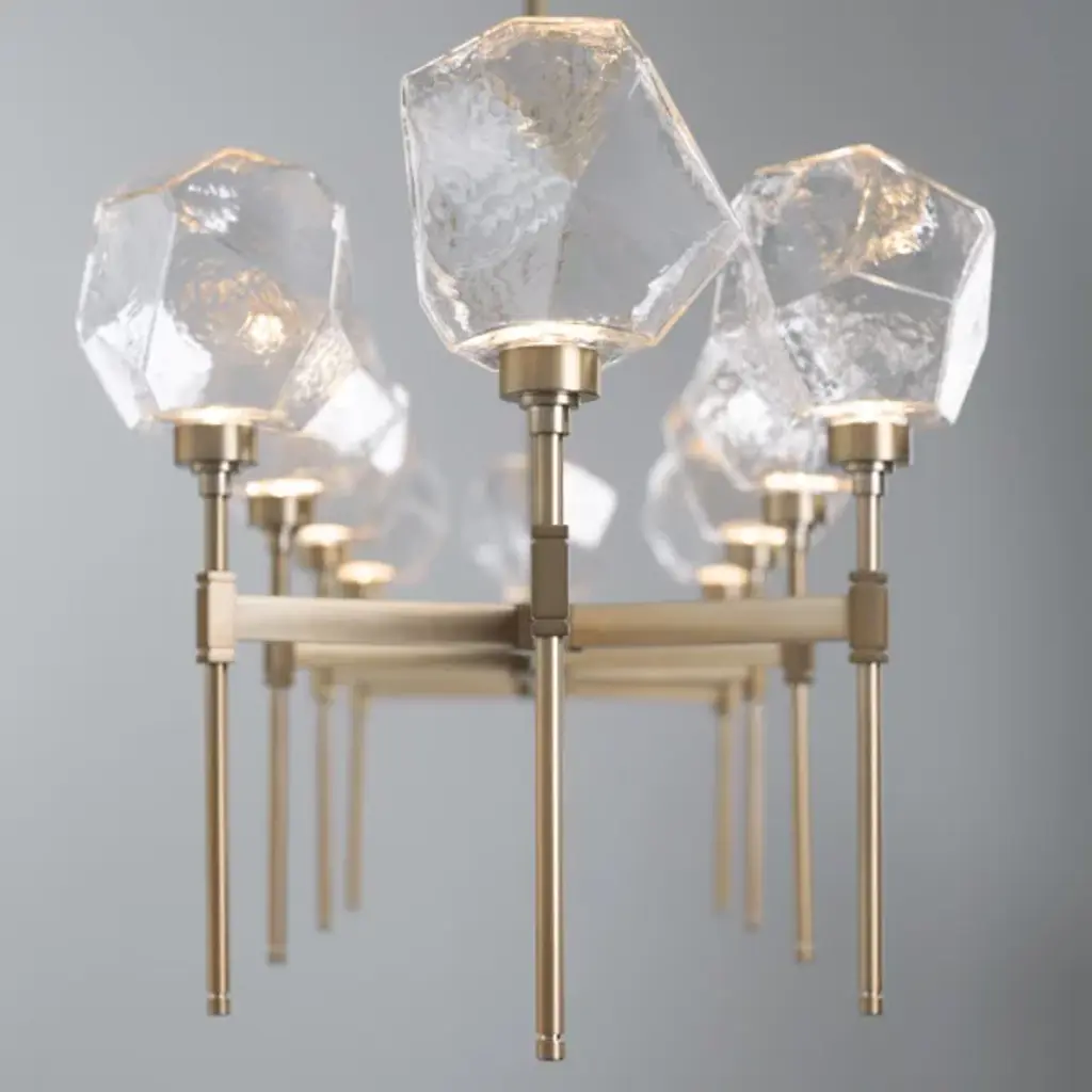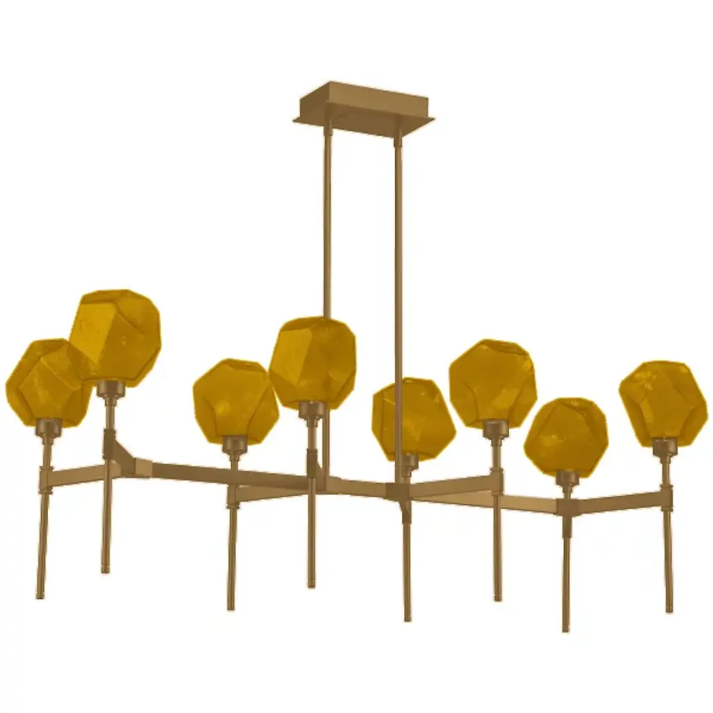 Bedazzle your home with the Gem Belvedere LED Linear Suspension by Hammerton Studio. This striking fixture features a series of hand-blown glass crystals set atop slender polished metal stems. Affixed to a linear frame, the textural shades emit a soft light from concealed LED light modules to create an atmospheric effect. Perfect for illuminating a dining area or kitchen island, this fixture beautifully combines modern sleekness with a raw edge.