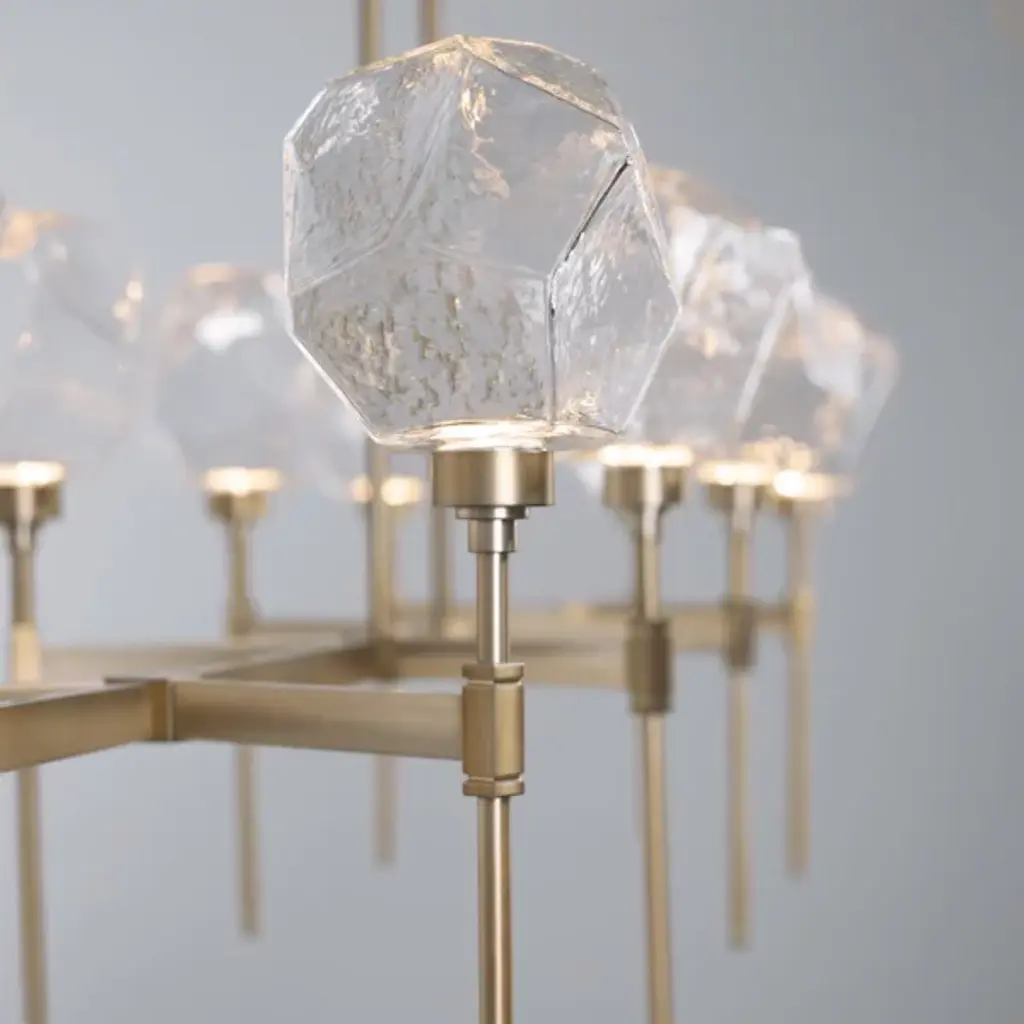 Bedazzle your home with the Gem Belvedere LED Linear Suspension by Hammerton Studio. This striking fixture features a series of hand-blown glass crystals set atop slender polished metal stems. Affixed to a linear frame, the textural shades emit a soft light from concealed LED light modules to create an atmospheric effect. Perfect for illuminating a dining area or kitchen island, this fixture beautifully combines modern sleekness with a raw edge.