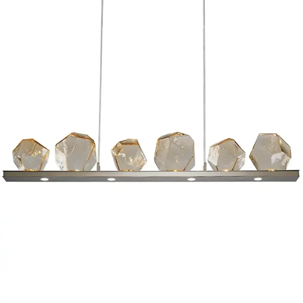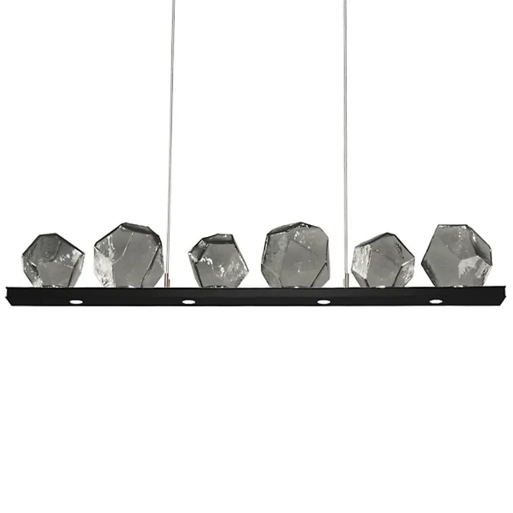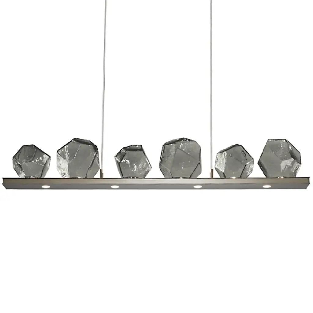 A showstopper of blown glass. The Gem Bezel LED Linear Suspension from Hammerton Studio marks a path with light-filled forms inspired by semi-precious stones. The piece creates a zen-like quality over dining tables through a minimalist rectangular housing made in sharp metal. A rocky formation of blown glass develops atop the housing, creating multi-faceted figures that stand out from the architecture of any room. A soft beam of light accentuates the organic contours of the forms with subtle yet defining highlights.