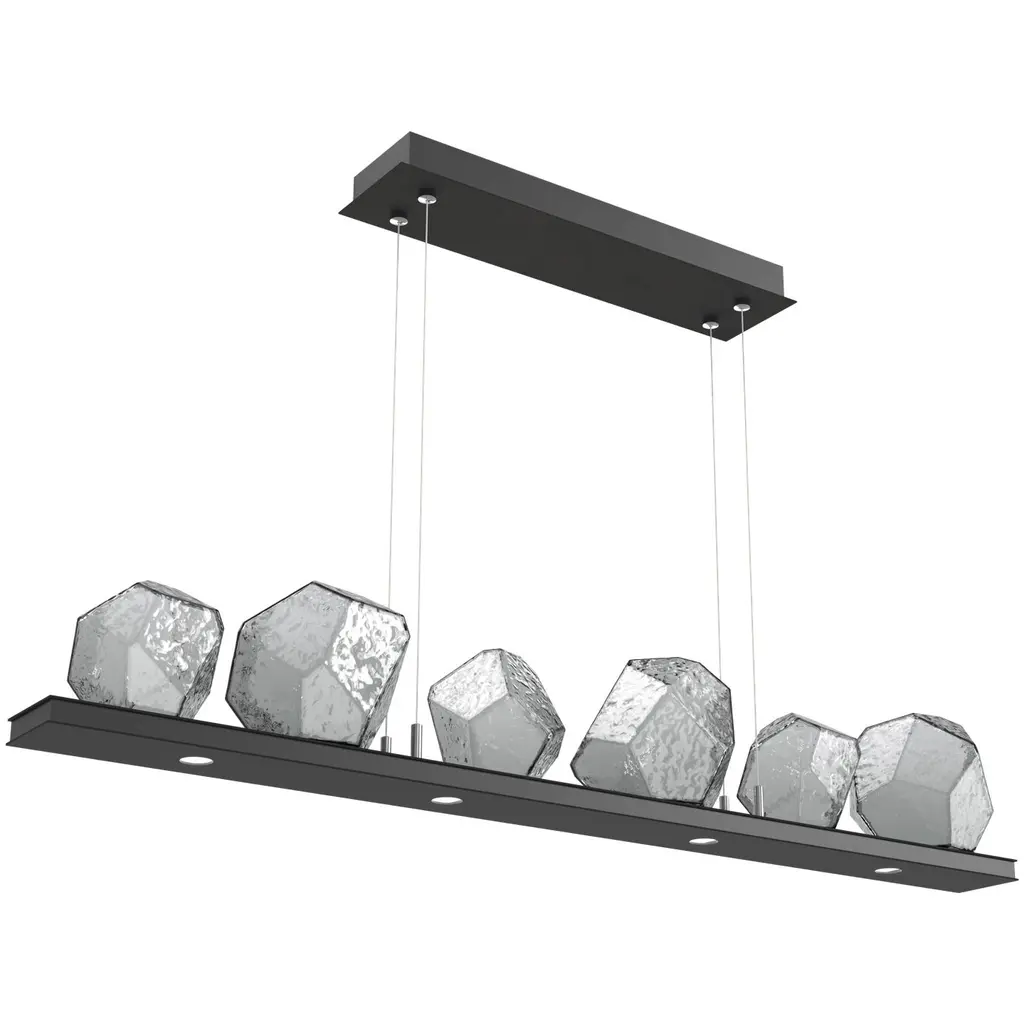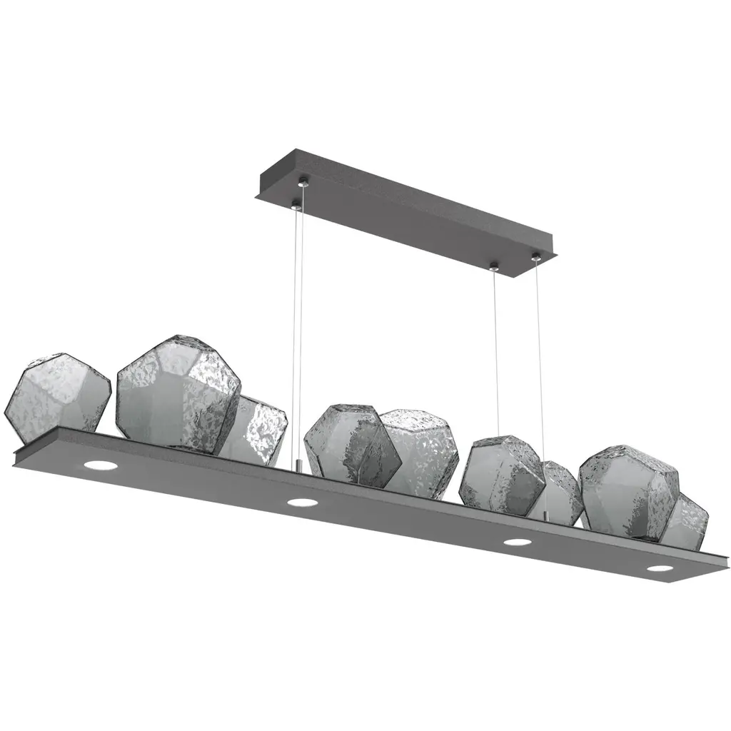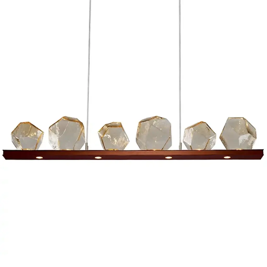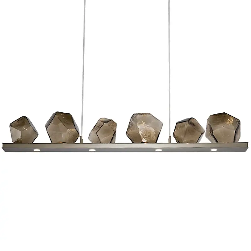 A showstopper of blown glass. The Gem Bezel LED Linear Suspension from Hammerton Studio marks a path with light-filled forms inspired by semi-precious stones. The piece creates a zen-like quality over dining tables through a minimalist rectangular housing made in sharp metal. A rocky formation of blown glass develops atop the housing, creating multi-faceted figures that stand out from the architecture of any room. A soft beam of light accentuates the organic contours of the forms with subtle yet defining highlights.
