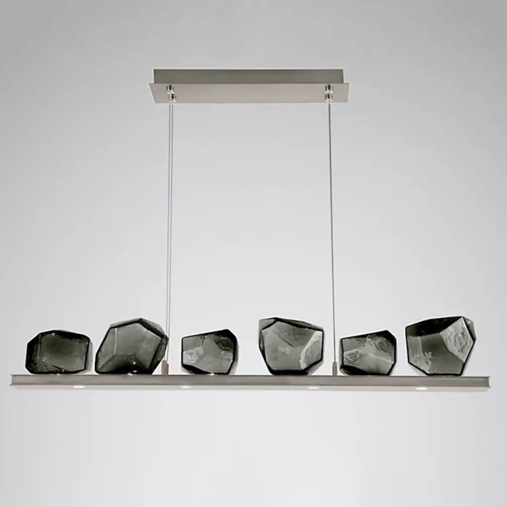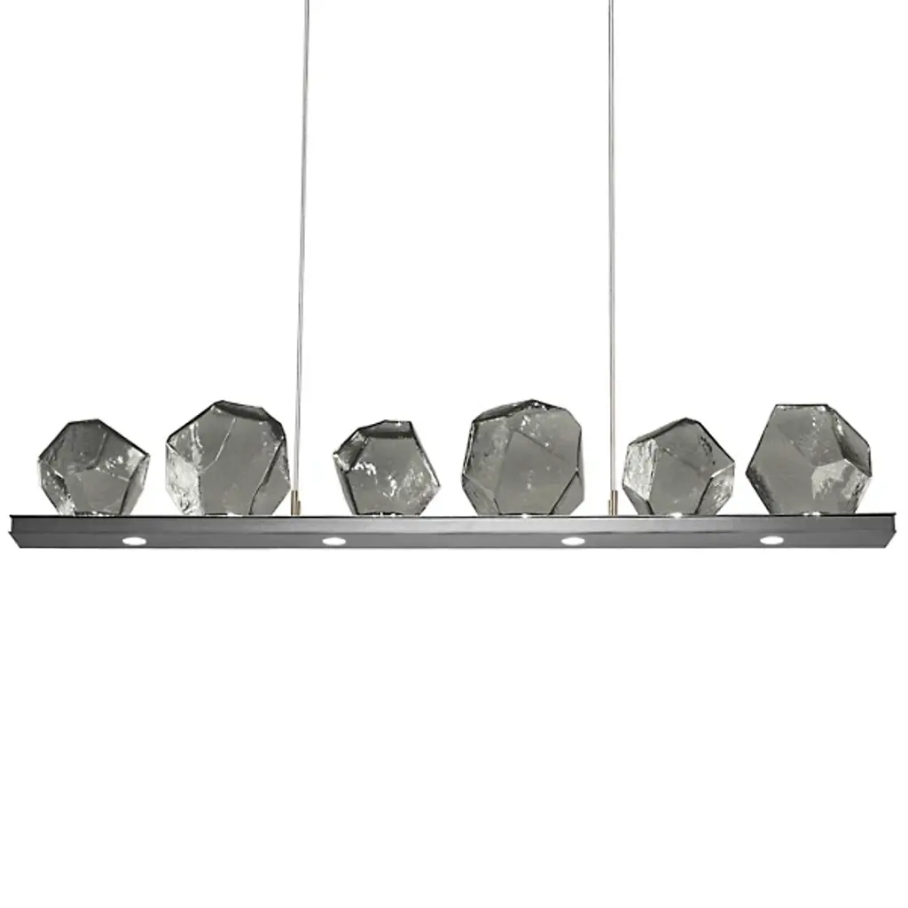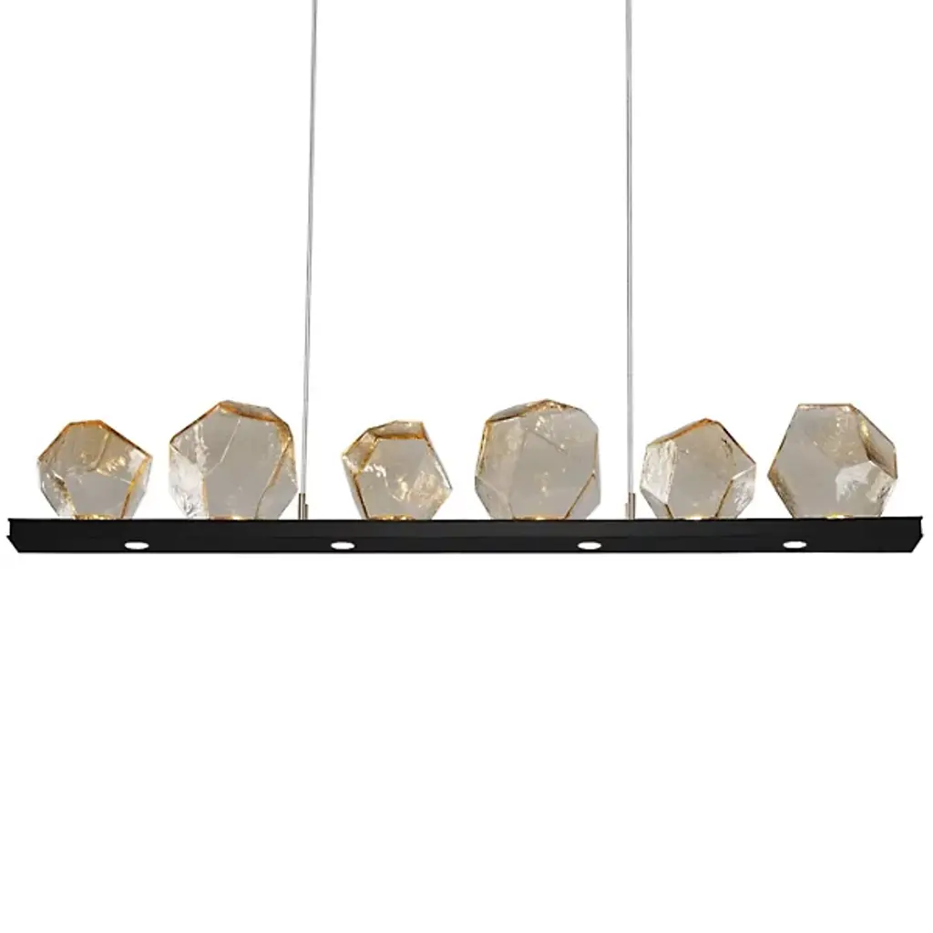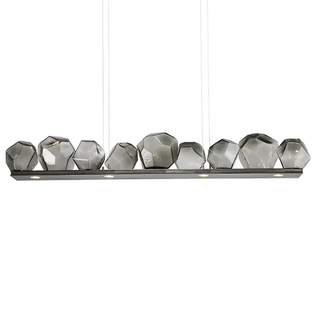 A showstopper of blown glass. The Gem Bezel LED Linear Suspension from Hammerton Studio marks a path with light-filled forms inspired by semi-precious stones. The piece creates a zen-like quality over dining tables through a minimalist rectangular housing made in sharp metal. A rocky formation of blown glass develops atop the housing, creating multi-faceted figures that stand out from the architecture of any room. A soft beam of light accentuates the organic contours of the forms with subtle yet defining highlights.
