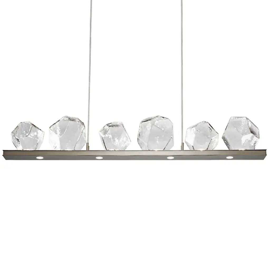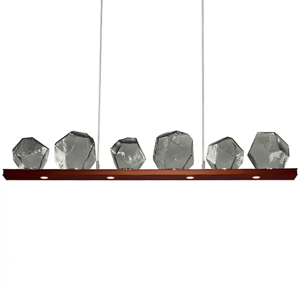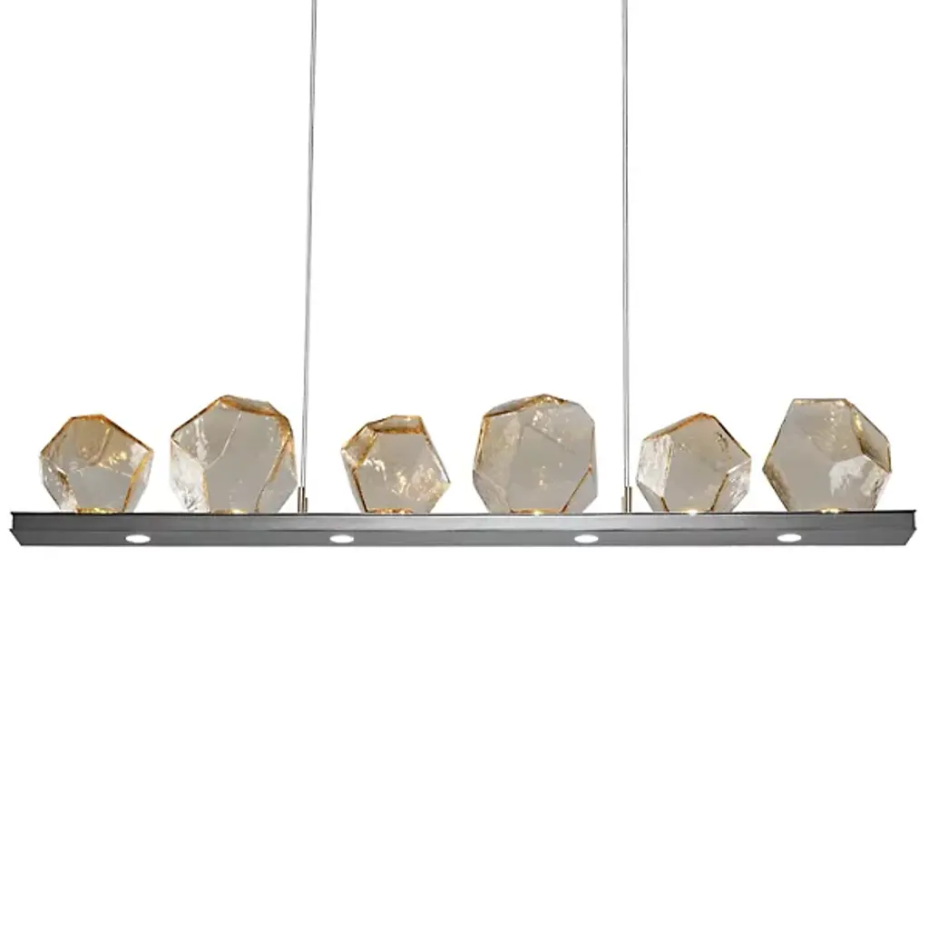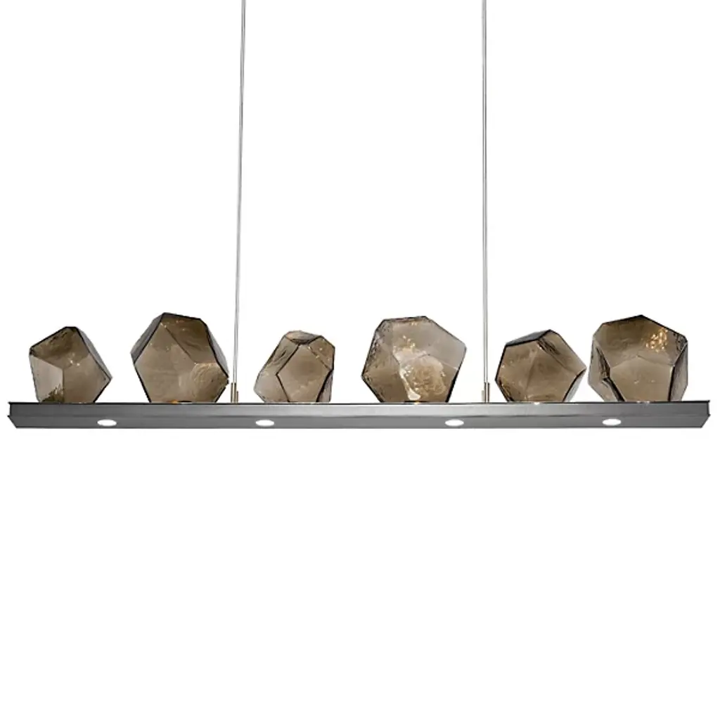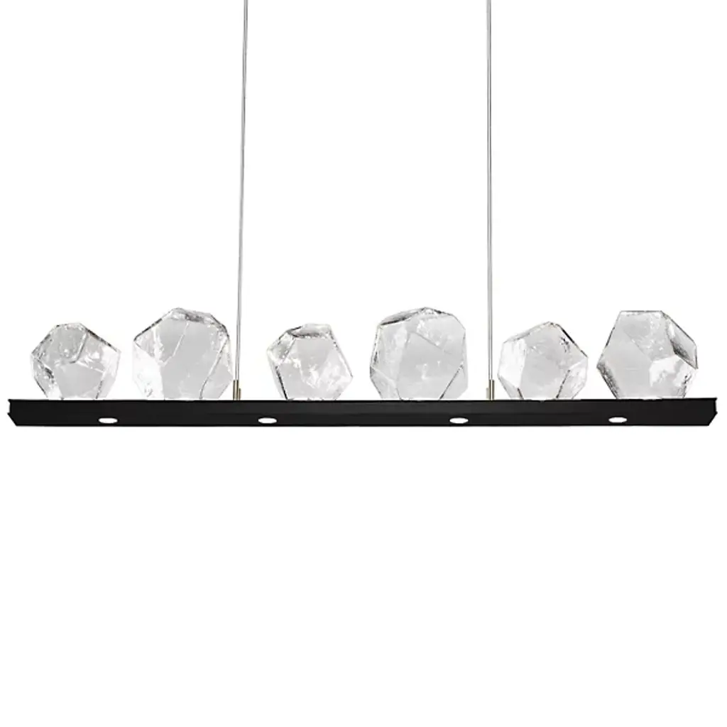 A showstopper of blown glass. The Gem Bezel LED Linear Suspension from Hammerton Studio marks a path with light-filled forms inspired by semi-precious stones. The piece creates a zen-like quality over dining tables through a minimalist rectangular housing made in sharp metal. A rocky formation of blown glass develops atop the housing, creating multi-faceted figures that stand out from the architecture of any room. A soft beam of light accentuates the organic contours of the forms with subtle yet defining highlights.