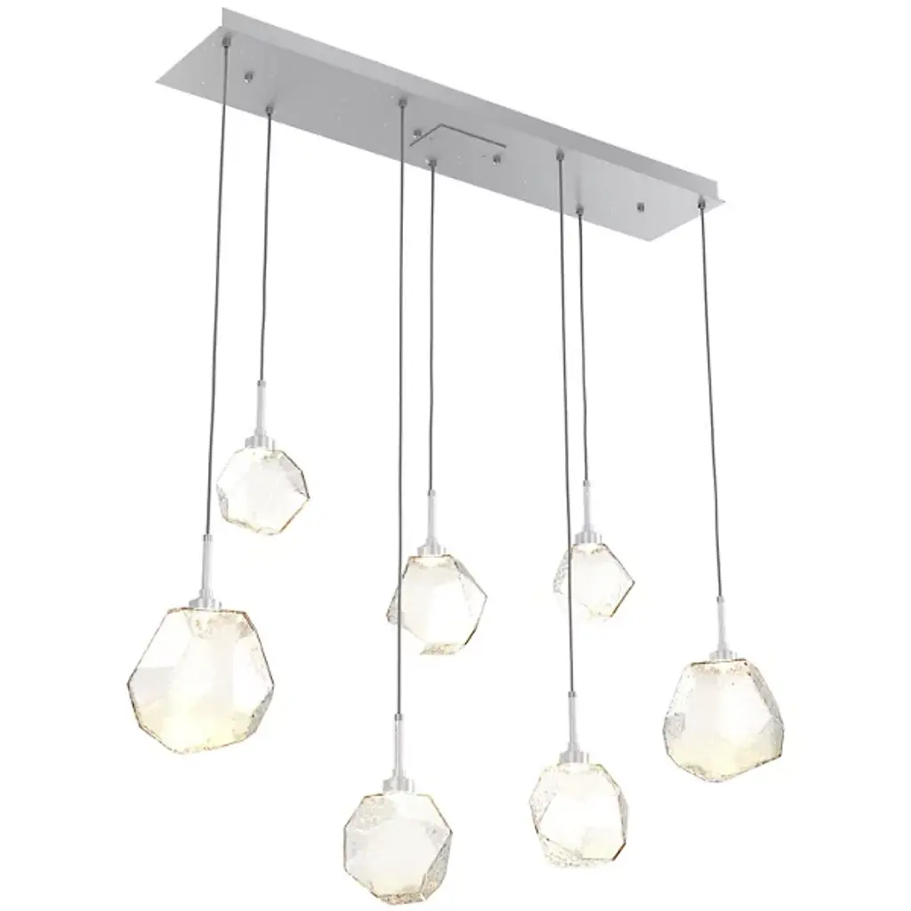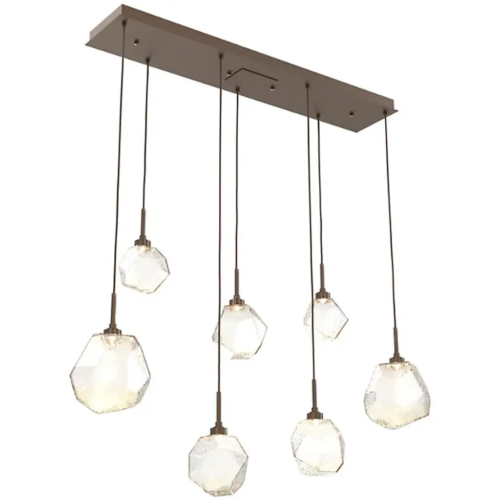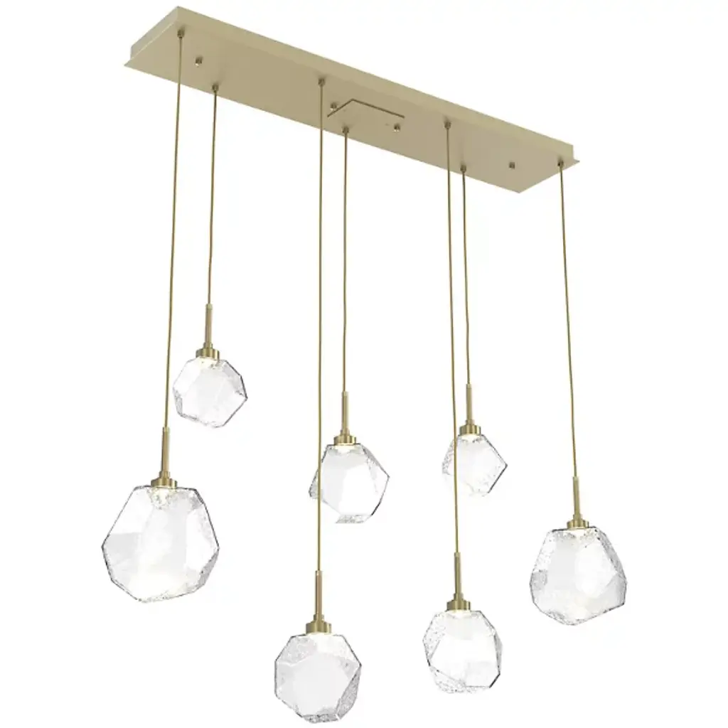 Adorn your home or business with the illustrious Gem Waterfall Linear Suspension by Hammerton Studio. Handcrafted in America by skilled artisans, this piece adopts the appearance of hanging gemstones with its coarsely cut, blown glass shades. Each shade is held in place by a finished metal socket holder which contains an integrated LED light that shines through the glass for a dynamic, ambient effect.