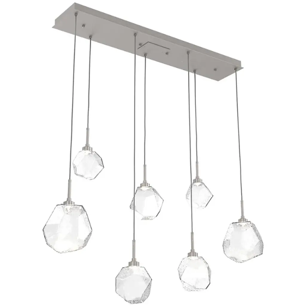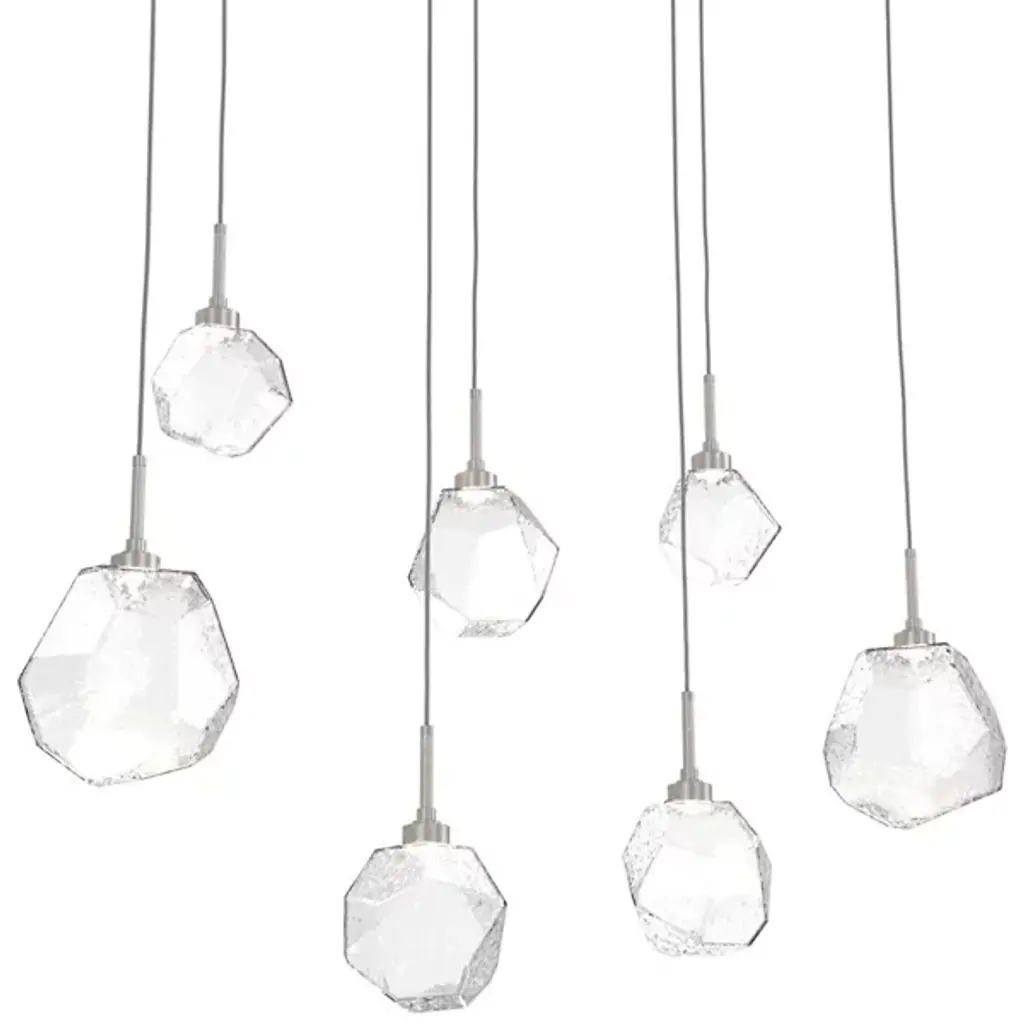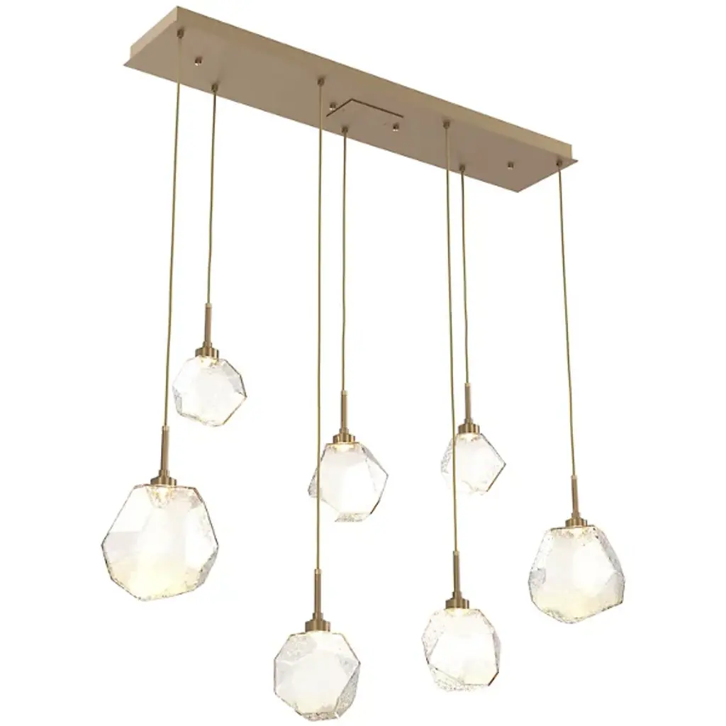Adorn your home or business with the illustrious Gem Waterfall Linear Suspension by Hammerton Studio. Handcrafted in America by skilled artisans, this piece adopts the appearance of hanging gemstones with its coarsely cut, blown glass shades. Each shade is held in place by a finished metal socket holder which contains an integrated LED light that shines through the glass for a dynamic, ambient effect.