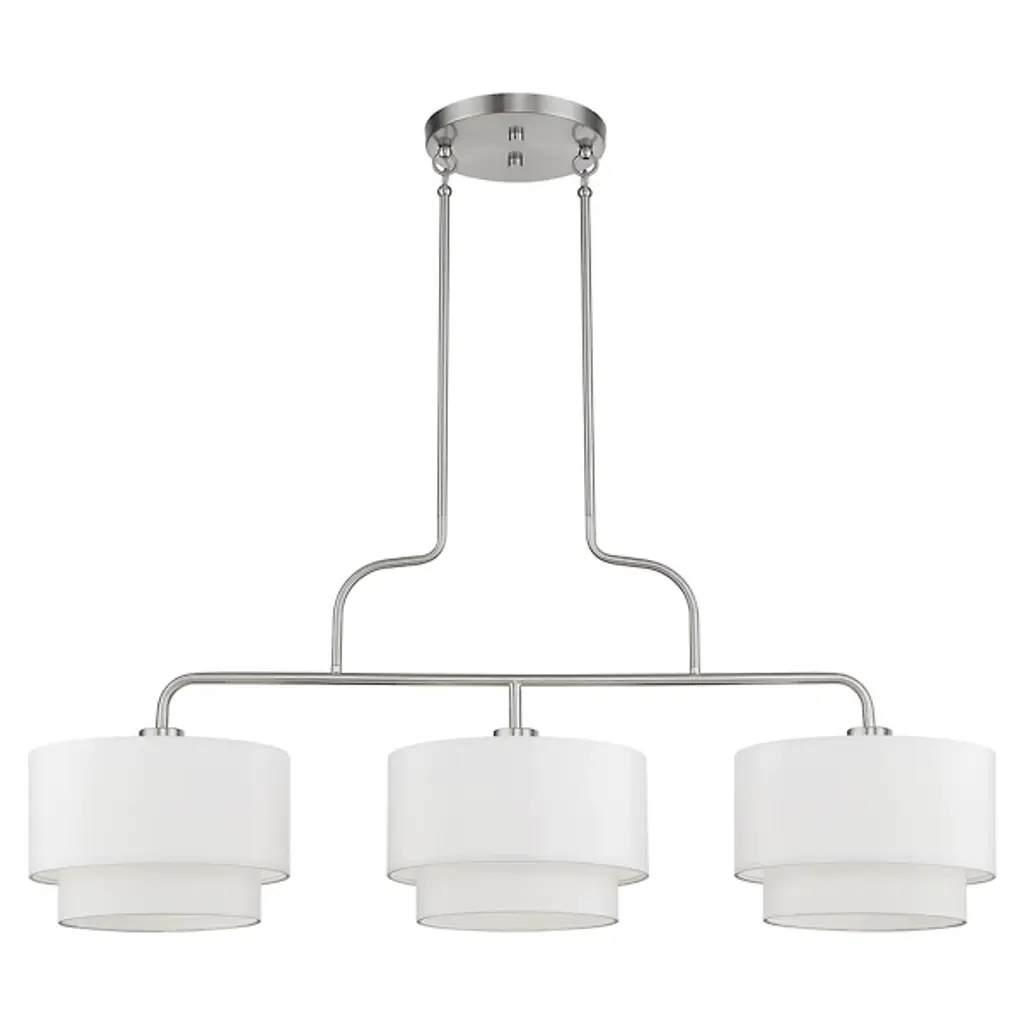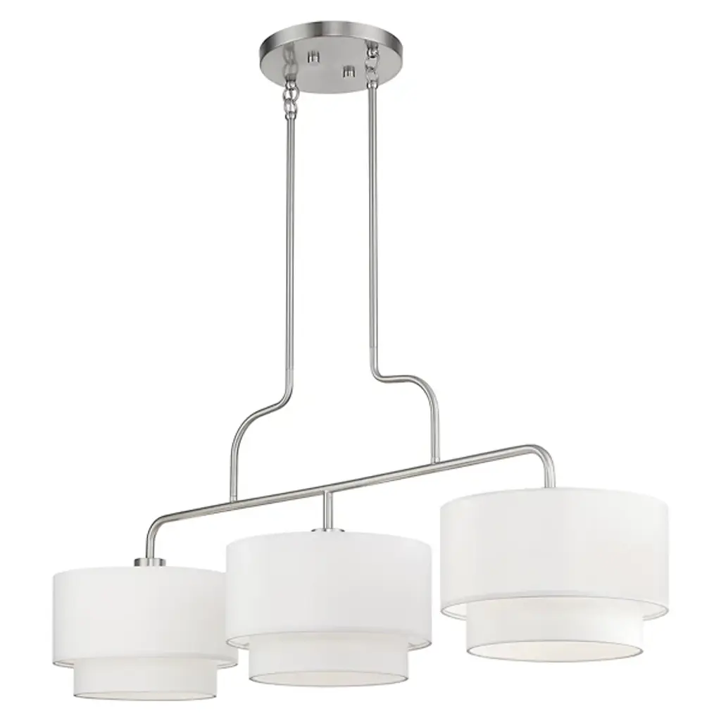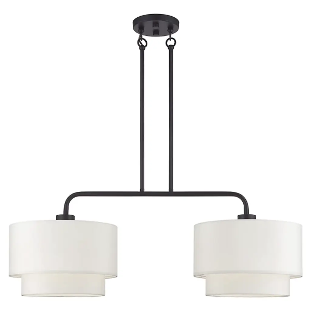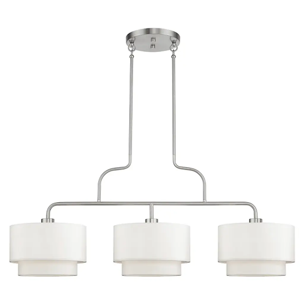 The Geraldine Large Linear Suspension from Alder & Ore adds a sophisticated flair to any room with its large spread and handcrafted off-white fabric shades, each elegantly designed in a layered circular pattern. The soft, diffused light enhances the minimalist steel framework, which descends gracefully from a compact central canopy. Slender steel stems anchor evenly spaced lamping beneath each set of shades, creating a striking visual effect that enriches open spaces with its subtle sculptural presence. Built for durability and damp-rated, this fixture combines reliability with a refined design.
