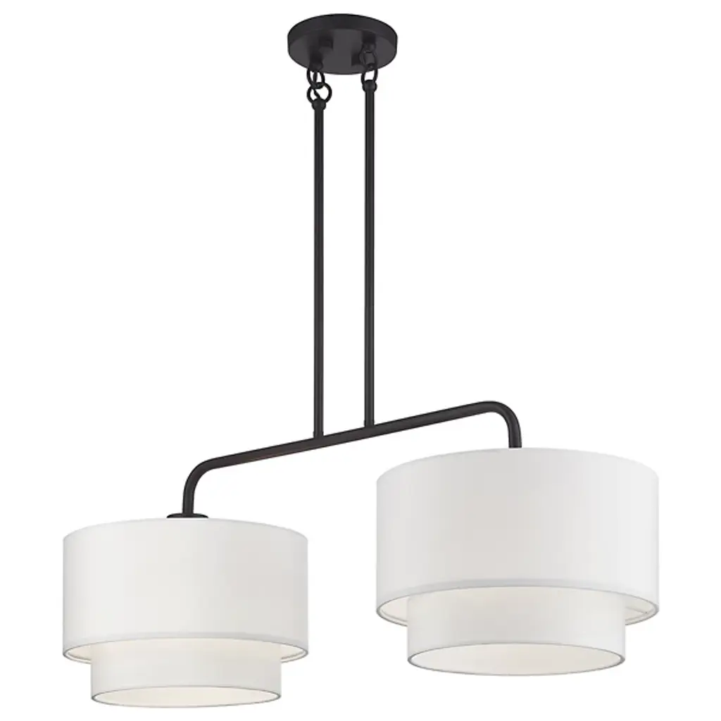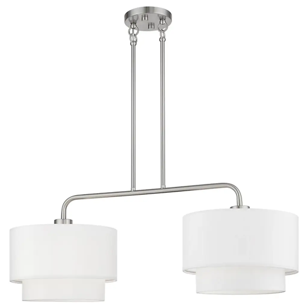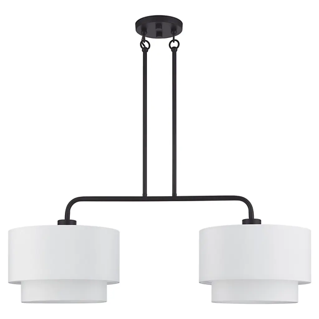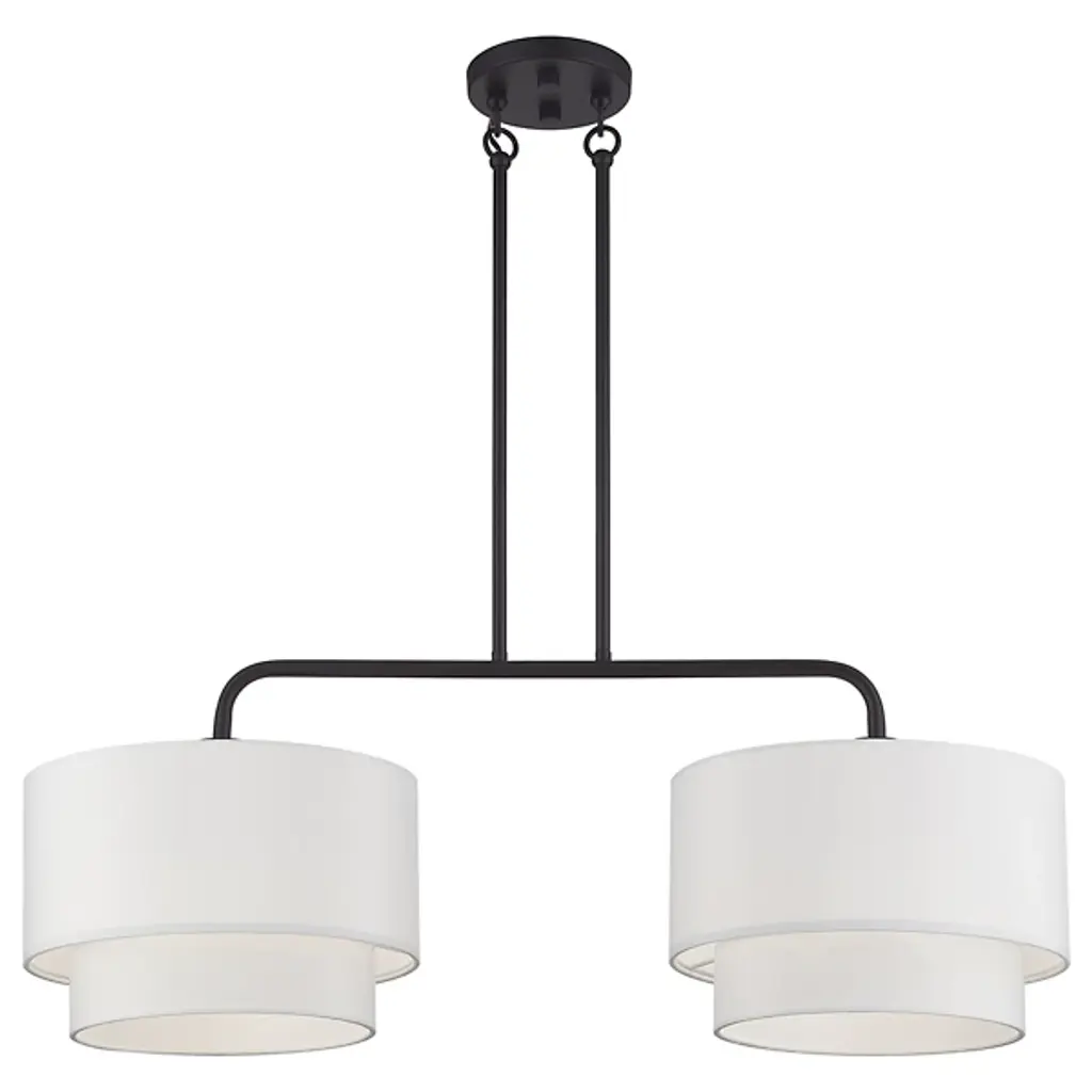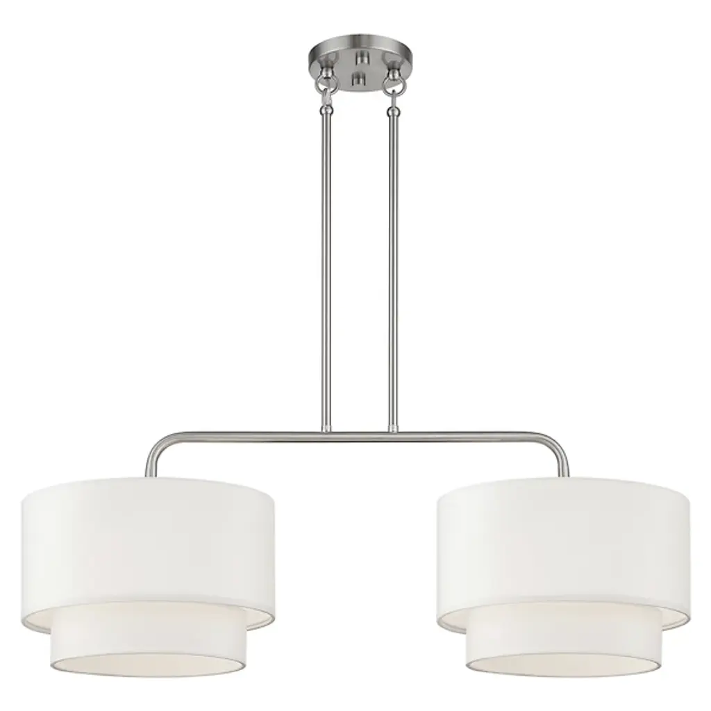 The Geraldine Large Linear Suspension from Alder & Ore adds a sophisticated flair to any room with its large spread and handcrafted off-white fabric shades, each elegantly designed in a layered circular pattern. The soft, diffused light enhances the minimalist steel framework, which descends gracefully from a compact central canopy. Slender steel stems anchor evenly spaced lamping beneath each set of shades, creating a striking visual effect that enriches open spaces with its subtle sculptural presence. Built for durability and damp-rated, this fixture combines reliability with a refined design.