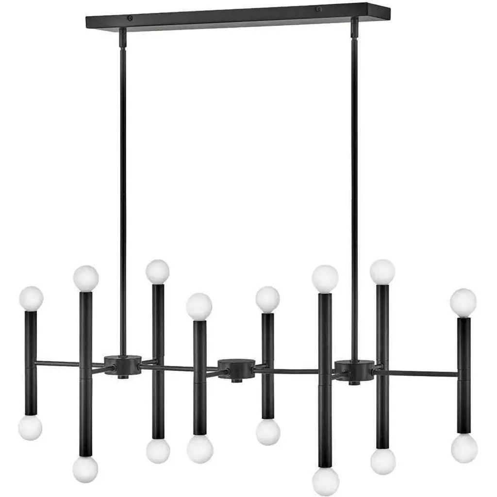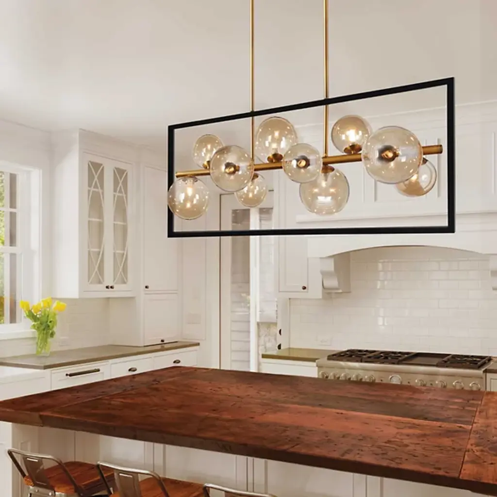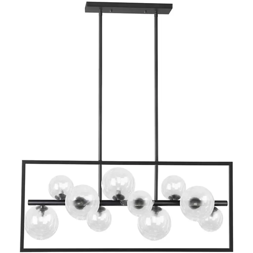 A lively addition to any space, the Glasgow Rectangular Linear Suspension by Dainolite is a playful yet refined piece. A rectangular ceiling mount drops two downrods to a horizontal beam. A series of globe-shaped glass shades in alternating sizes adorn the piece, each one containing an incandescent bulb that emits a warm, encompassing glow. An open rectangular frame surrounds the length of the fixture, adding sharpness to its rounded glass design.