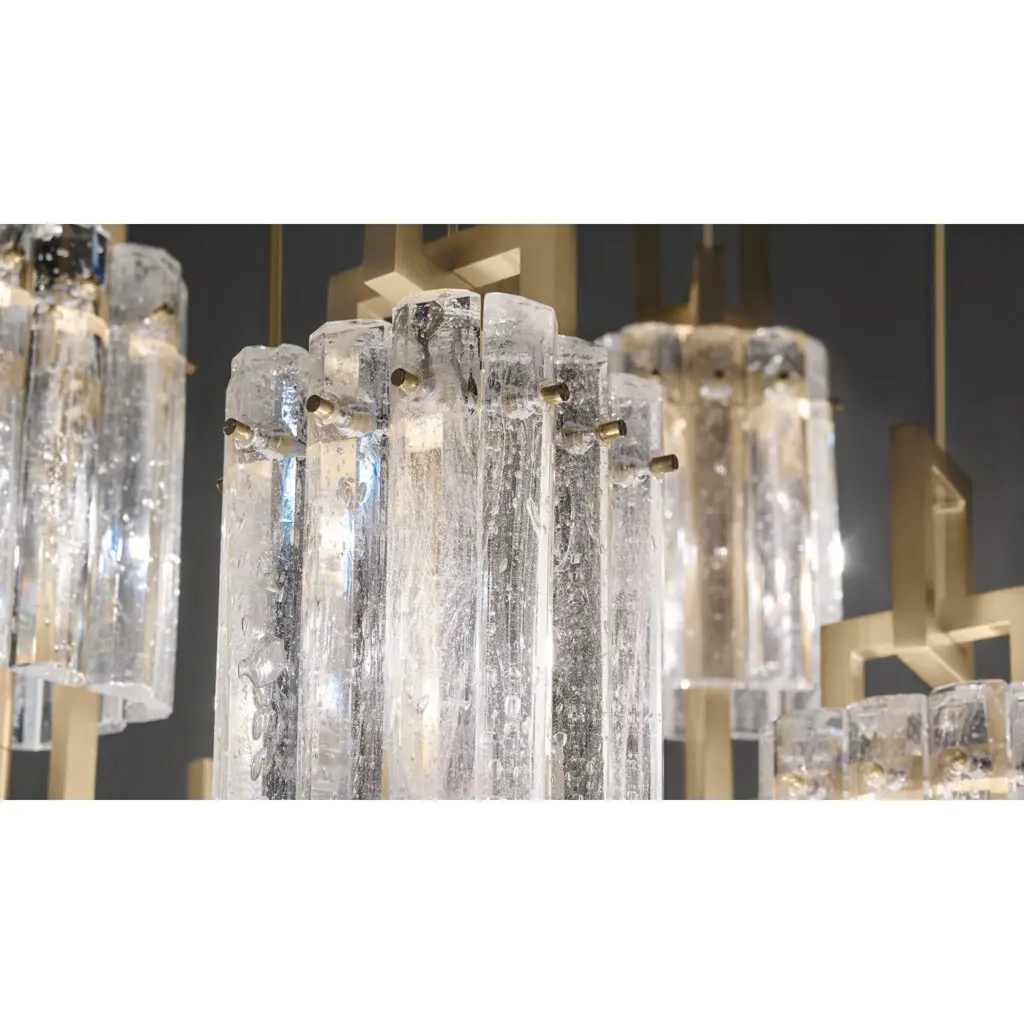 Indulge in the luxurious, Venetian craftsmanship of the Glass Strips 5-Light Hanging Lamp by Masiero Crek. With its geometric shape and rock crystal effect glass, this lamp resembles a stunning ice sculpture that will enhance any space with a warm and safe ambiance, like an igloo. Elevate your home with this exclusive piece of art.