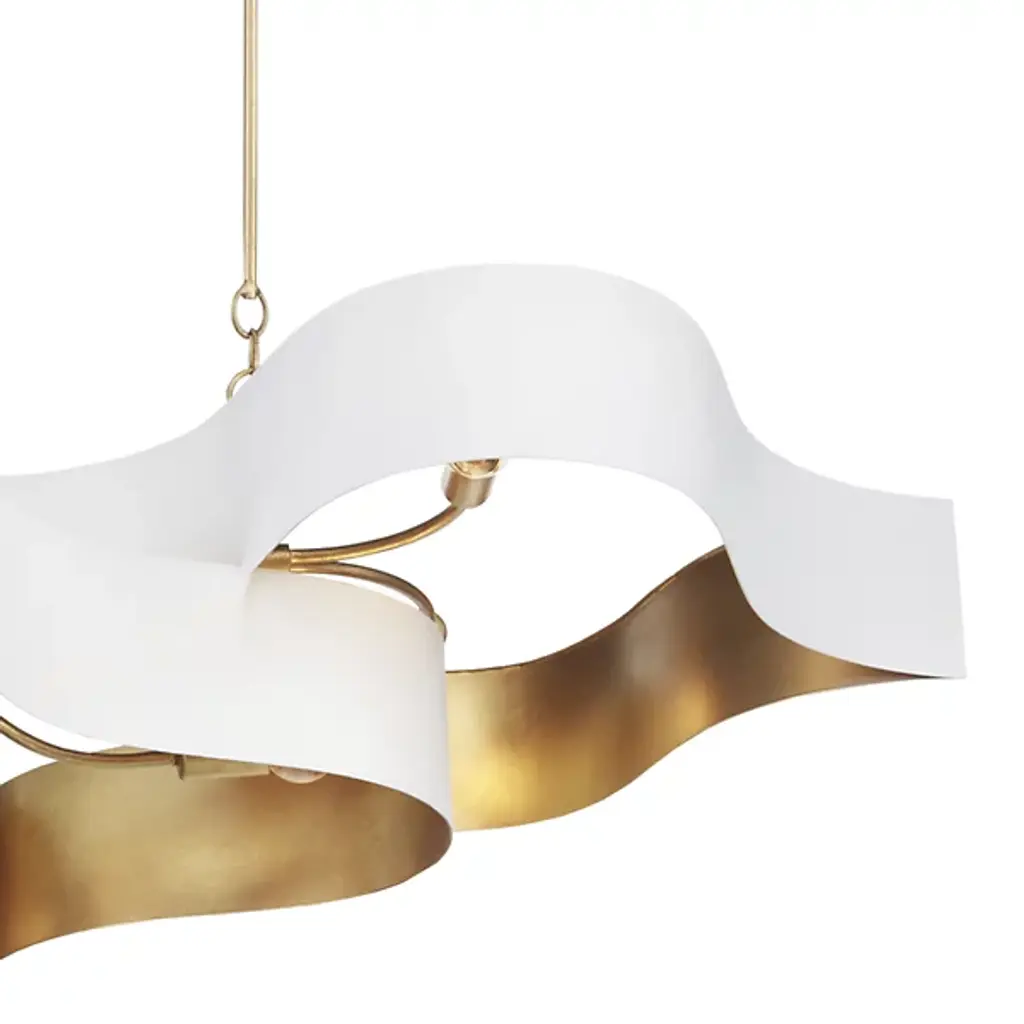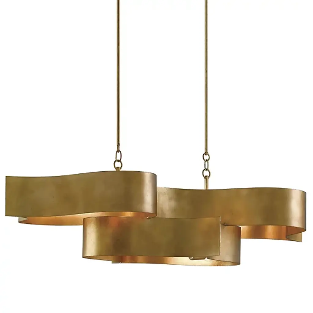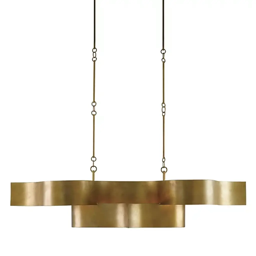 Like the petals of a Lotus flower, the Grand Lotus Linear Suspension by Currey & Company exudes beauty with its flowing form and vibrant color. This illustrious fixture is composed of hand-forged Wrought Iron strips (finished in Antique Gold Leaf) that are shaped into graceful, undulating waves. Each opening contains horizontally oriented lamping, allowing the light sources to remain hidden as they reflect off the surrounding gold and fill the area with a warm, encompassing light