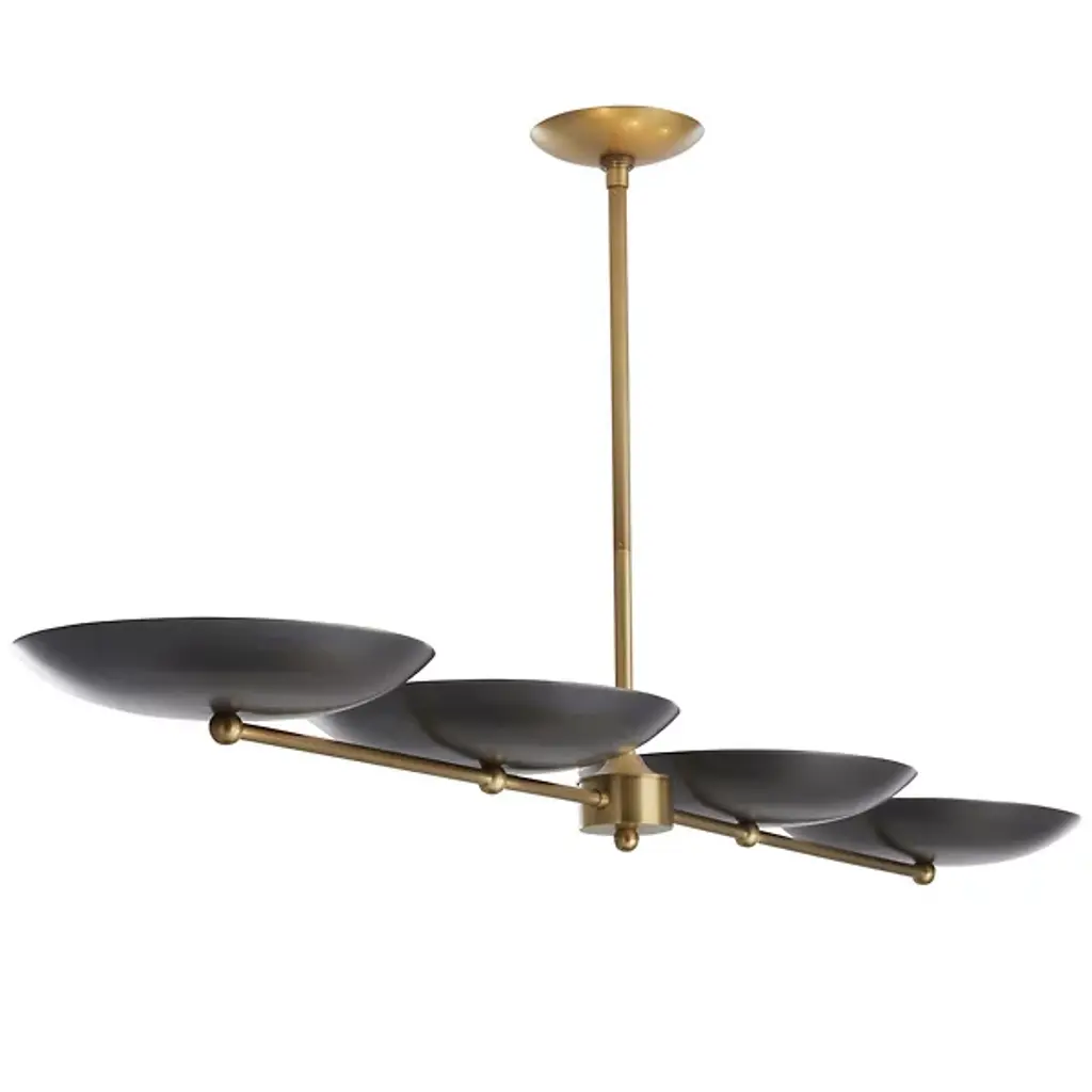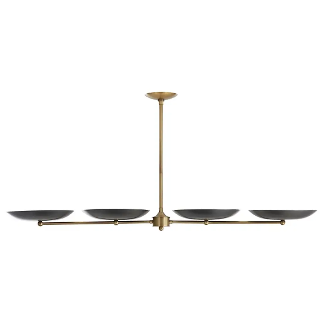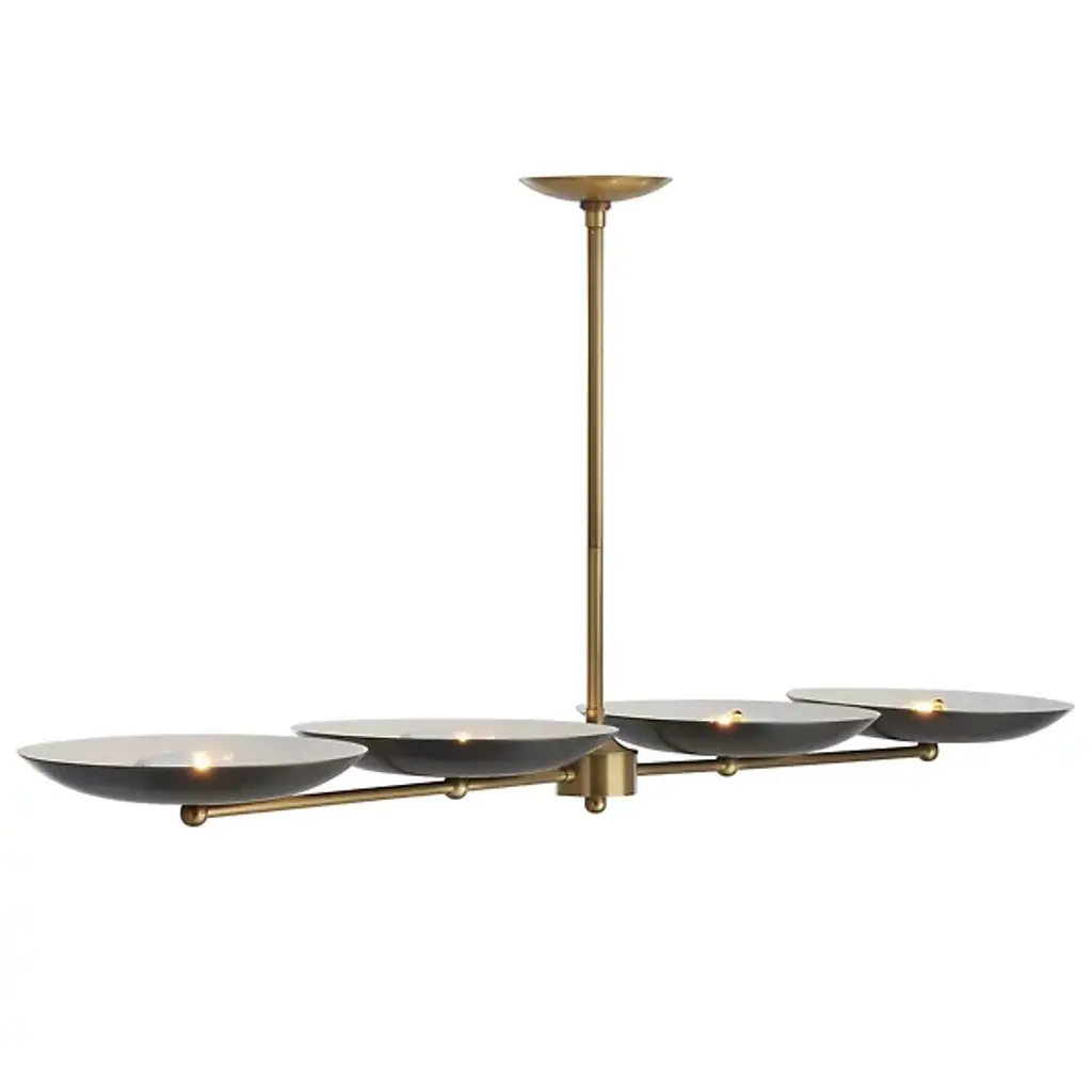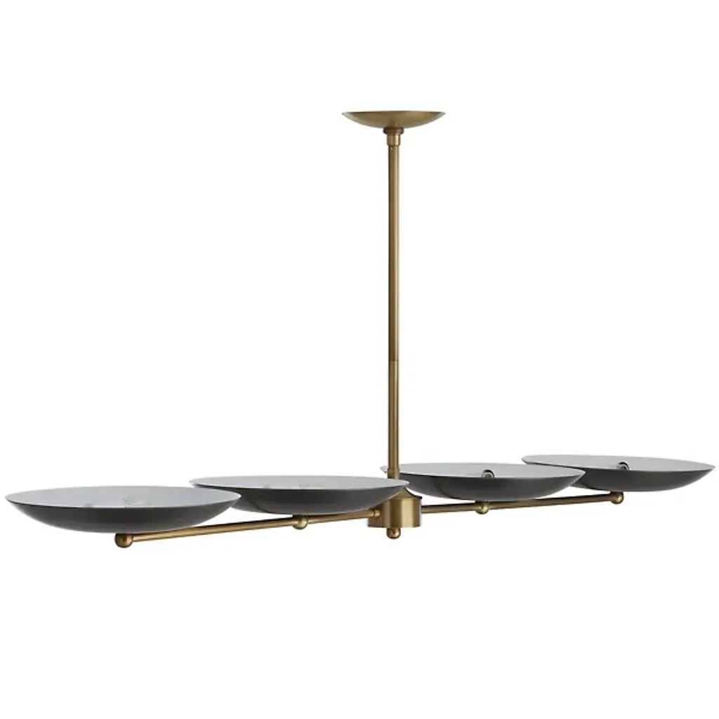 The Griffith Linear Suspension from Arteriors complements the open, comfortable feeling of your gathering spaces with a sleek, streamlined design. This clean-cut piece carries a retro-modern personality. Its slender downrod suspension and compact canopy lets the piece mount to the ceiling with ease. The metal crossbar extends towards the corners of your table surfaces, making it great over the kitchen, island, coffee table, or dining table. Low-profile dome shades face the light opposite the viewer to eliminate glare, produce a graphic silhouette, and send up a room-filling glow.