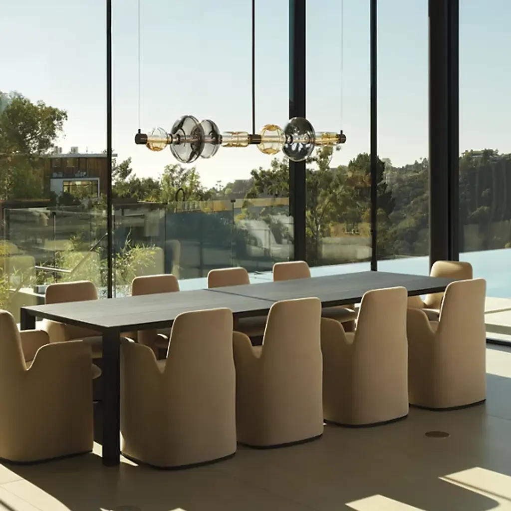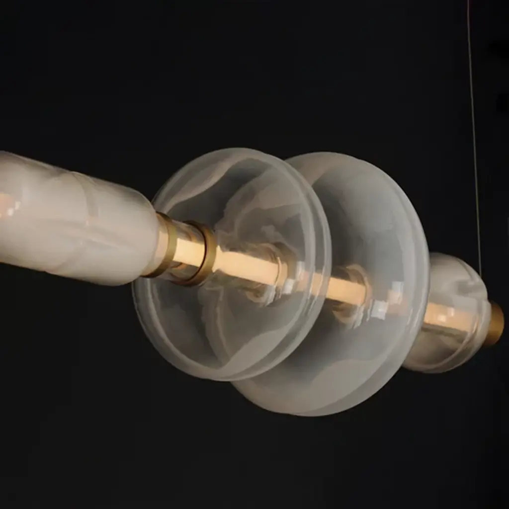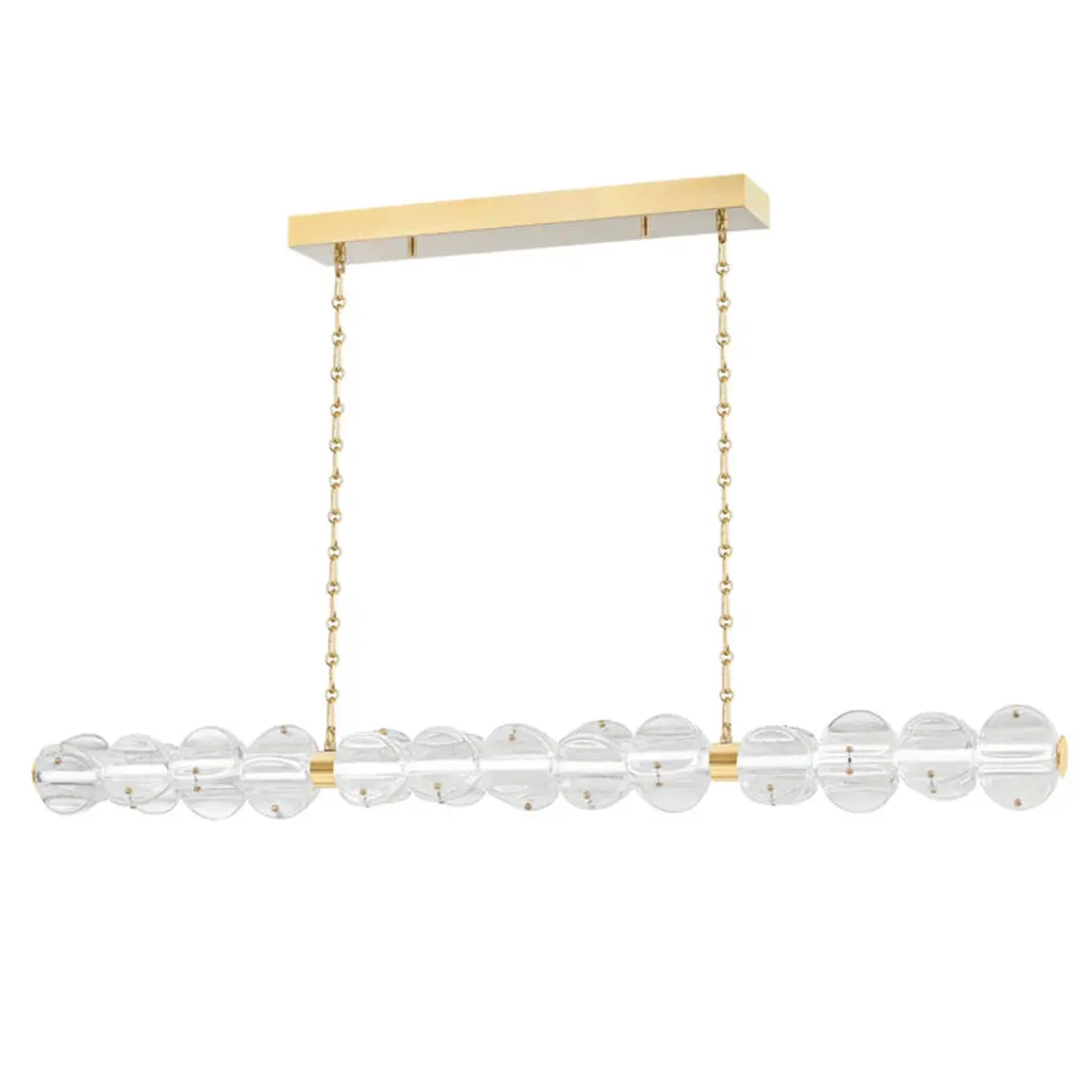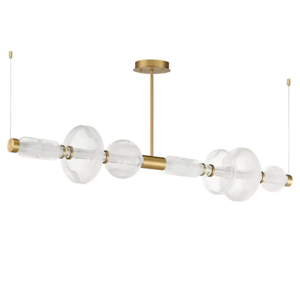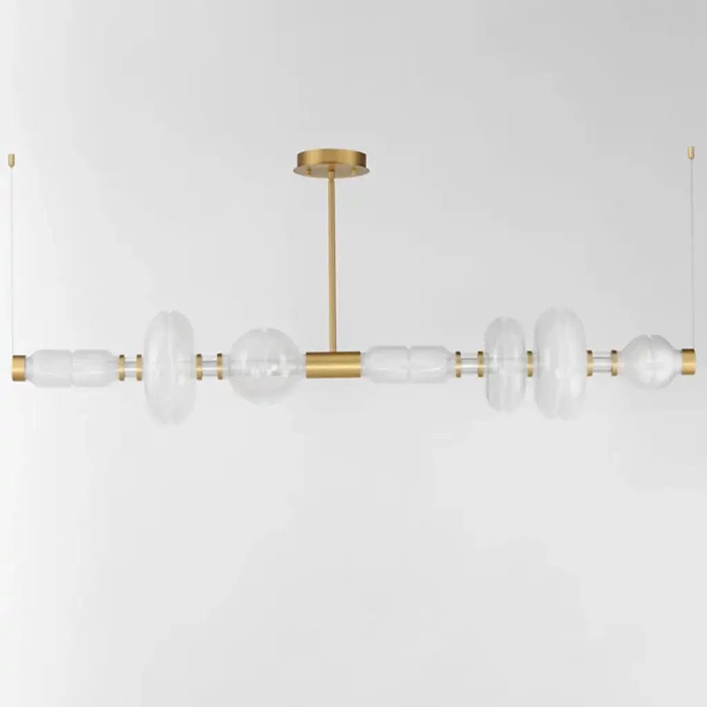 Introduce contemporary allure to your space with the Gusto LED Linear Suspension from Studio M. Crafted by visionary designer Cesar Giraldo, this avant-garde fixture features artisanal hand-blown glass elements. Adorned with hand-crafted dimples, each glass refracts dedicated LED lighting, casting a mesmerizing play of light along its undulating silhouette. Encased in clear glass, these ethereal compositions seem to float, diffusing a gentle glow that enhances the ambiance of any room with sophistication and charm.
