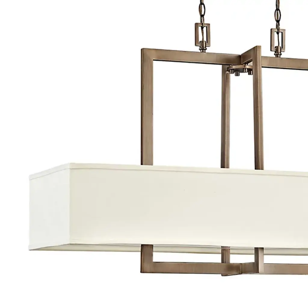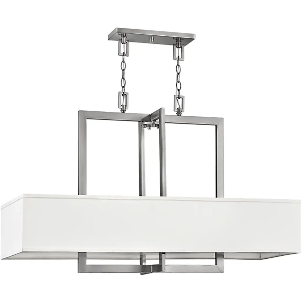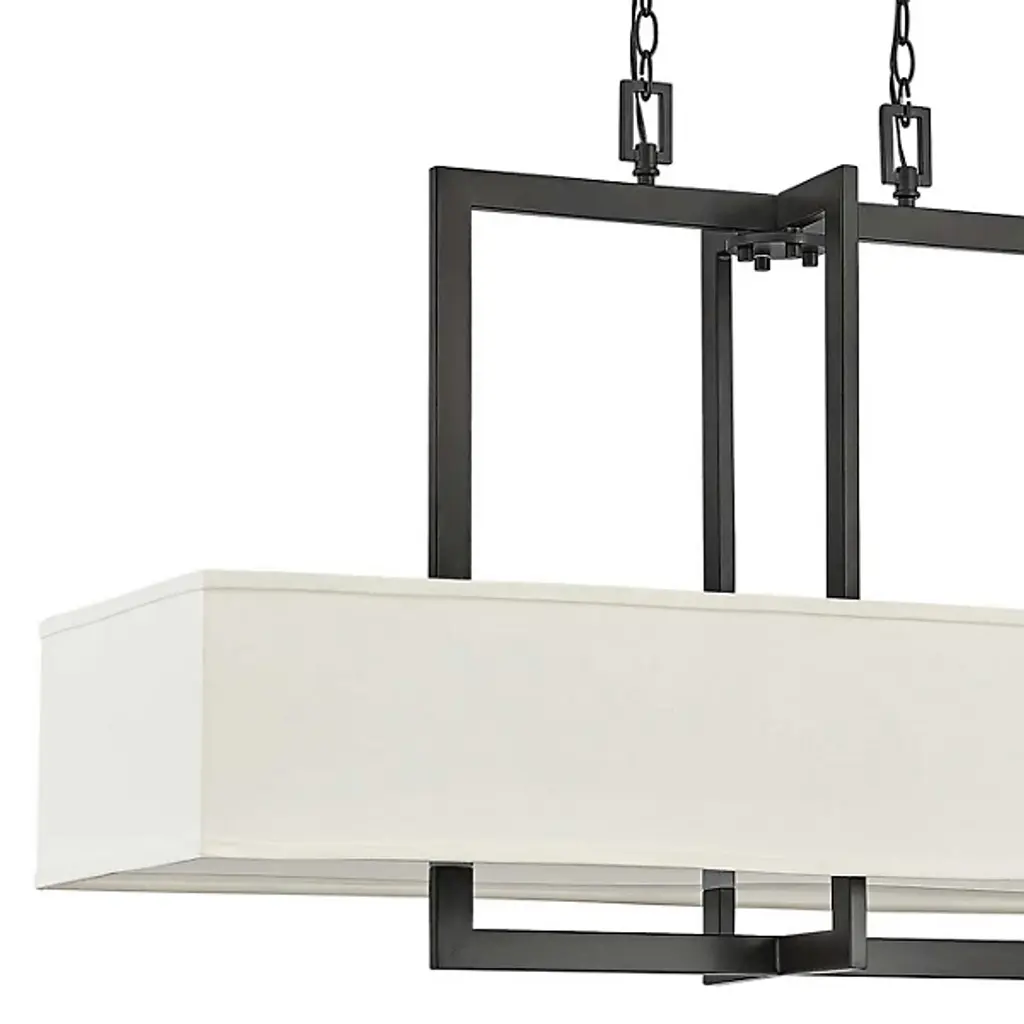 Hinkley’s Hampton Linear Suspension provides interior living spaces with warm, ambient lighting while sporting a form factor that enables it to act as a focal point in its environment. The Hampton utilizes a transitional framework crafted entirely from steel for durability while an off-white linen hardback shade enables the internal incandescent lamping. These factors allow the piece to radiate a soft and diffused lighting experience. Lighting is further aided by a decorative acrylic etched bottom lens.