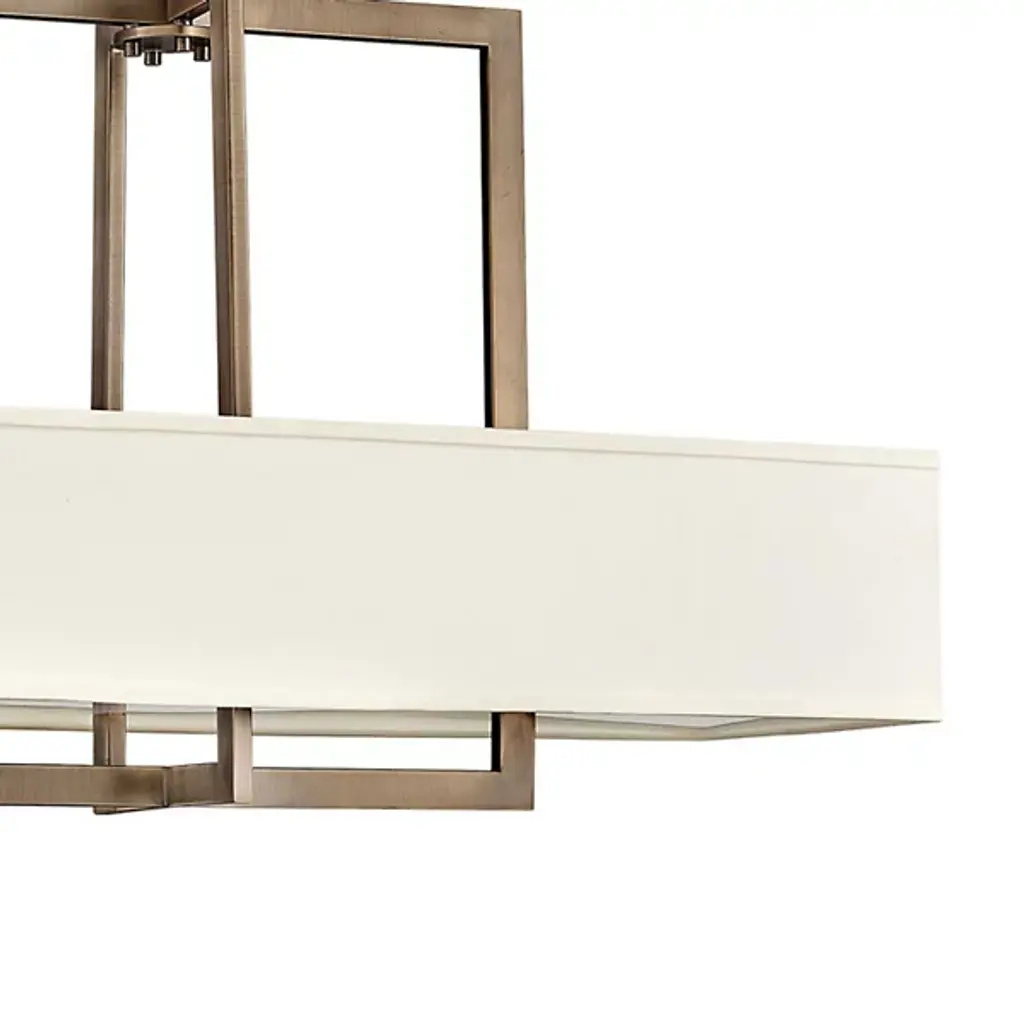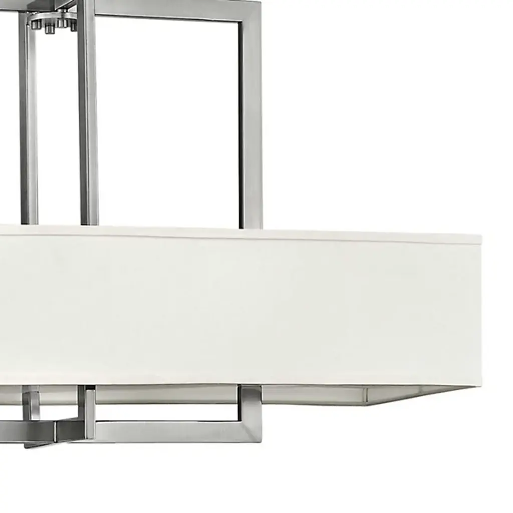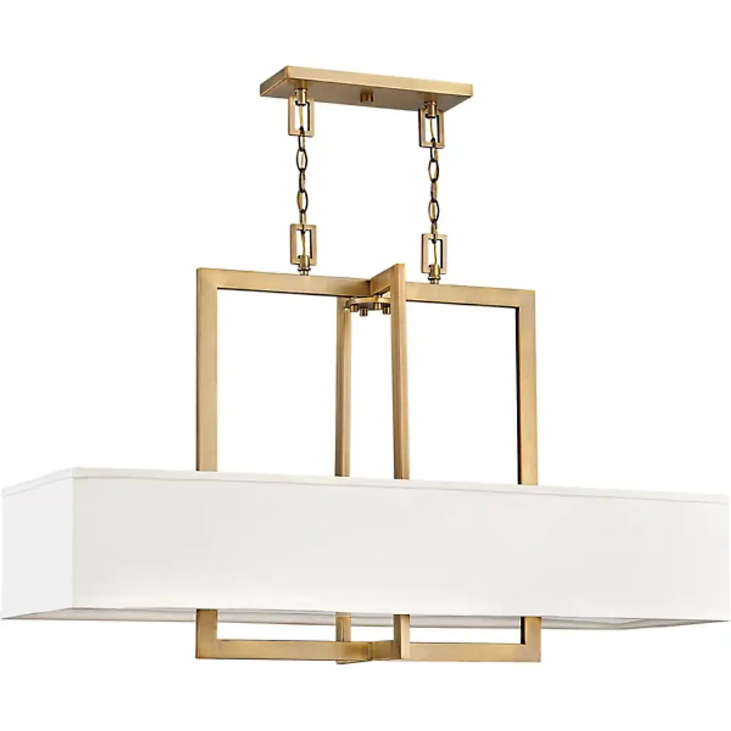 Hinkley’s Hampton Linear Suspension provides interior living spaces with warm, ambient lighting while sporting a form factor that enables it to act as a focal point in its environment. The Hampton utilizes a transitional framework crafted entirely from steel for durability while an off-white linen hardback shade enables the internal incandescent lamping. These factors allow the piece to radiate a soft and diffused lighting experience. Lighting is further aided by a decorative acrylic etched bottom lens.